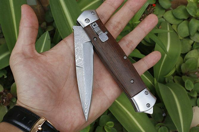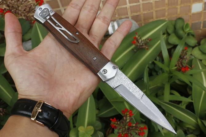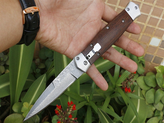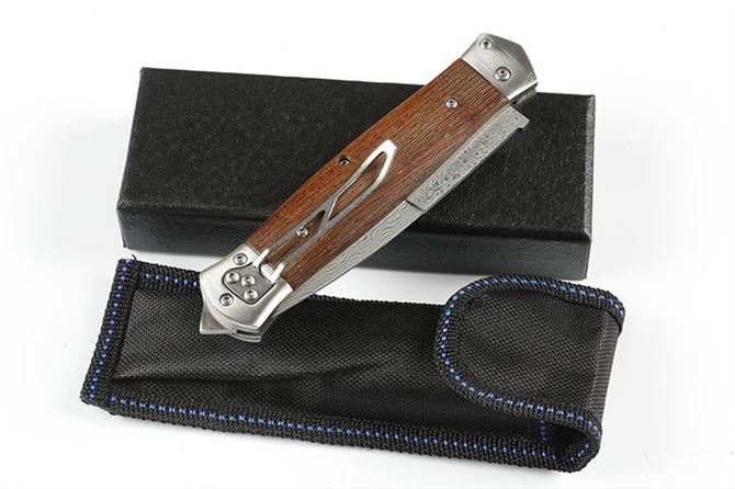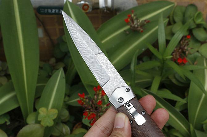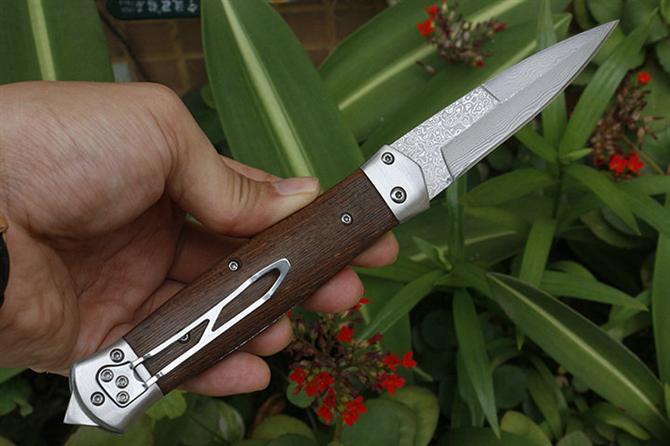 大马士革F125横出跳刀 品牌:自由狼 全长:22.8cm 刃长:9.3cm 柄长:13.5cm 刃宽:2.1cm 刃厚:2.9mm 刃材:VG10大马士革钢 重量:185g(含包装) 硬度:57HRC 表面:大马士革原纹路 柄材:鸡翅木 锁型:弹簧刀 其他:配尼龙套和彩盒+内置撞玻器,可以击穿汽车玻璃