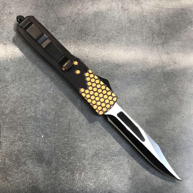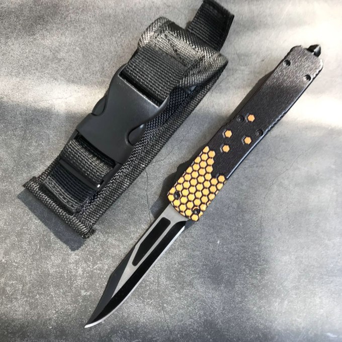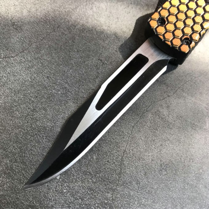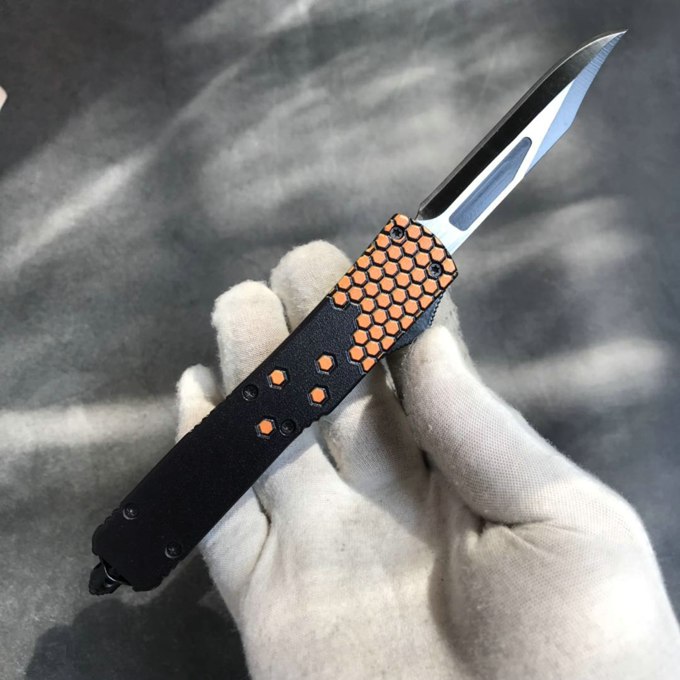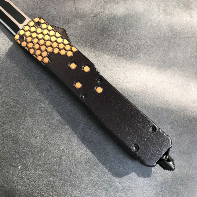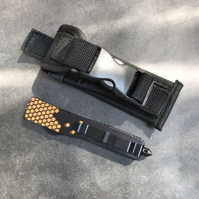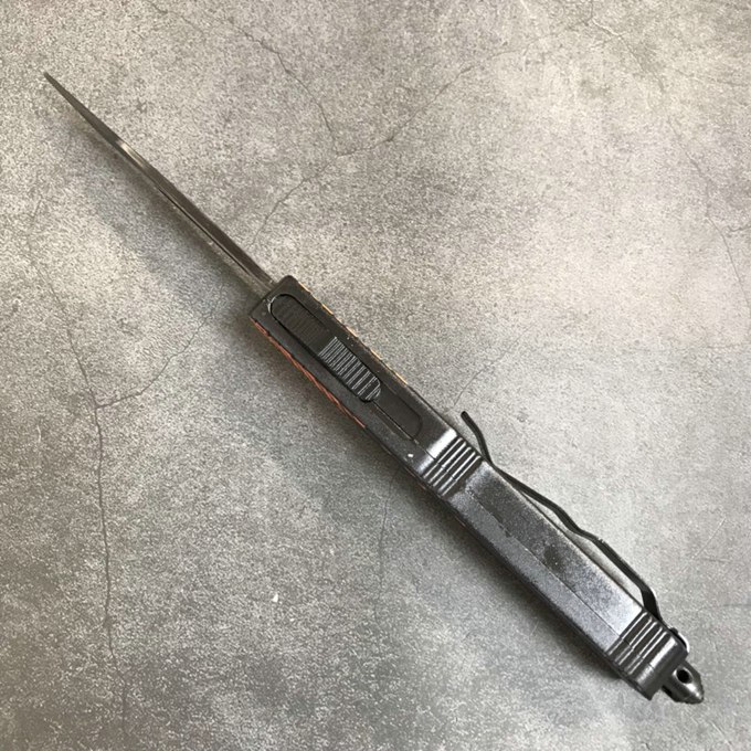 微技术迷你小黄峰直出跳刀 类型:直出弹簧刀 品牌:MICROTECH微技术 开启长度:21.6CM 合起长度:13.CM 刃长:8.5cm 刃厚:0.3CM 硬度:57HRC 刃材:440 表面:刀刃发黑 把手:航空铝合金+砂纸皮 净重:180克(整刀) 毛重:280克(含包装物) 开合:双动作,直推开关,自动弹出和收回(刀头比较牢固,只有很轻微的摇动) 包装:耐磨专用战术尼龙套。 口袋刀夹:弹簧刀夹 玻璃敲击器:钨质玻璃敲击器