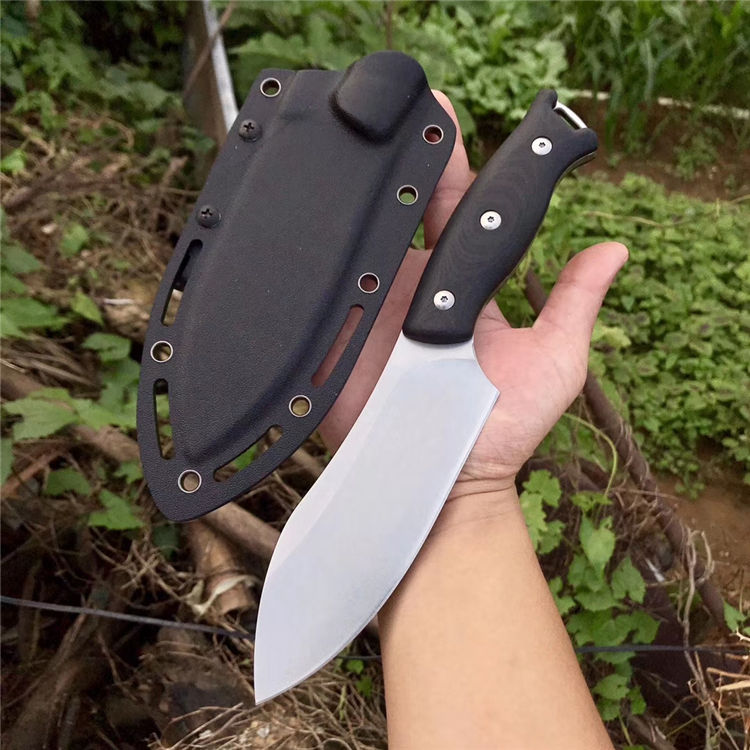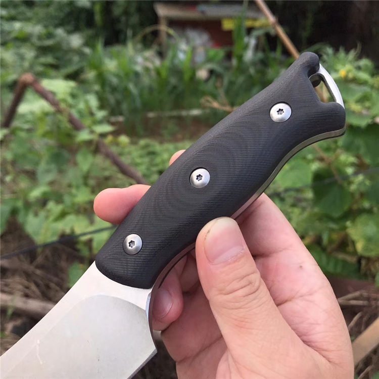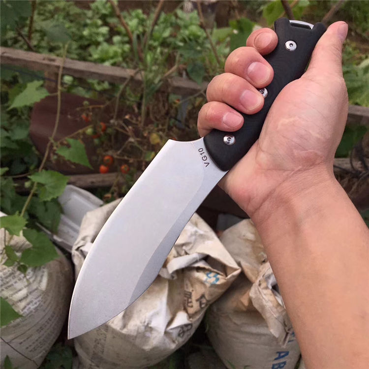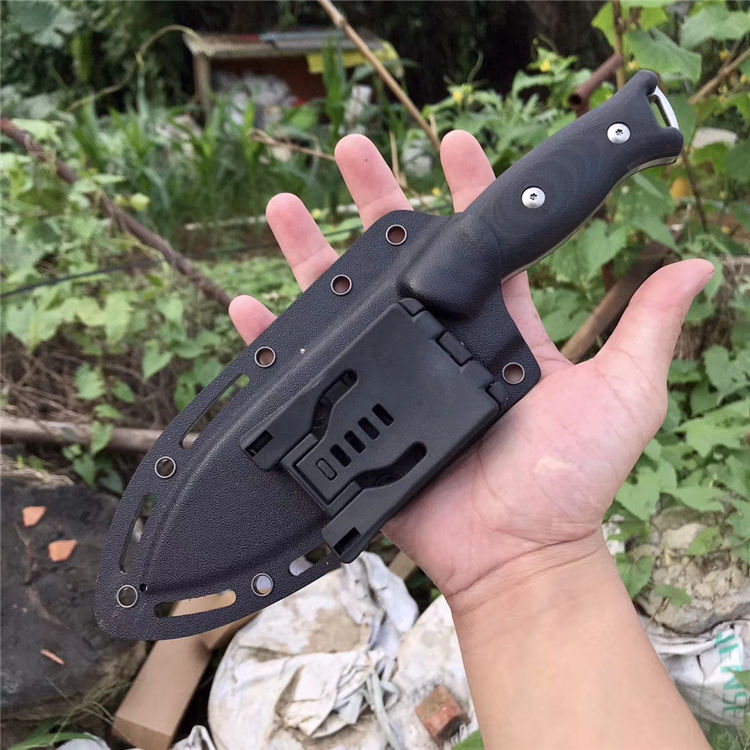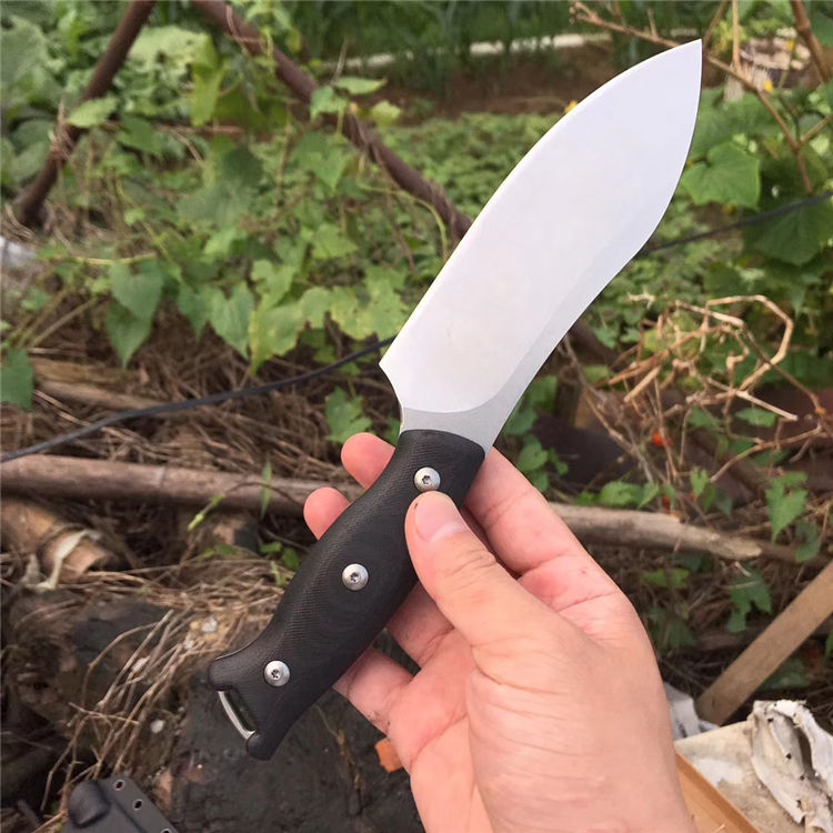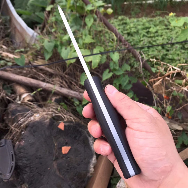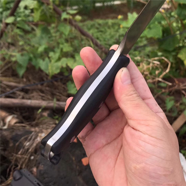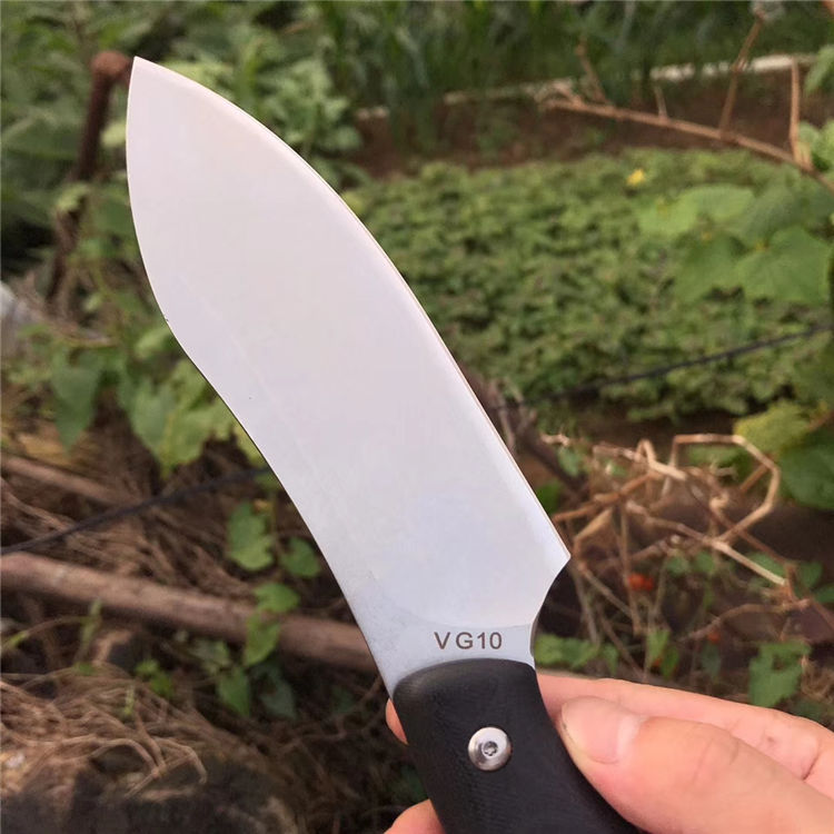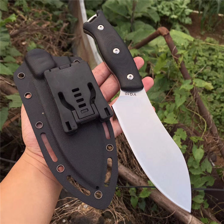茄子户外战术直刀 全长:260mm 柄长:117mm 刃长:140mm 刃厚:5.1mm 钢材:进口VG10 硬度:59-60HRC 柄材:纯黑G10 刃宽:46mm(最宽处) 刀鞘:进口K鞘 表面:精细石洗 重量:400g 热处理:真空油淬(增强晶体颗粒细腻度,具有最好的韧性) 高品质实用、耐操,数控V磨,真空油淬(增强晶体颗粒细腻度,具有最好的韧性)超强性能质量