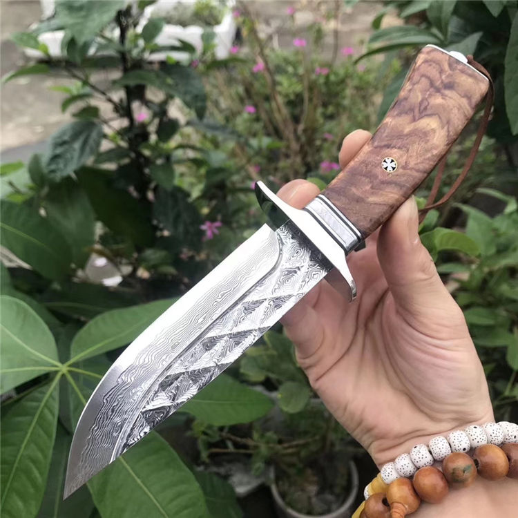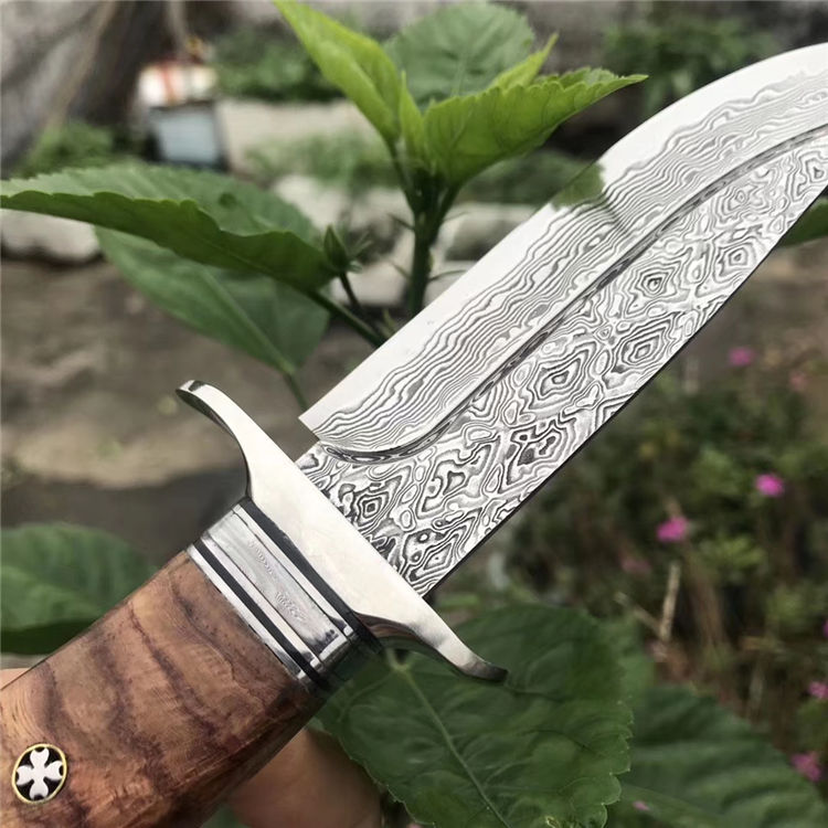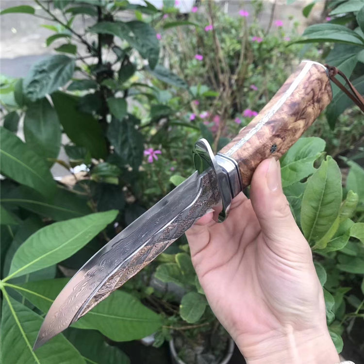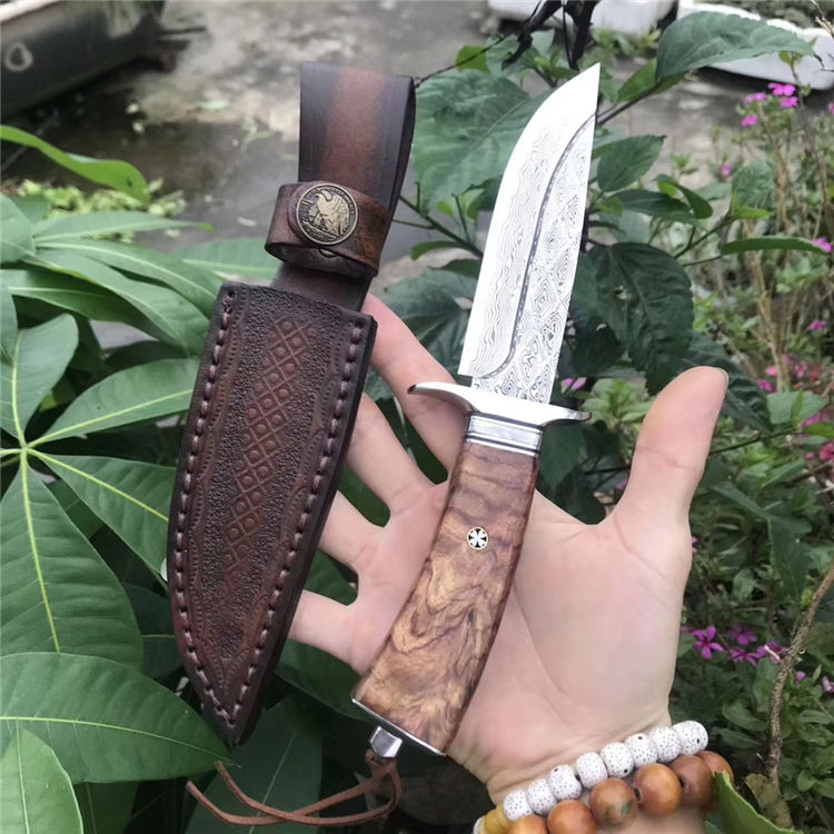 大马士革战神小猛将直刀 全长:23.5cm 刃长:11.8cm 柄长:11.7cm 刃厚:3.8mm 刃宽:3.0cm 刃材:日本进口Vg10大马士革钢 手柄:美国进口名贵疤花瘤木镶嵌无芯层大马士革钢 硬度:60HRC 重量:约290克(含包装) 配:高级手工真皮套+天地礼品盒
