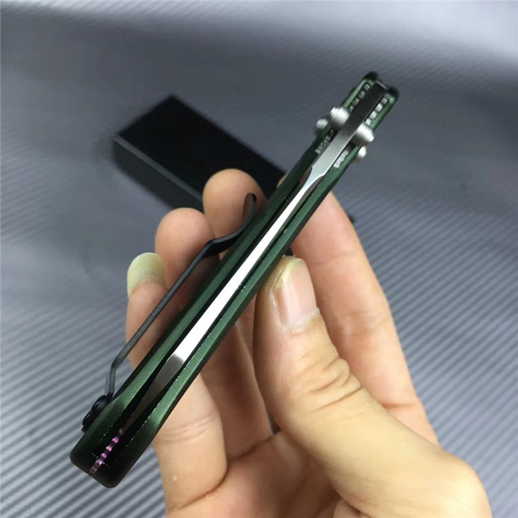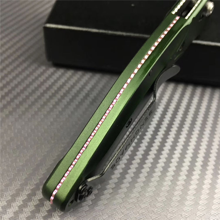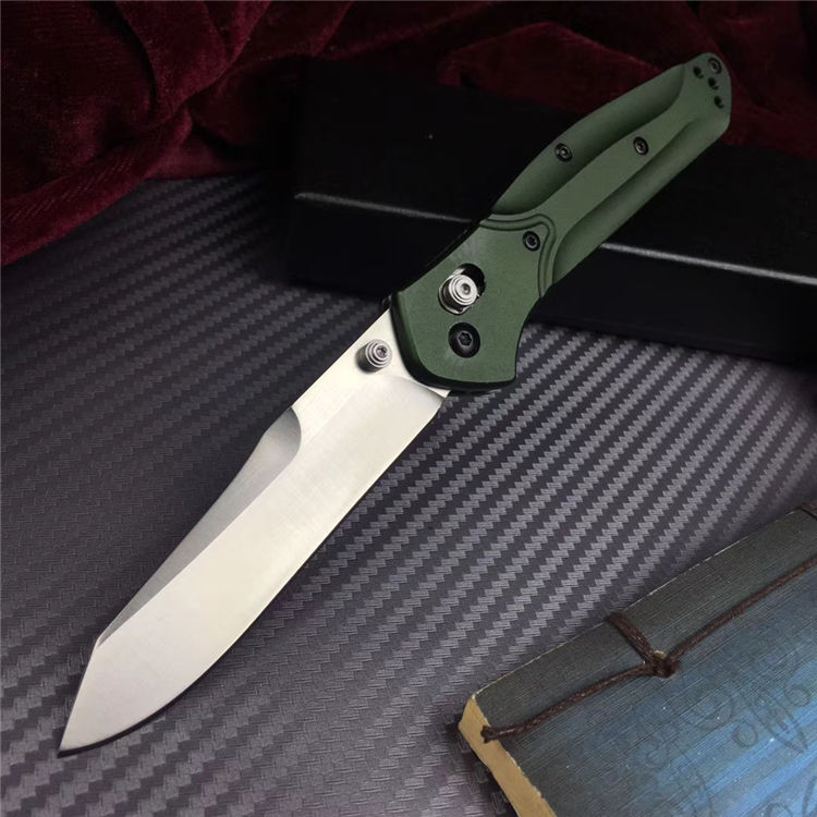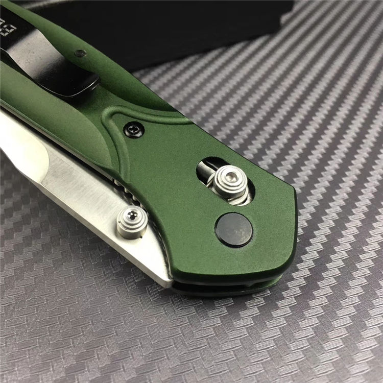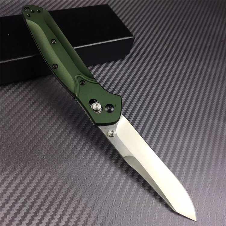 新款绿柄蝴蝶940折刀 类型: 折刀 全长:20cm 刃长:9cm 柄长:11cm 刃厚:3.4mm 刃材: 9cr18 柄材: 铸钢 硬度: 58HRC 重量:180克 表面处理:砂光 锁型: 轴锁
