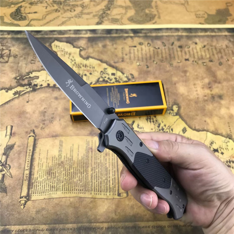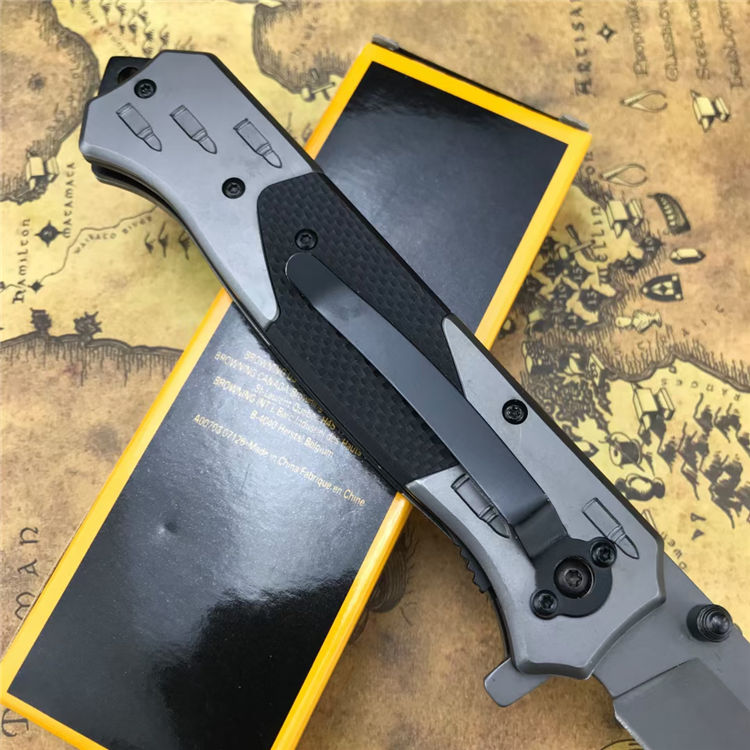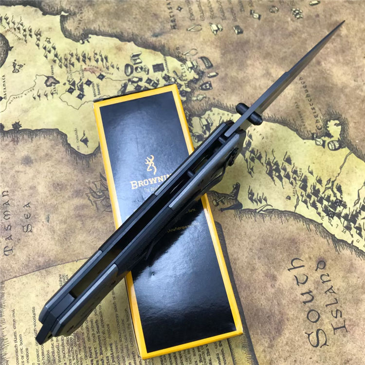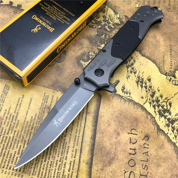 勃朗宁F126快开折刀 总长:23cm 刃长:9cm 柄长:14cm 刃宽:2.5cm(最宽处) 刃厚:2.7mm 刃材:5CR13MOV 硬度:56HRC 刀柄:钢头+黑色G10柄 表面:灰钛 重量:250克含包装配原厂包装