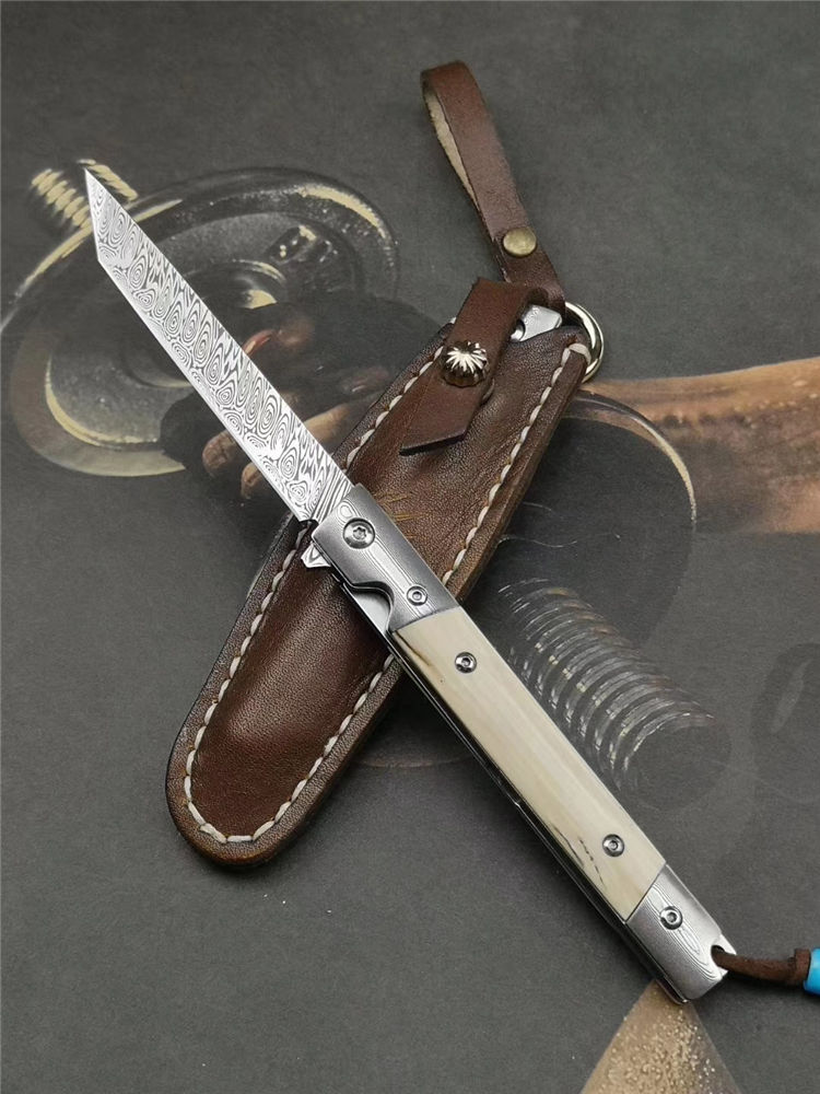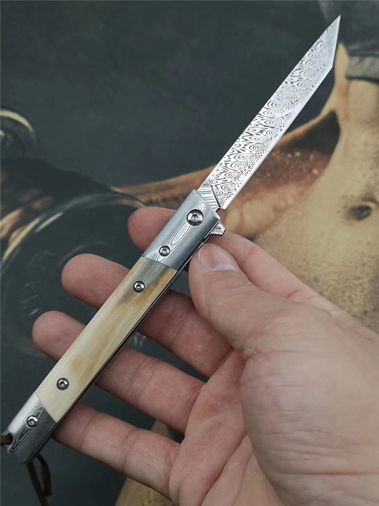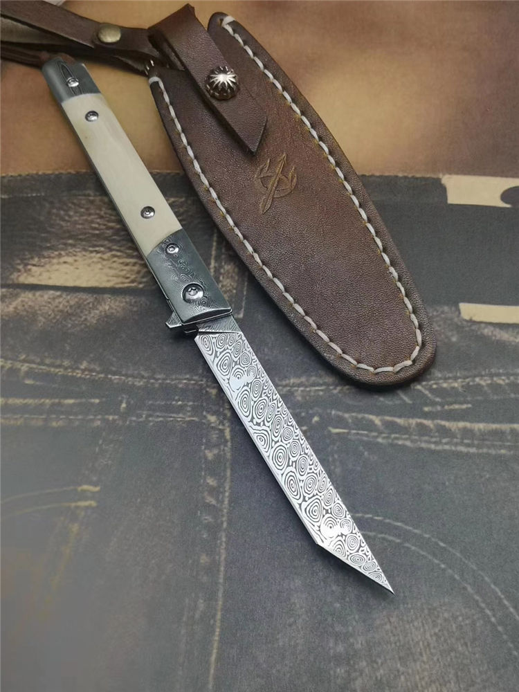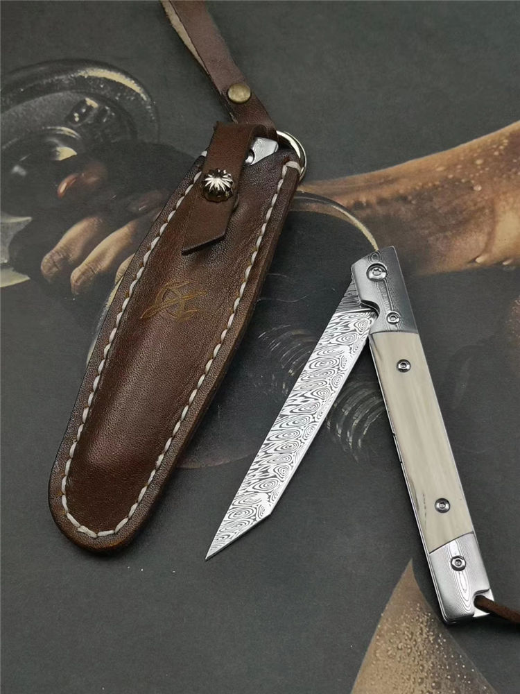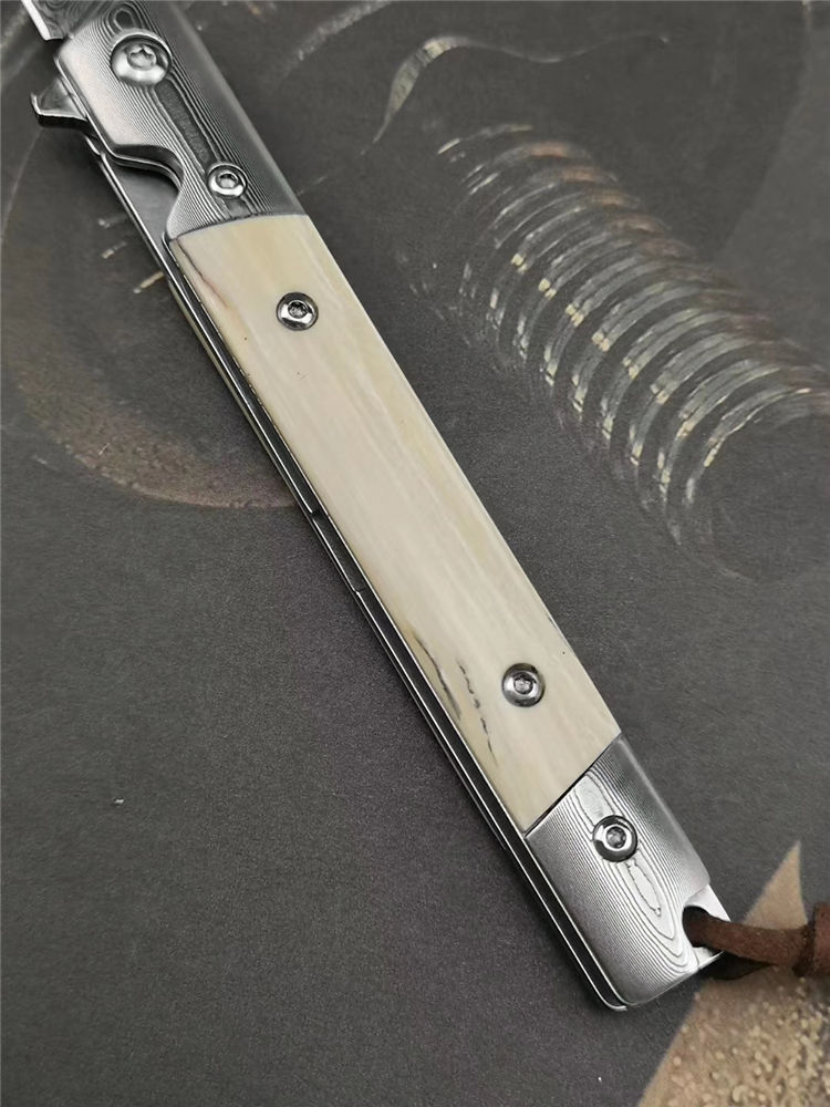 大马士革火焰纹EDC绿洲神笔快开折刀 总长:200mm 刃长:90mm 刃厚:2.6mm 刃宽:13.5mm 柄材:大马士革钢+猛犸象牙 轴承:进口陶瓷滚珠轴承 钢材:火焰纹瑞典粉末大马士革钢 配置:手工缝线头层牛皮刀套