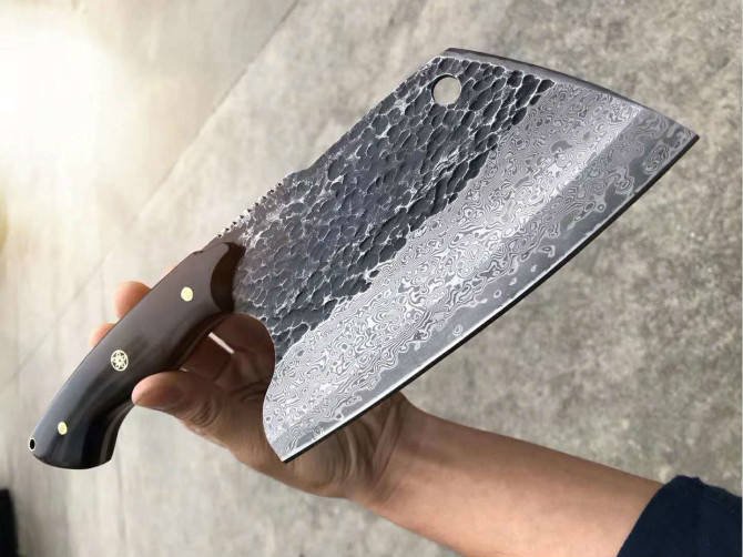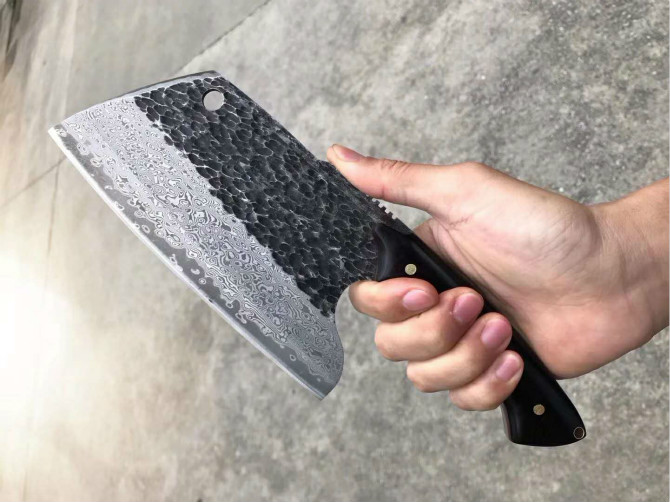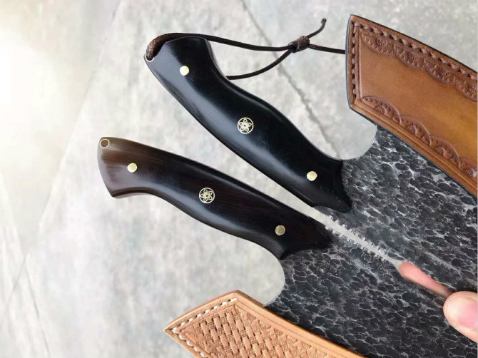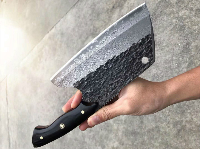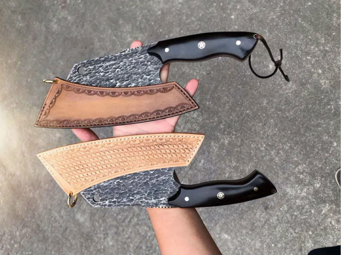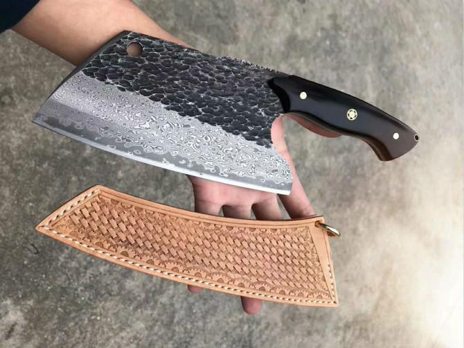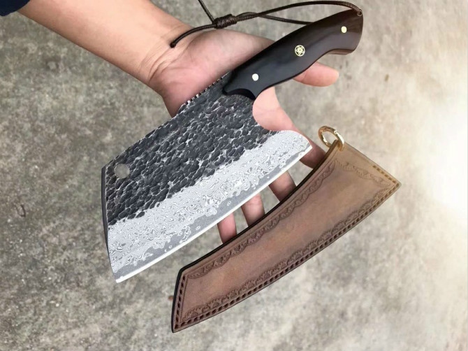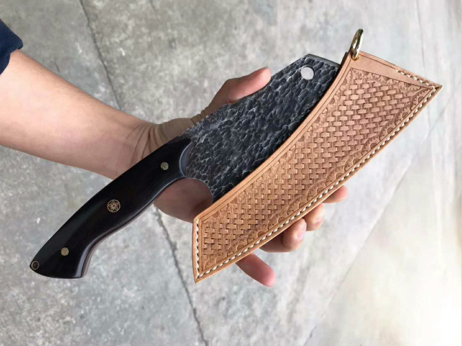 强悍型砍切坦克菜刀 总长:27.2cm 刃长:18cm 刃厚:4mm 刃宽:8.8cm 钢材:日本进口锻造VG10大马士革钢 硬度:60-62HRC,真空热处理 表面效果:复古工艺保留锻造捶打纹理 柄材:进口黑檀木 皮套:意大利进口手工大师纯手工制作雕花缝线植鞣皮 包装:手工盒子礼盒内衬EVA,如此好用一把强悍型砍切菜刀,不要错过机会哦