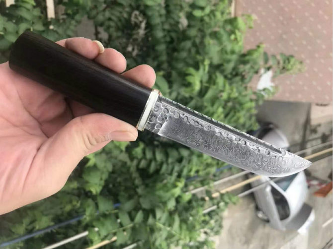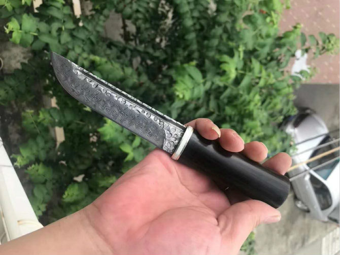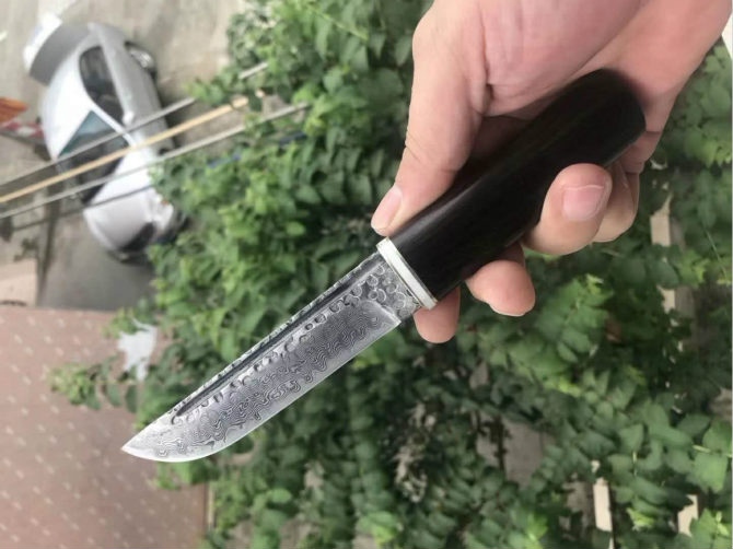 大马士革武士道直刀 总长:21.5cm 刃长:11.5cm 刃厚:3.5mm 刃宽:2.5cm 钢材:锻造大马士革钢VG10,105层 硬度:59-60/真空热处理,表面处理:压花腐蚀抛镜光 柄材:进口黄檀木和黑檀木 刀鞘:与手柄一体木头