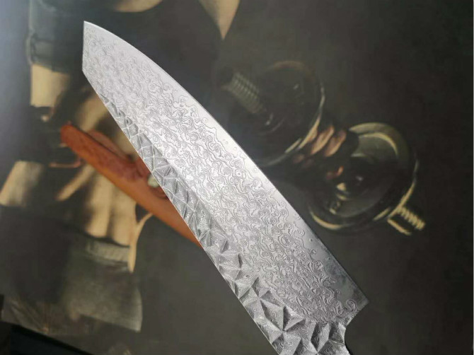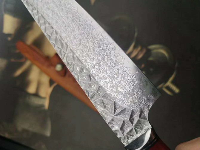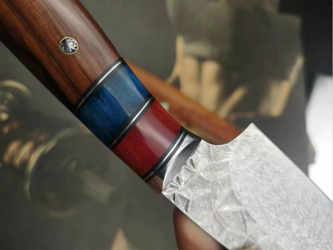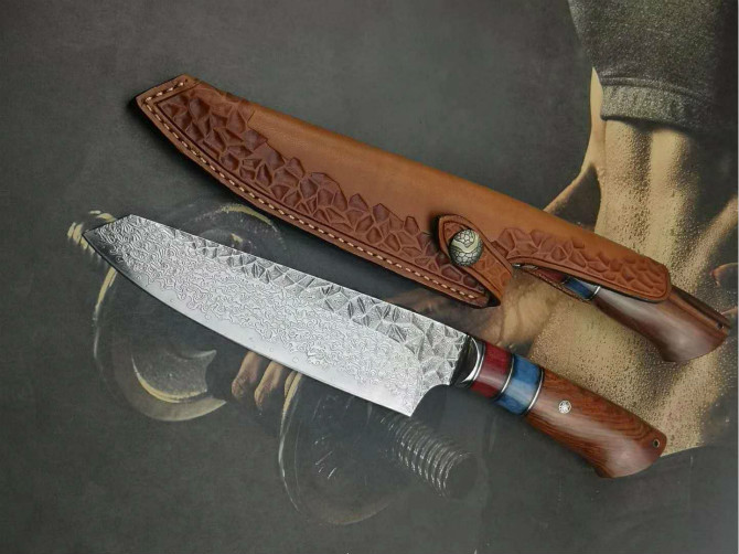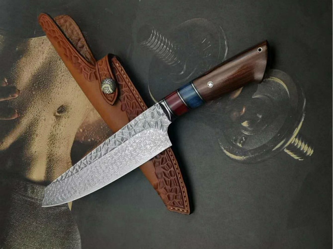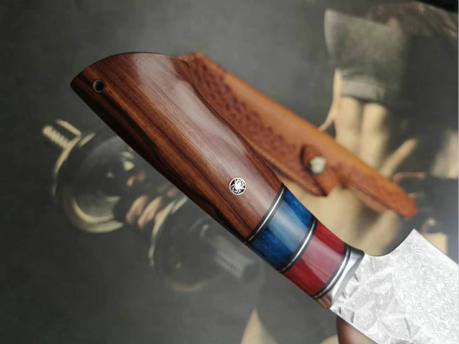 大马士革三德厨刀 总长:305mm 刃长:178mm 刃厚:2.5mm 刃宽:46mm 钢材:日本进口VG10钢芯表面由两边双33层钢锻造(内硬外软)太极原理,韧性保持度非常好 硬度:60HRC,专业真空深冷热处理工艺 重量:裸刀165克 柄材:老挝黄檀木+兽骨,表面制作 工艺:CNC雕刻+手工研磨,皮套:意大利进口优质植鞣皮,国内大师纯手工缝线做旧染色 包装:手工盒子包装,一款非常值得拥有手工大马士革厨刀,性价比非常高的,强力推荐