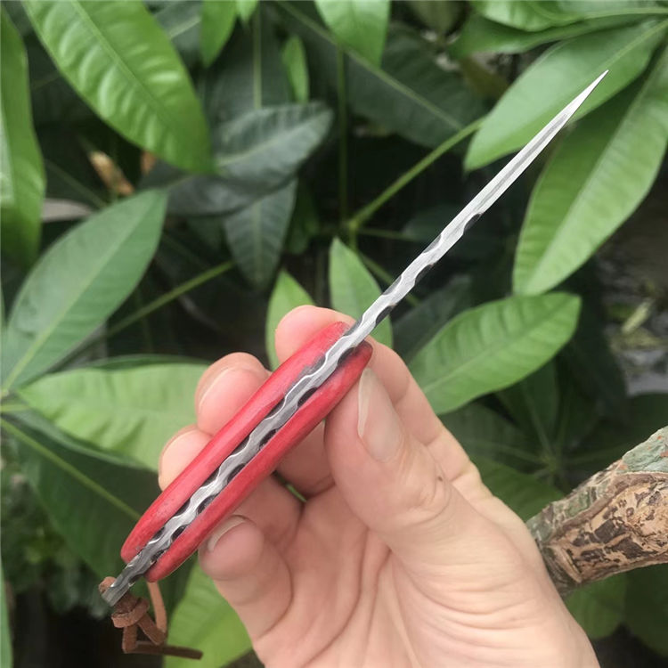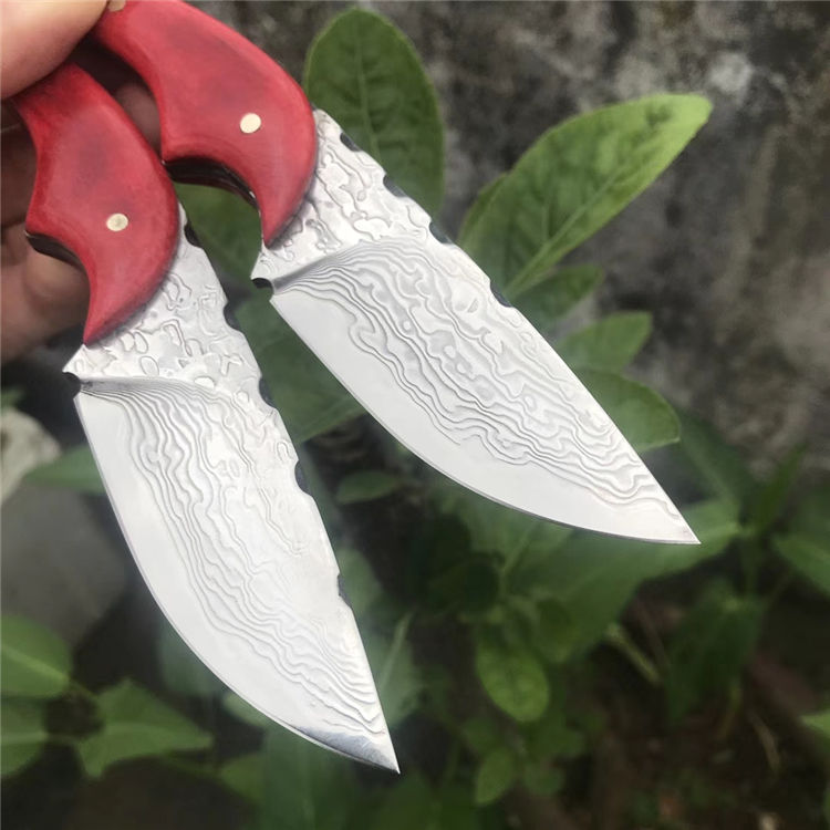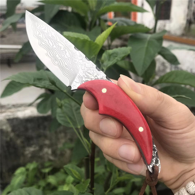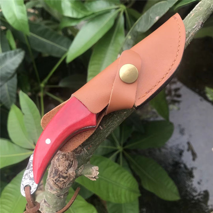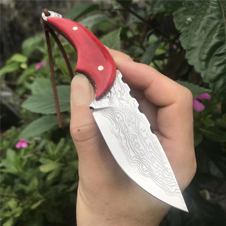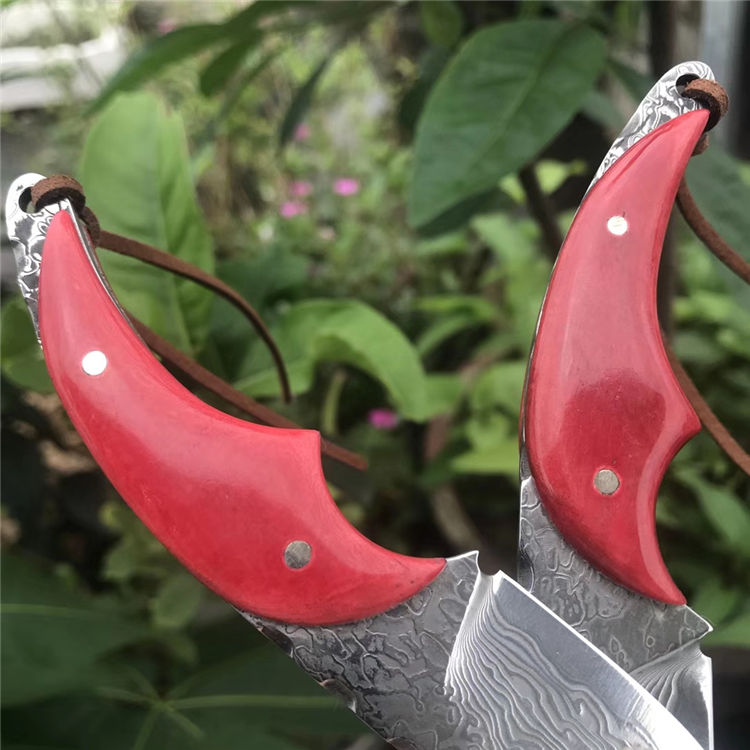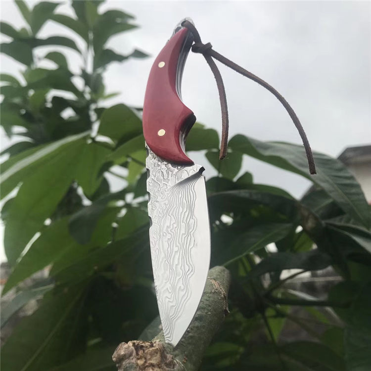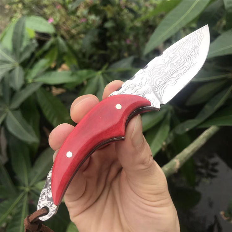大马士革红蜻蜓直刀 全长:15.0cm 刃长:7.2cm 柄长:7.8cm 刃厚:2.8mm 刃宽:3.5cm 刃材:日本进口Vg10大马士革钢 手柄:一体大马士革龙骨+红色骆驼骨 硬度:59-60HRC 重量: 约128克(含包装),配手工皮套