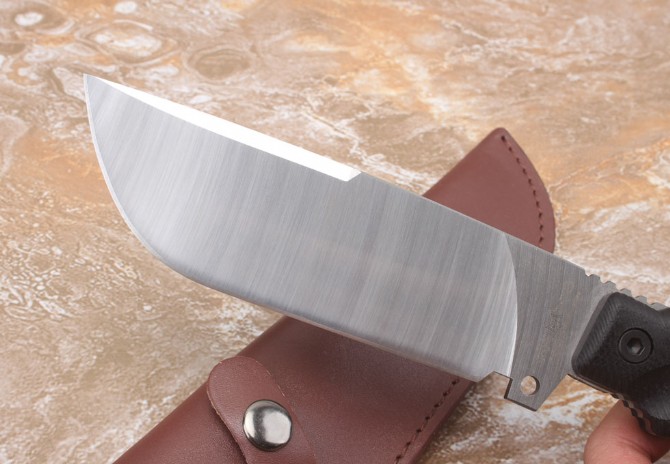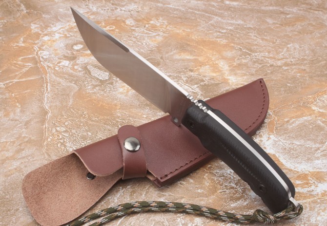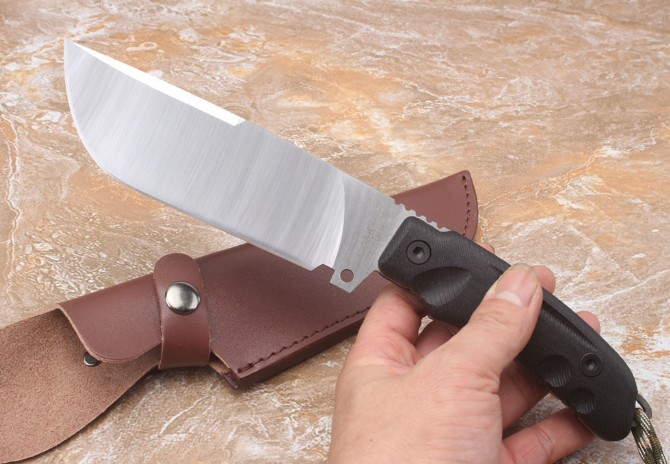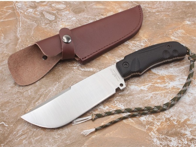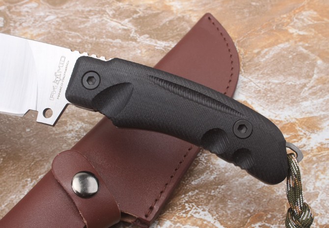 狐狸FOX开拓者直刀 全长:28.5CM 刃长:16.2CM 柄长:12.5CM 刃宽:4.7CM 刀厚:0.45CM 刃材:8Cr13M0V 表面:砂光 硬度:58HRC 柄材:一体钢+G10 刀鞘:牛皮套 重量:刀重341g 包装:硬纸盒