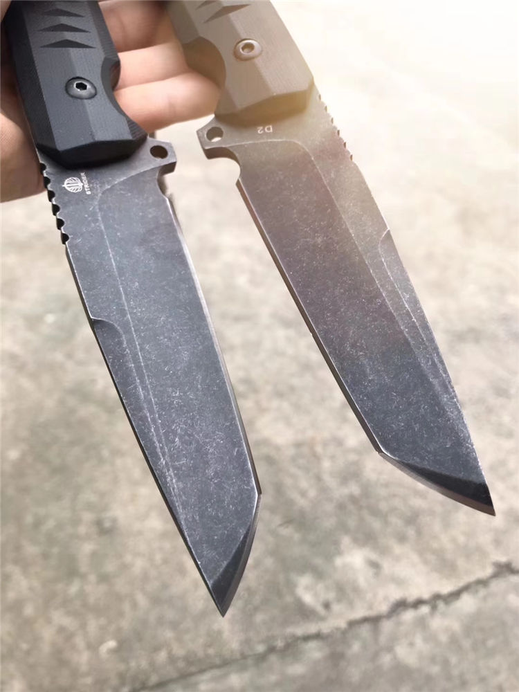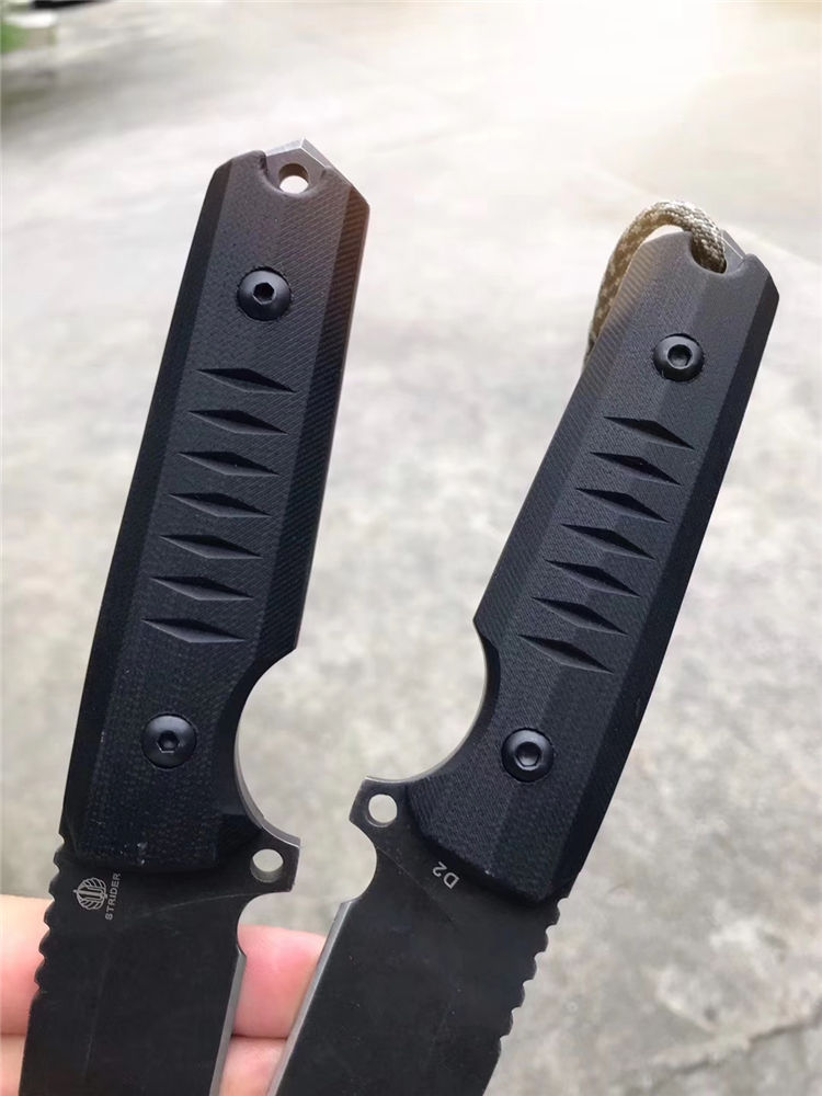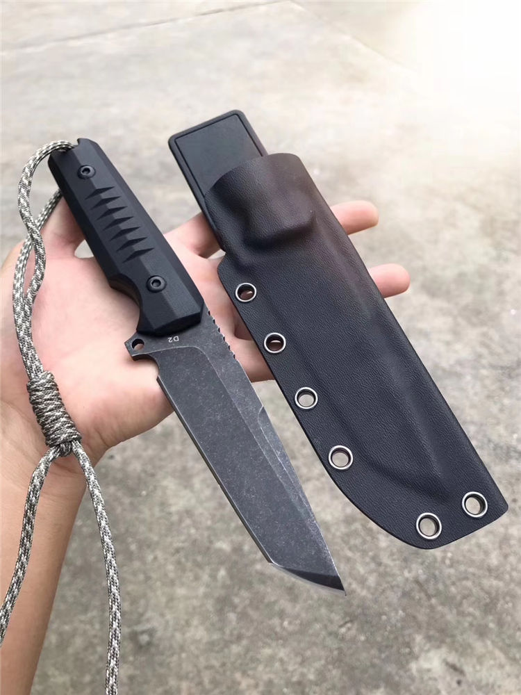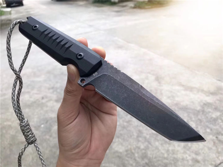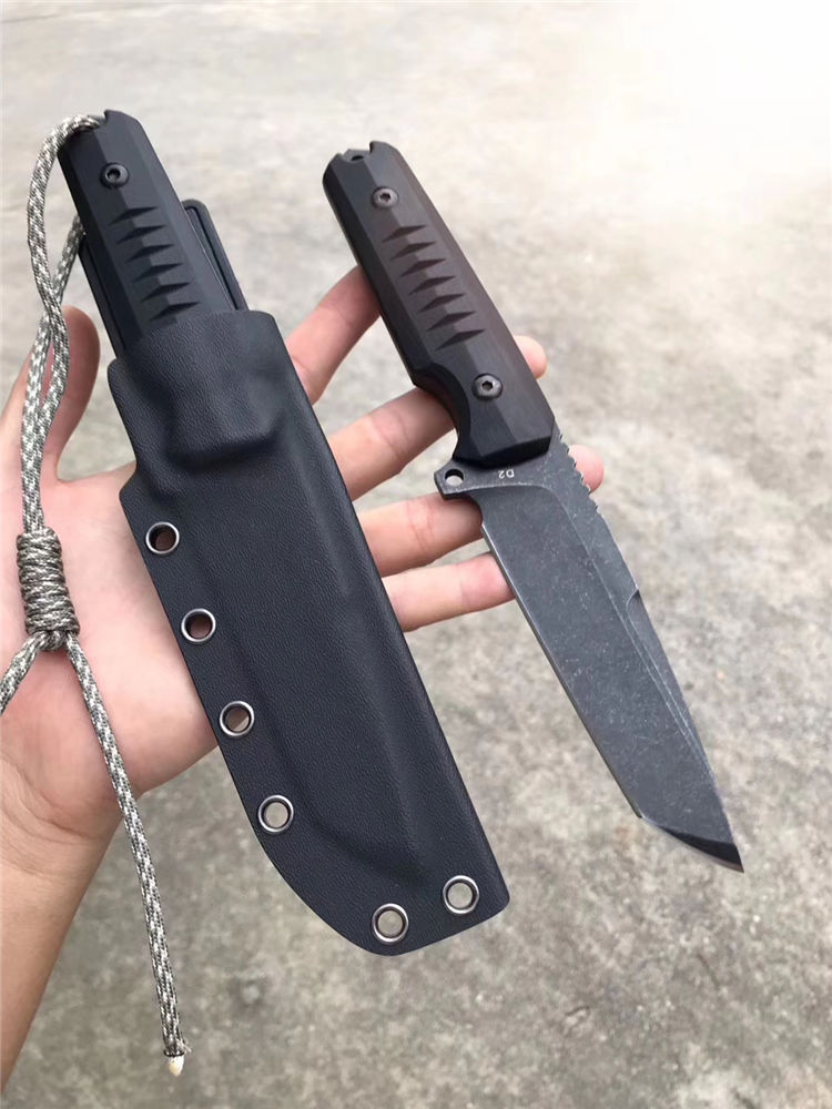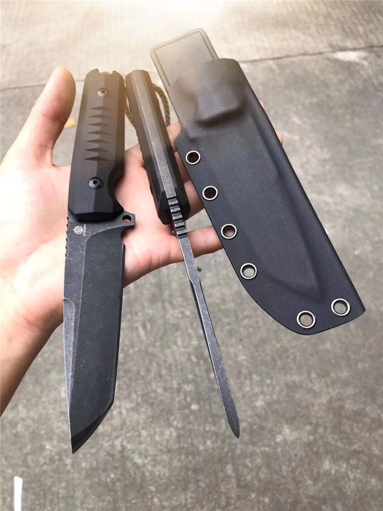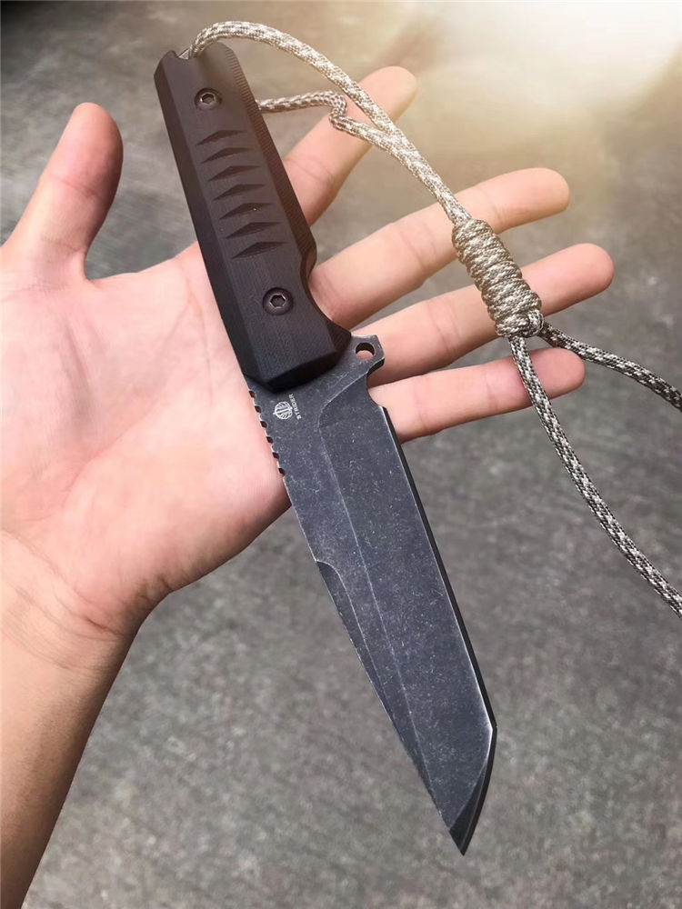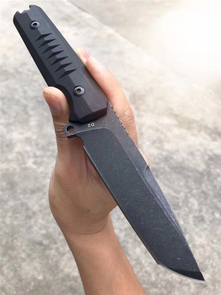 挺进者勇士直刀 总长:23.5cm 刃长:10cm 刃厚:6mm 刃宽:3.3cm 钢材:进口D2合金钢 硬度:60-62HRC 热处理:真空热处理回火 表面工艺:发黑怀旧石洗效果 柄材:黑色G10 刀套:进口K版K鞘 包装:出口盒子简包装
