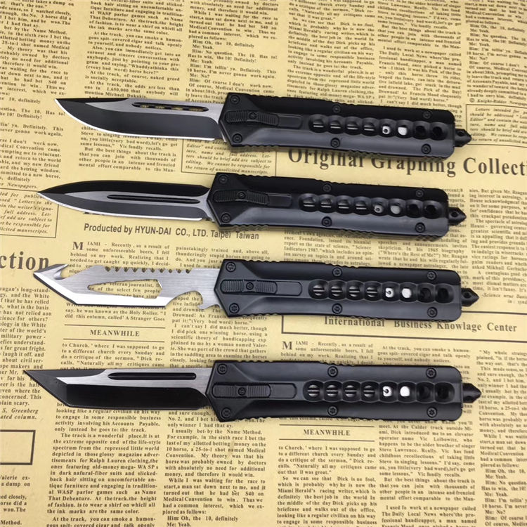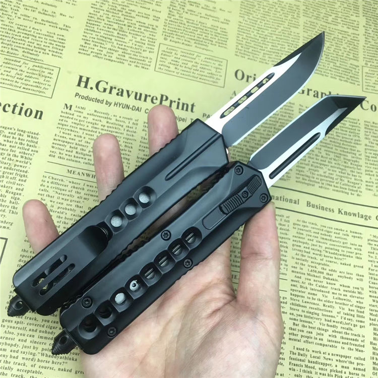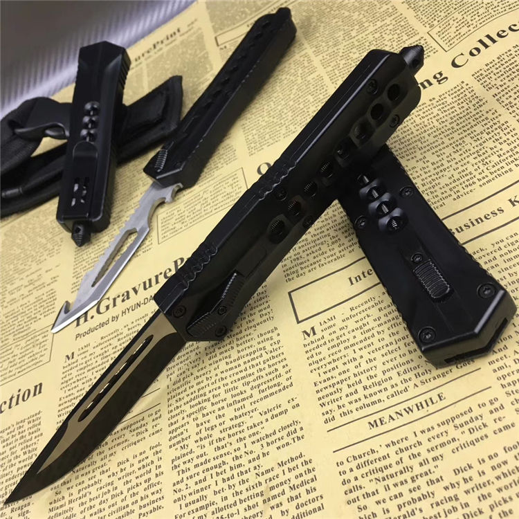 微技术八孔弹簧直出跳刀 全长:23.5cm 刃长:9.5cm 刃厚:2.1mm 刃材:440 硬度:57HRC 刀重:220g 毛重:340g 表面:氧化白 柄材:锌铝合金 刀鞘:尼龙 锁闭:直出弹簧