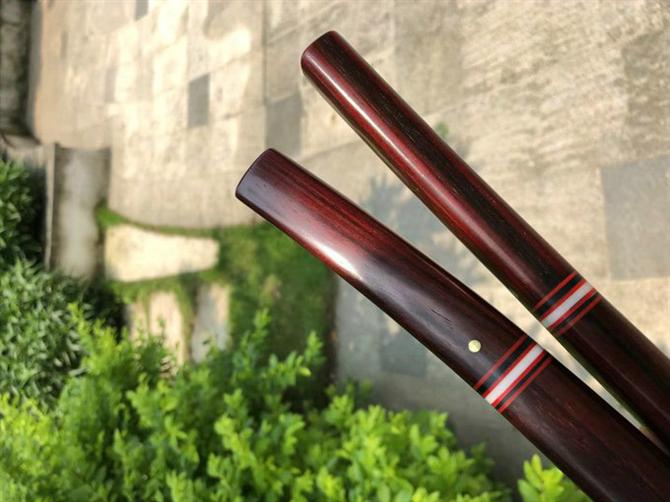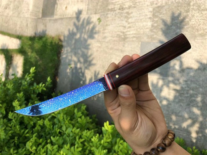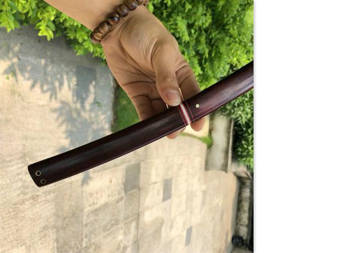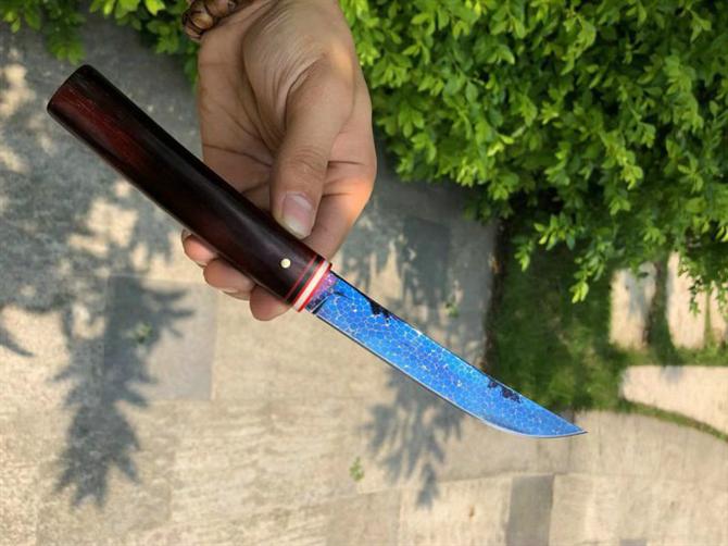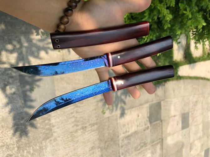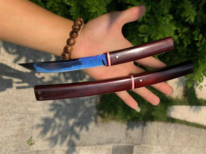 大马士革星云武士刀 全长:26cm 刃长:13.5cm 柄长:11.5cm 厚度:3mm 宽度:1.8cm 刃钢:进口星云马赛克大马士革钢,真空热处理 硬度:60-61HRC 手柄材质:大叶紫檀木 包装:黑色手工盒子