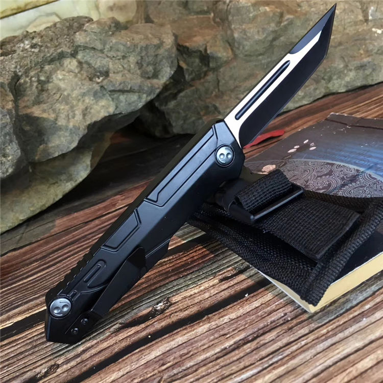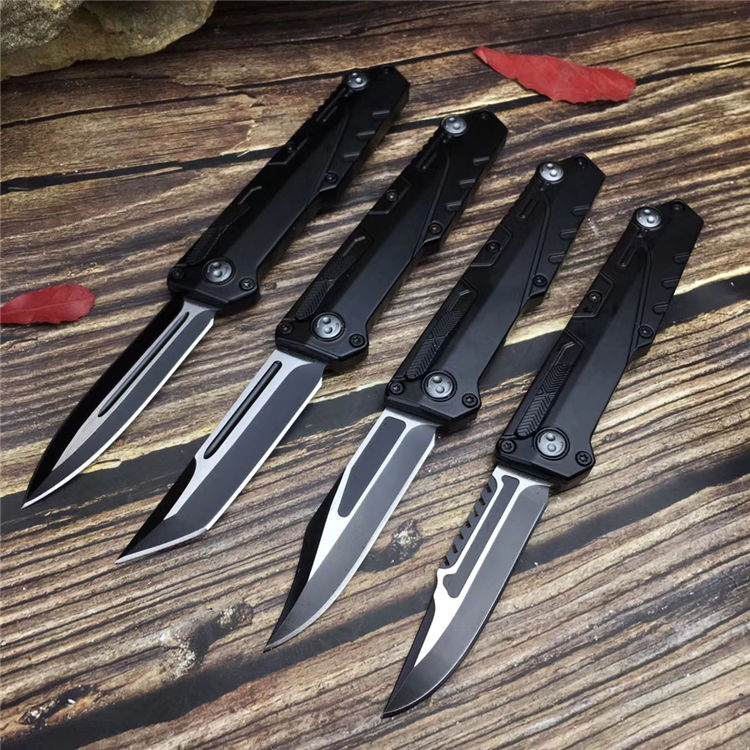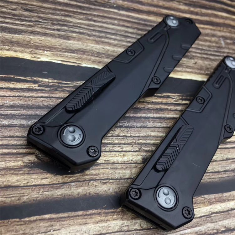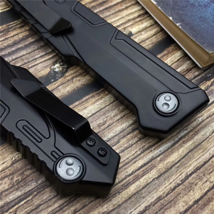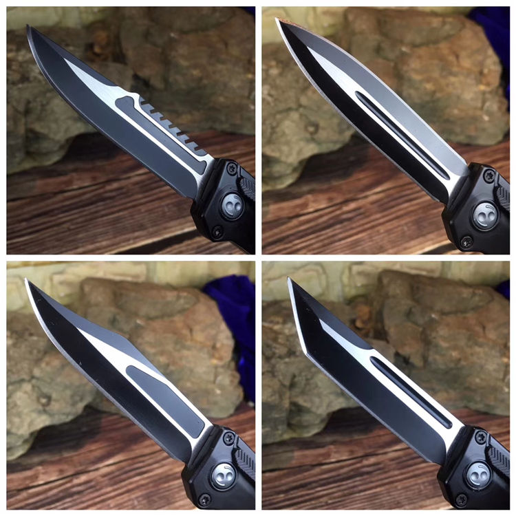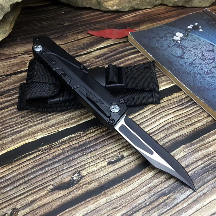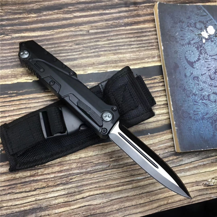 太极直出跳刀 全长:22cm 刃长:9.5cm 刃厚:2.1mm 刃材:440 硬度:57HRC 刀重:220g 毛重:340g 表面:氧化白 柄材:锌铝合金 刀鞘:尼龙 锁闭:直出弹簧