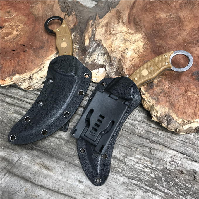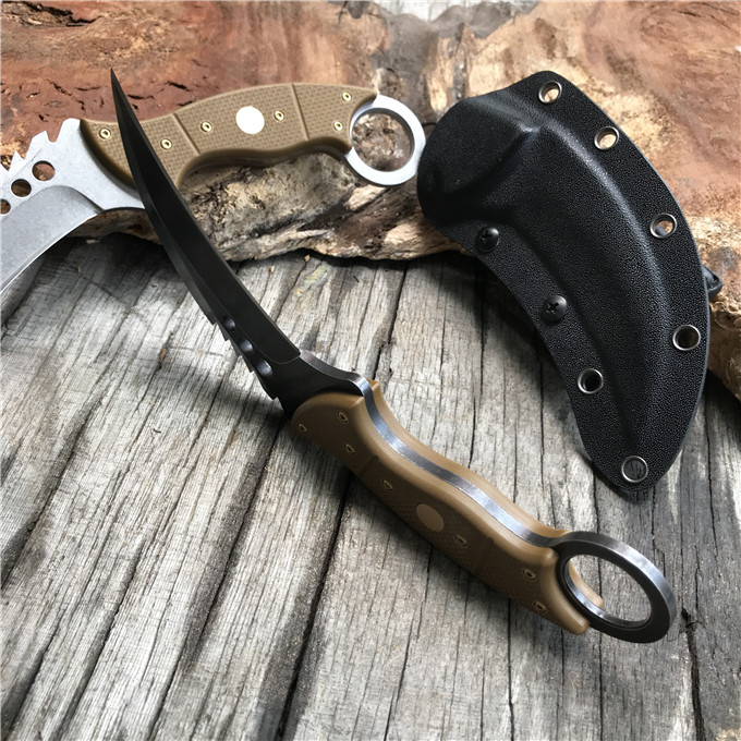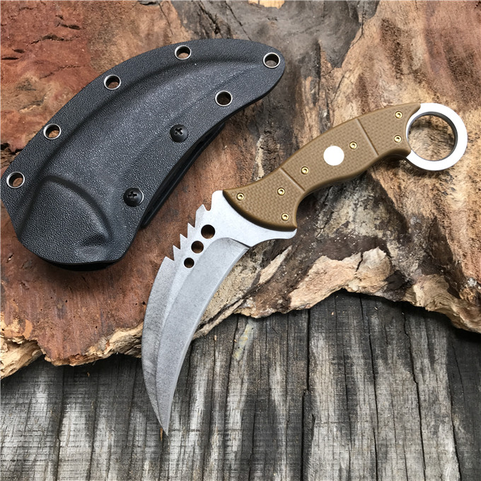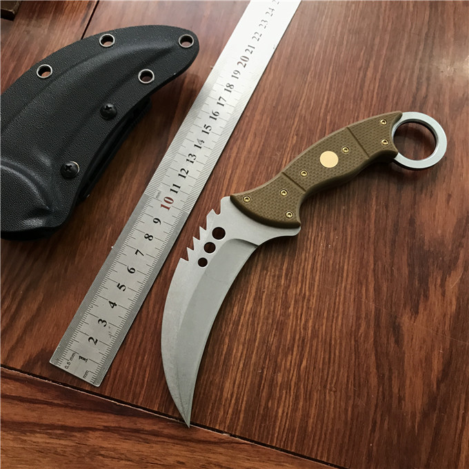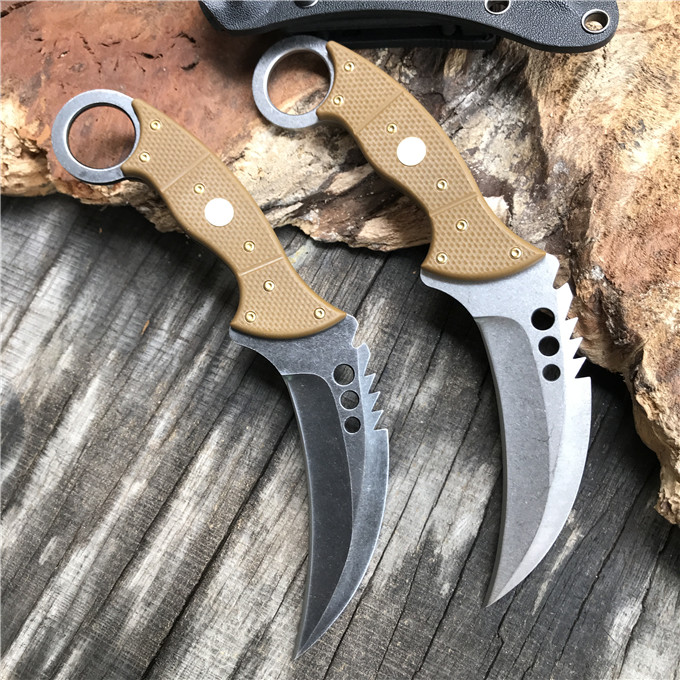 最新款反恐精英CSGO据齿爪刀 钢材:9cr18mov 全长:20.8cm 刃长:9.4cm 刃厚:0.4cm 硬度:59HRC(真空油冷热处理) 柄材:沙漠色G10 表面:石洗版/沧桑石洗版 刀鞘:Kydex鞘 总重:约450G(包括K鞘,礼品盒等) 包装:黑色礼品盒