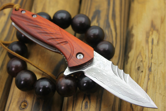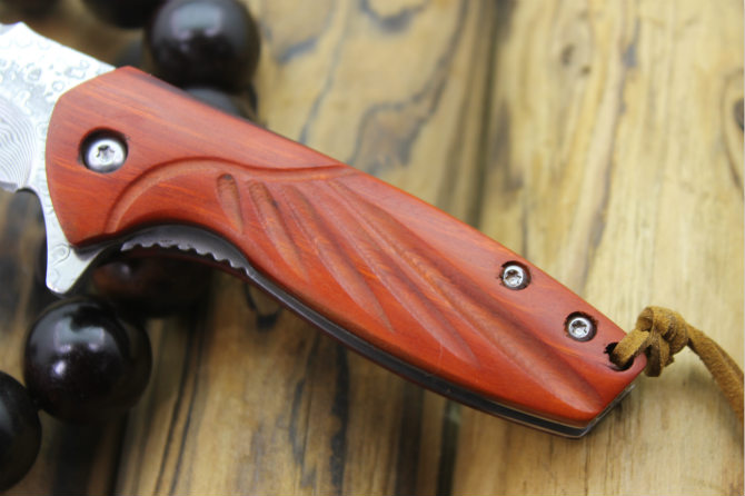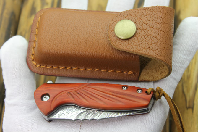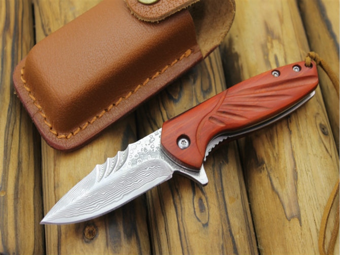 大马士革沙箭折刀 全长:14.5cm 刃长:6cm 刃宽:2.2cm(最宽处) 柄长:8.5cm 刃厚:3.2mm 刃材:大马士革 柄材:红酸枝 硬度:59HRC 表面:大马士革 重量:80克(含包装) 锁闭:线锁 配送:高级礼品盒+真皮套+牛皮绳子