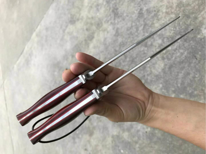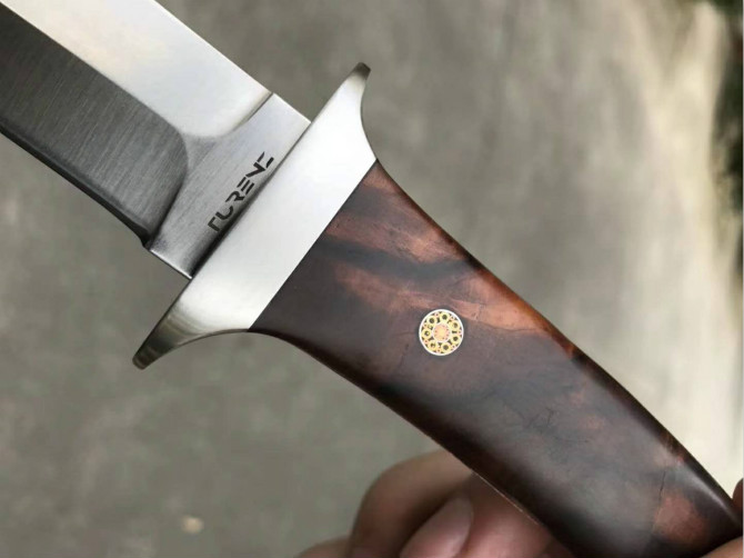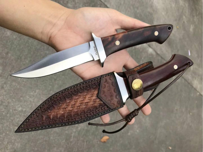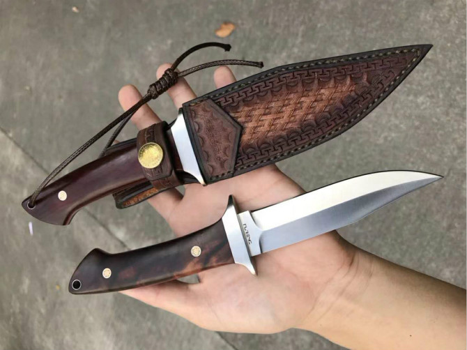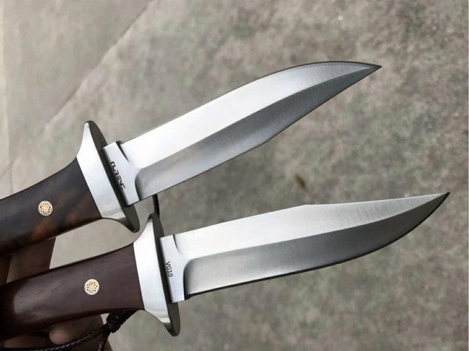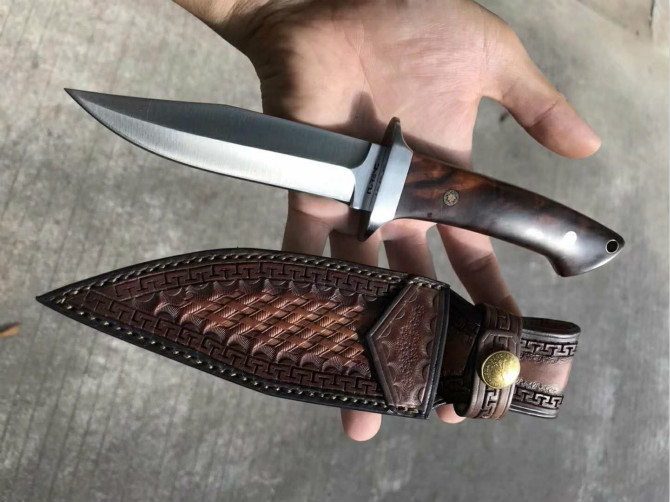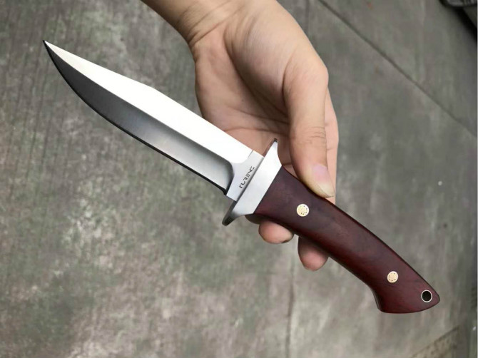 T高端手工版VG10钢直刀 总长:23.5cm 刃长:11cm 刃宽:2.7cm 刃厚:5mm 钢材:日本进口VG10钢 结构:一体龙骨设计,手柄渐变磨薄减重设计 硬度:60-62HRC 热处理:专业真空深冷热处理,回火处理 重量:186g 柄材:进口微粒黄檀木+红G10片,马赛克花钉装饰 皮套:意大利手工优质雕花皮套手工雕花缝线,做旧复古颜色,手工着色 包装:手工盒子包装内衬EVA
