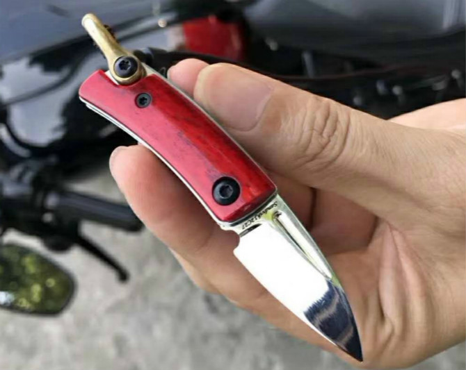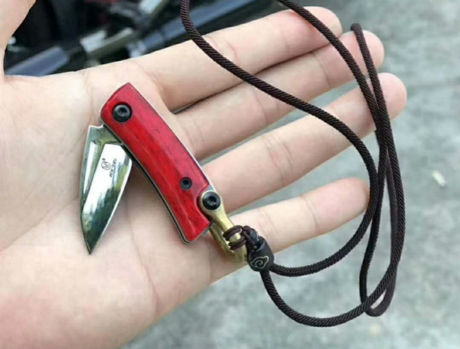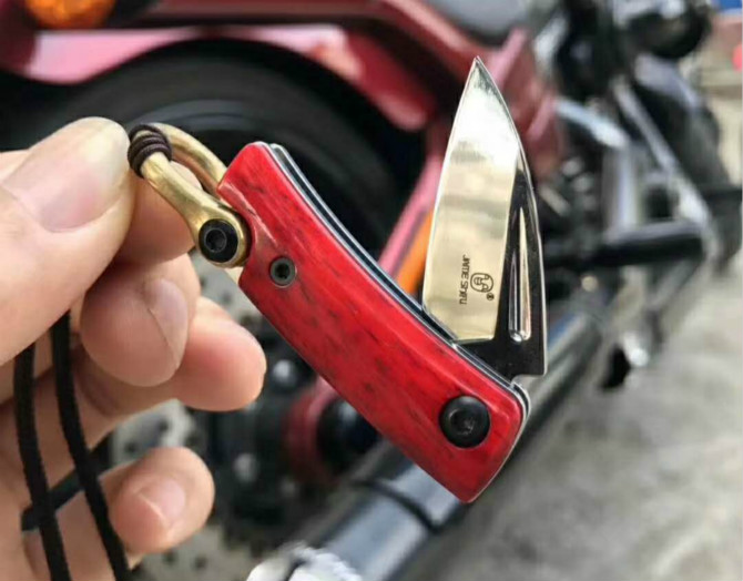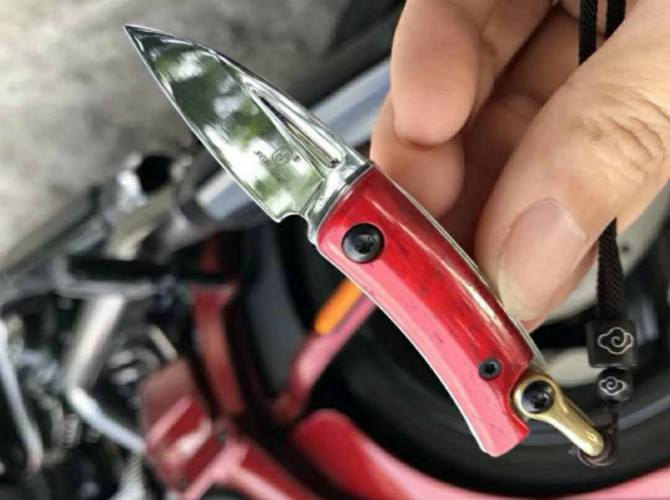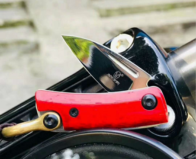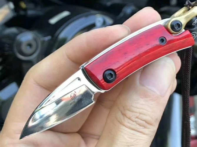 简师傅魔环折刀 总长:8.6cm 刃长:3.4cm 刃厚:2.0mm 钢材:瑞典山特维克12C27 硬度:60-61HRC 柄材:染色牛骨+尾铜环 表面效果:抛光镜关效果,配挂绳子