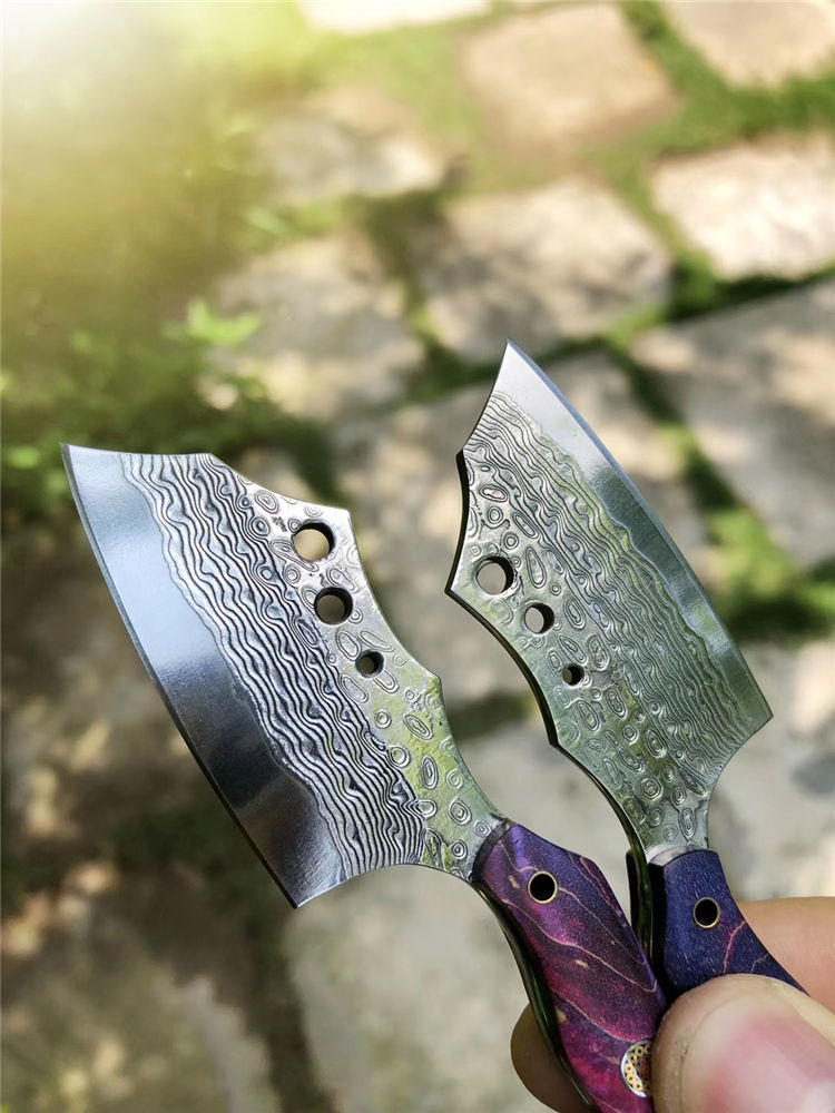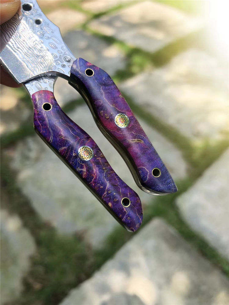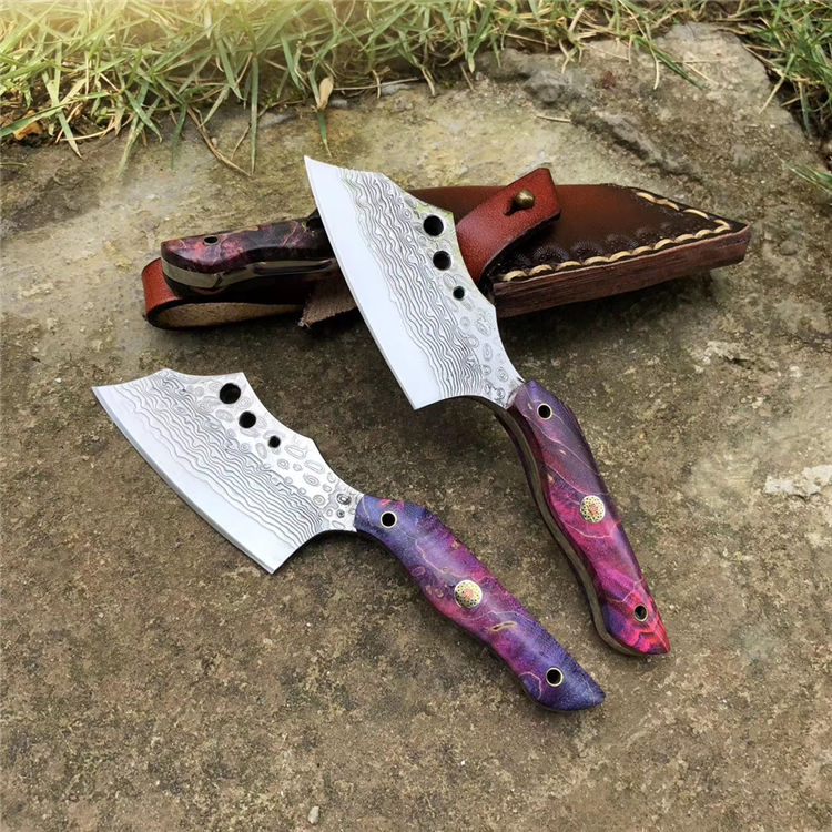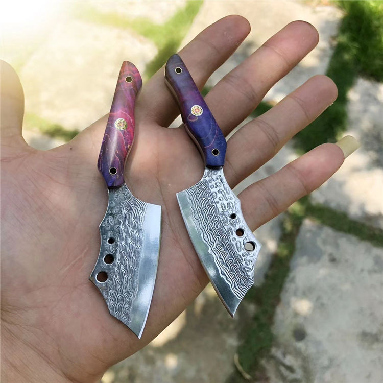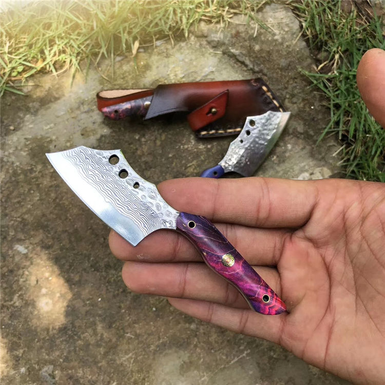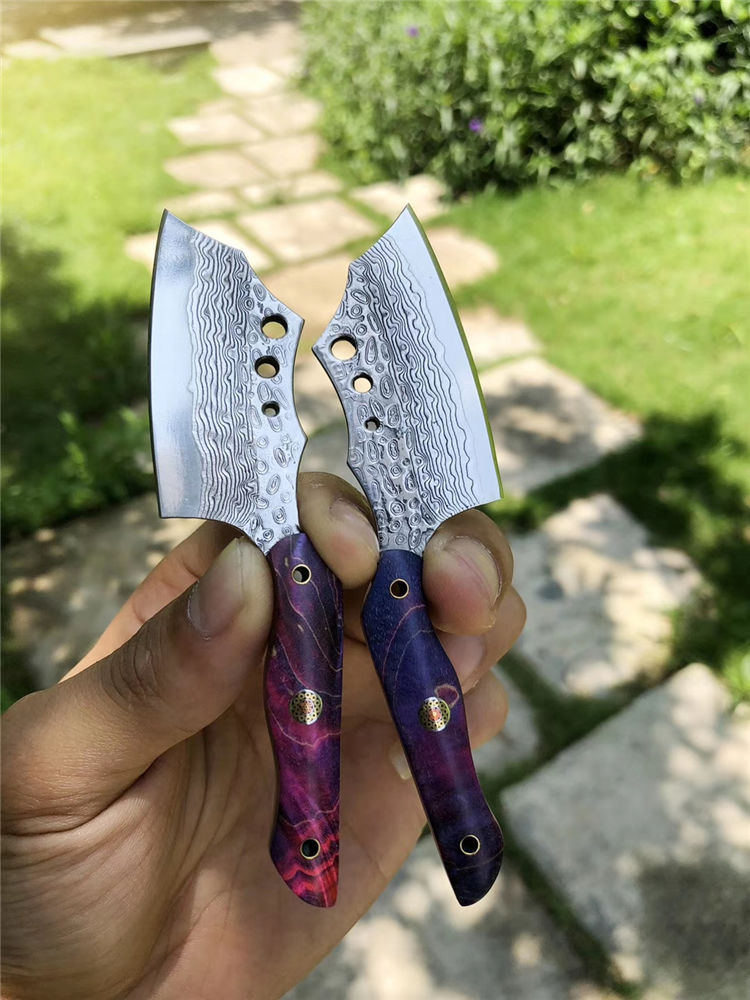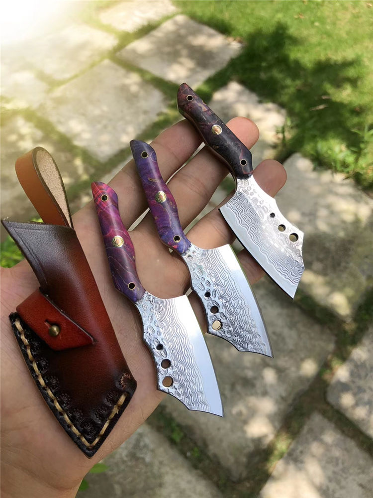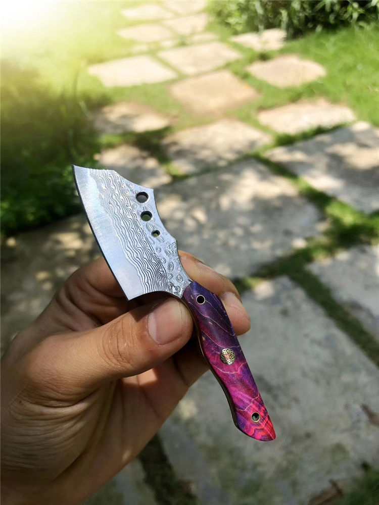 大马士革小萌龙菜刀 全长:11.5cm 刃长:5.4cm 柄长:5.5cm 刃宽:2.6cm 刃厚:3.5cm 钢材:进口锻造大马士革钢 硬度:60HRC 开刃方式:二次手工研磨开刃 手柄:进口固化稳定木+梅花铆钉固定 皮套:进口植鞣皮纯手工缝线制作