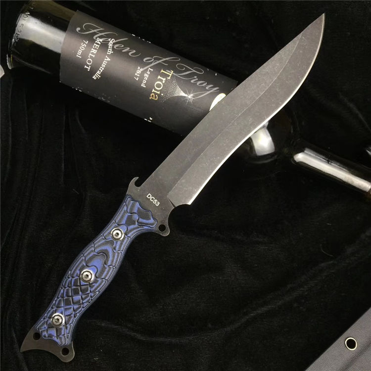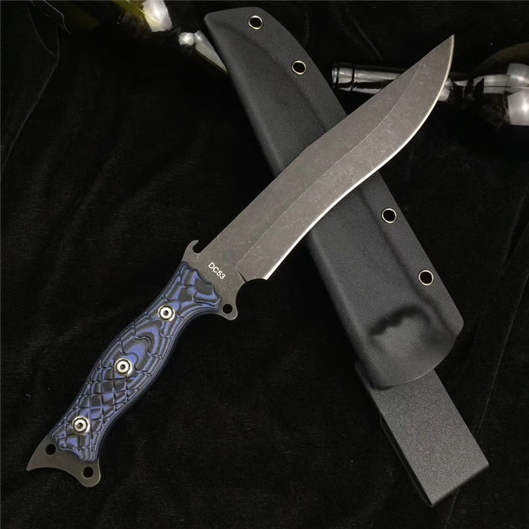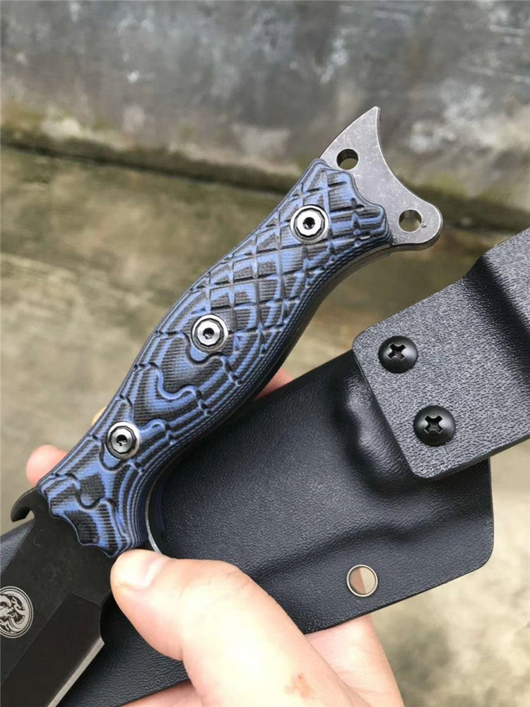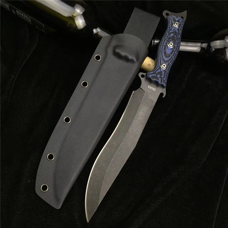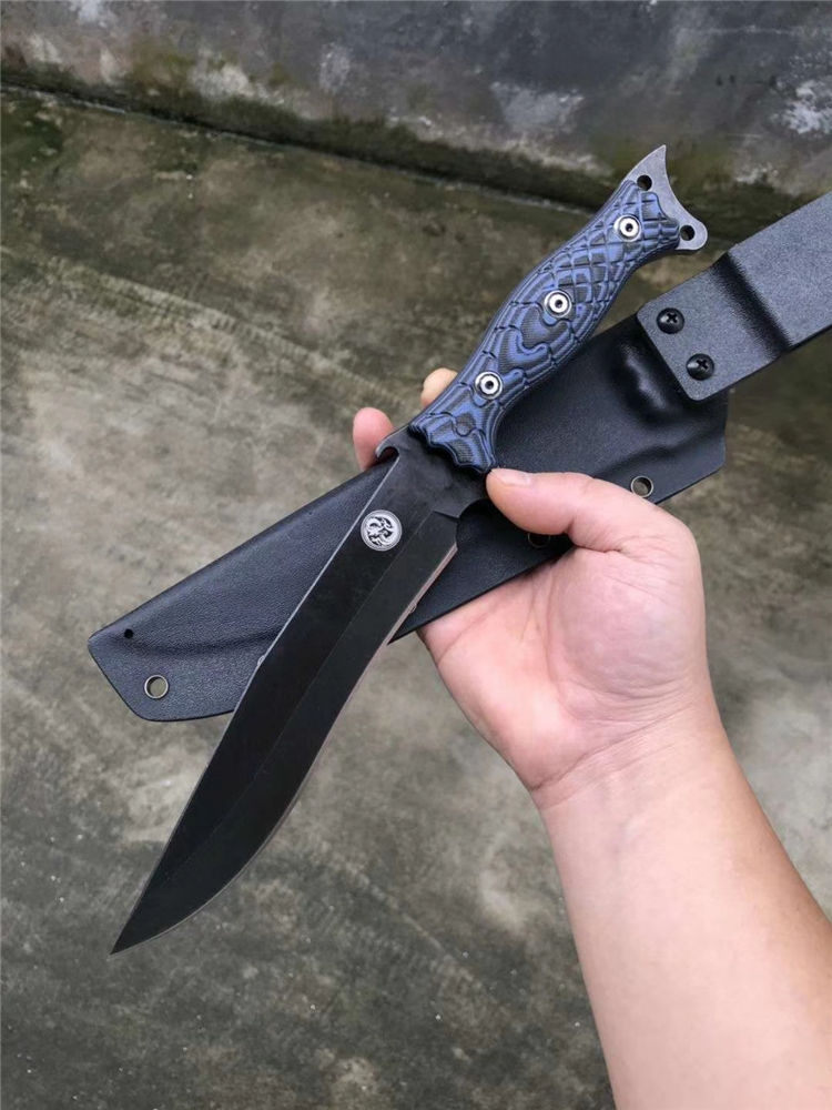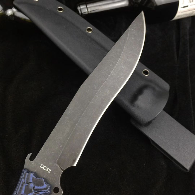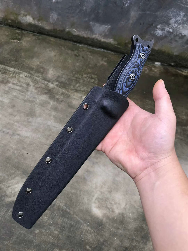 升级版YE野巴斯户外直刀 全长:315mm(龙骨一体) 刃长:185mm 柄长:125mm 刃最宽处:33mm 刃材:采用日本进口DC53钢材(线切割开料) 热处理:真空淬油热处理 硬度:60-61HRC 刃线条:采用数控水磨精准加工处理 开刃方式:二次开刃,以锋利度为主 柄材:采用黑蓝彩色G10材料+钢钉(钢钉采用CNC电脑锣加工八角元素效果,立体感完美) 周边:CNC电脑锣倒角手感更加舒适 刀刃表面:采用发黑石洗效果 刀鞘:美国进口黑色K鞘加带扣 净重:400克 包装:精美子
