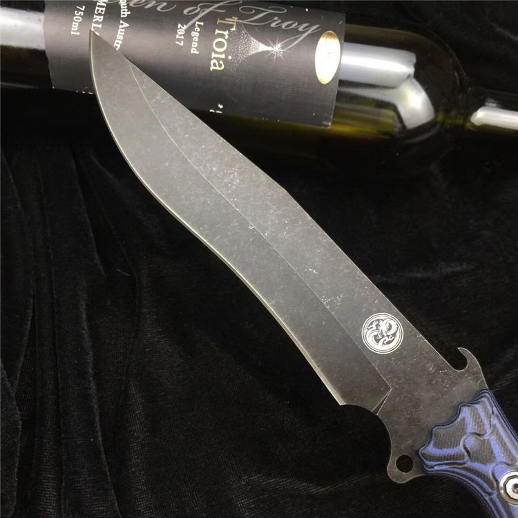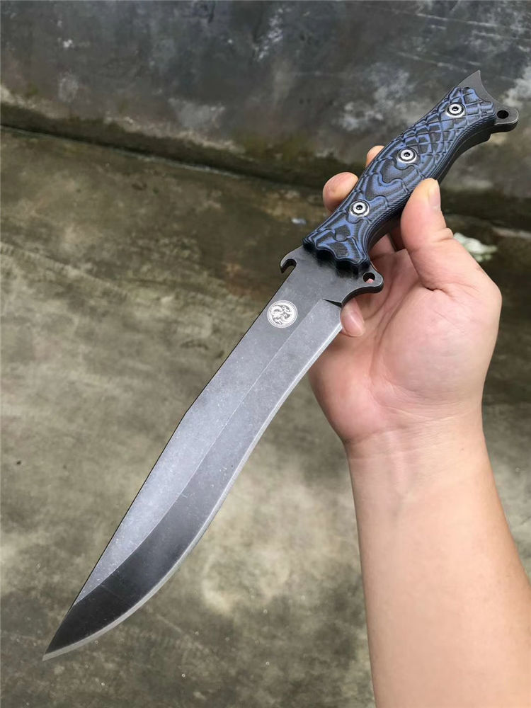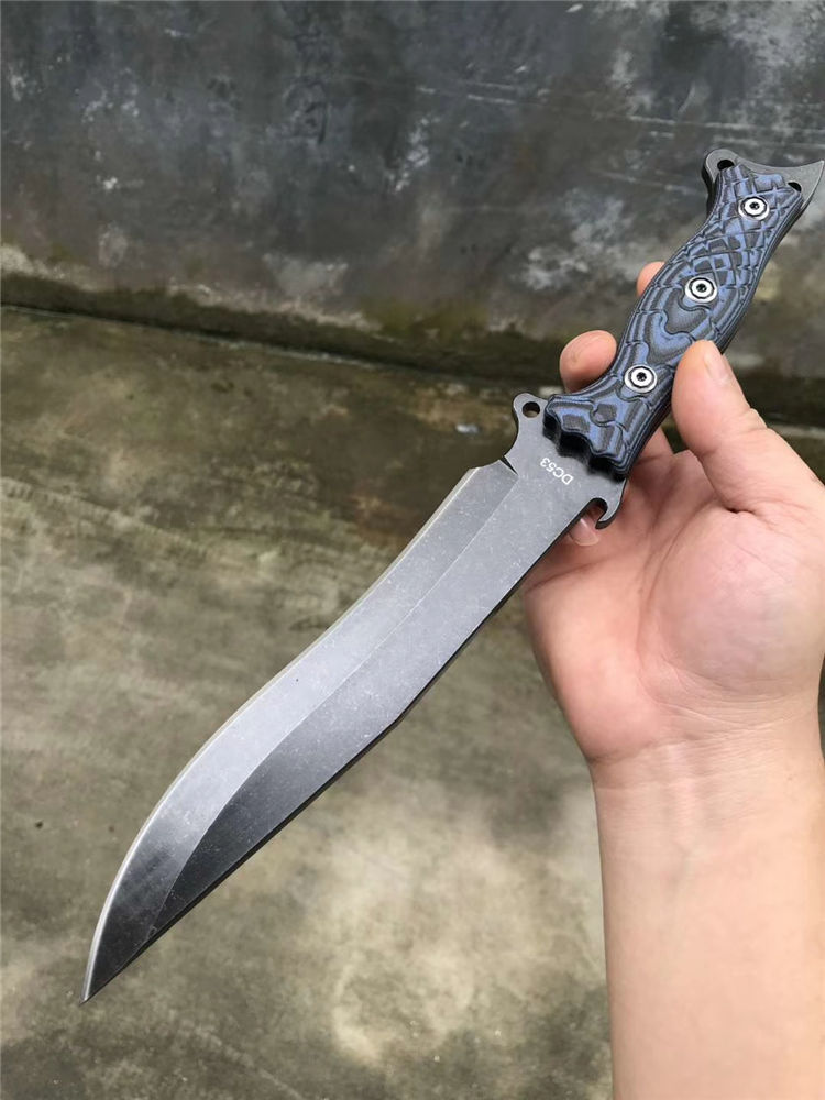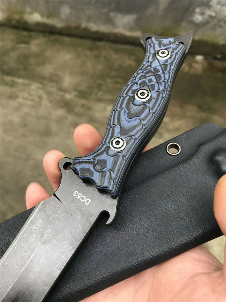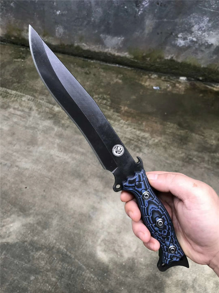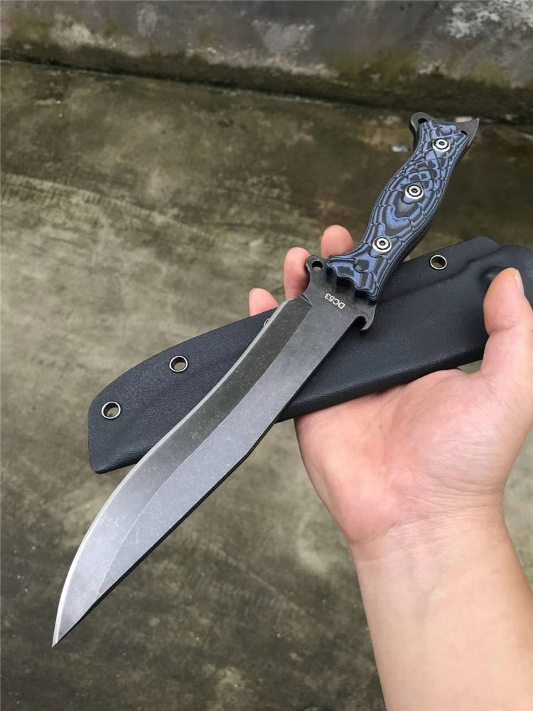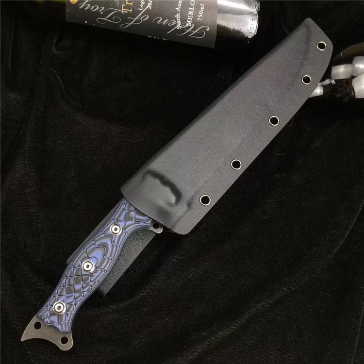 升级版YE野巴斯户外直刀 全长:315mm(龙骨一体) 刃长:185mm 柄长:125mm 刃最宽处:33mm 刃材:采用日本进口DC53钢材(线切割开料) 热处理:真空淬油热处理 硬度:60-61HRC 刃线条:采用数控水磨精准加工处理 开刃方式:二次开刃,以锋利度为主 柄材:采用黑蓝彩色G10材料+钢钉(钢钉采用CNC电脑锣加工八角元素效果,立体感完美) 周边:CNC电脑锣倒角手感更加舒适 刀刃表面:采用发黑石洗效果 刀鞘:美国进口黑色K鞘加带扣 净重:400克 包装:精美子