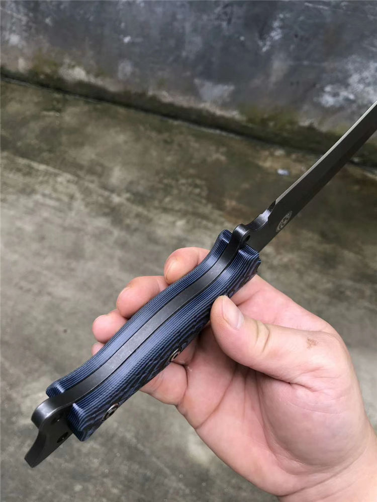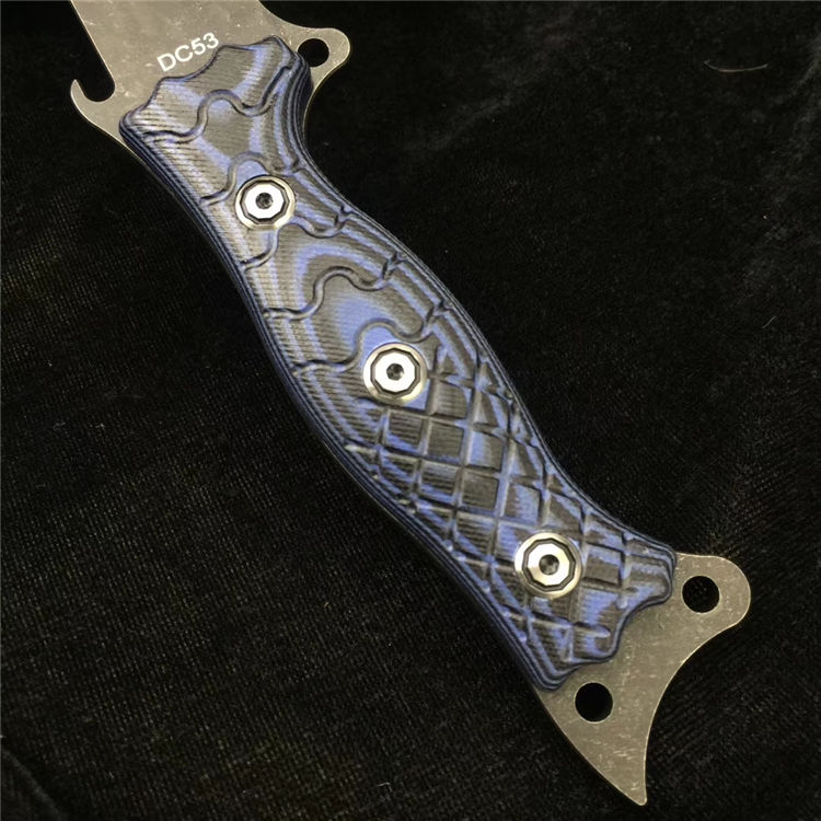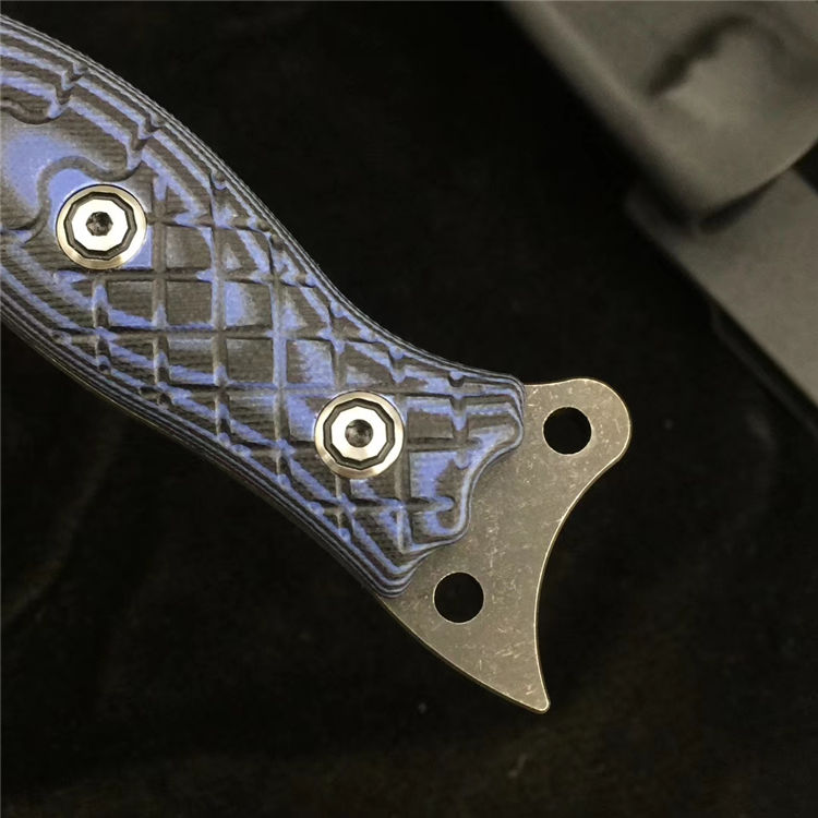 柄材:采用黑蓝彩色G10材料+钢钉(钢钉采用CNC电脑锣加工八角元素效果,立体感完美)