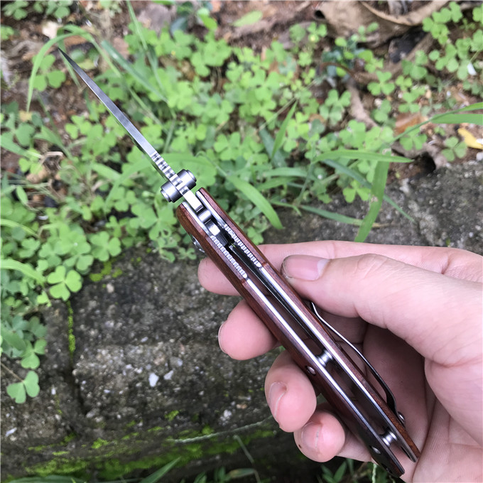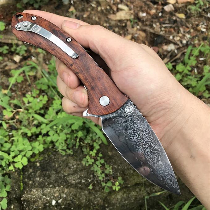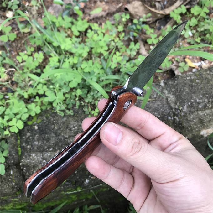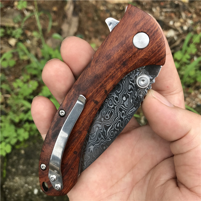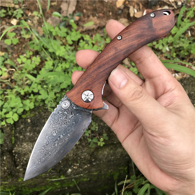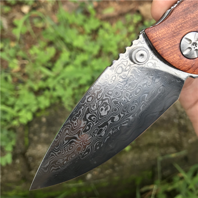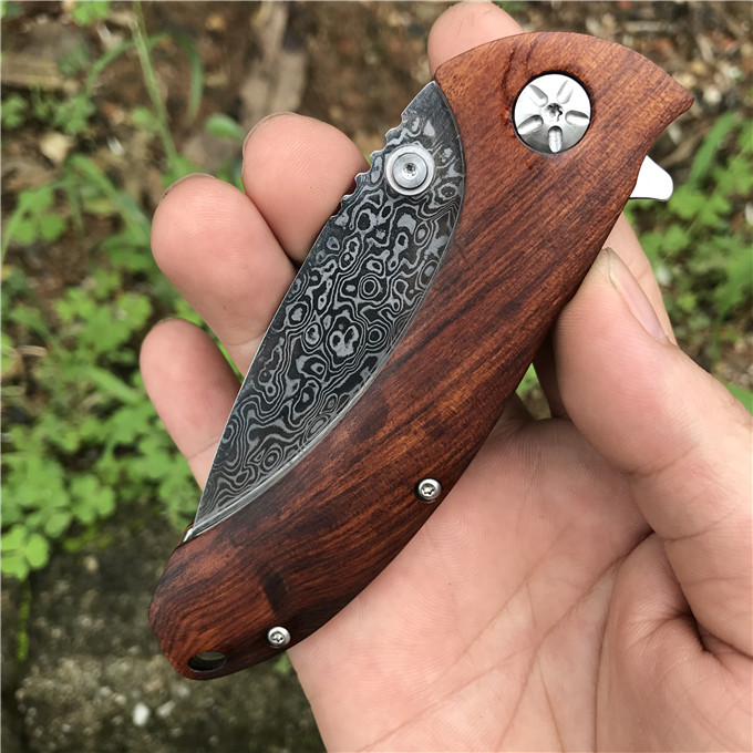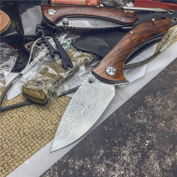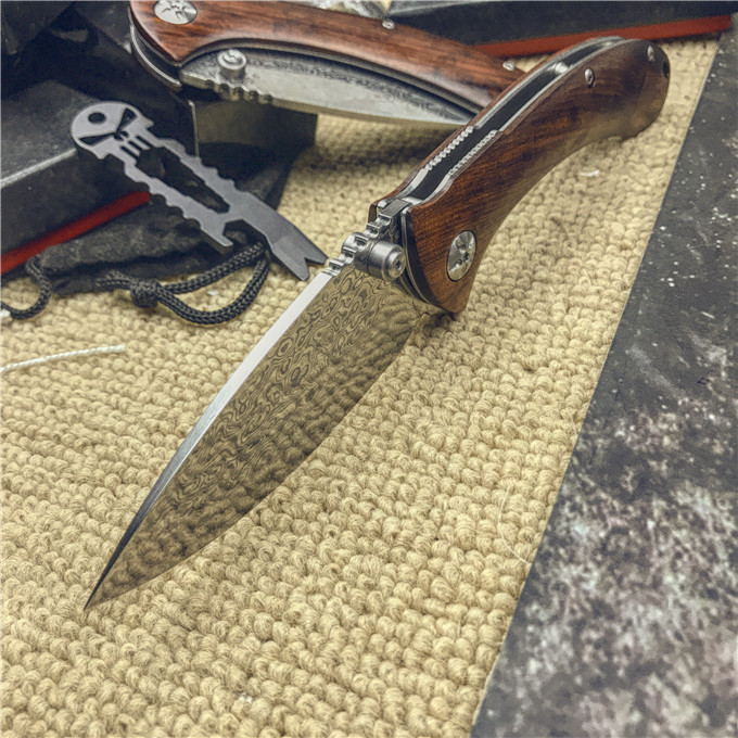 大马士革大头鲨轴承快开折刀 类型:轴承快开 刀刃:大马士革钢 HRC: 59º±1º 刃厚:2.8mm 表面:镜面 手柄内衬:1.5mm 不锈钢减重内片 手柄:优质进口微粒黄檀木 刃长78mm 总长215mm 重量:136g