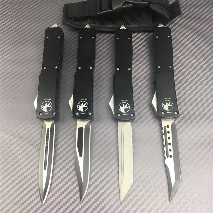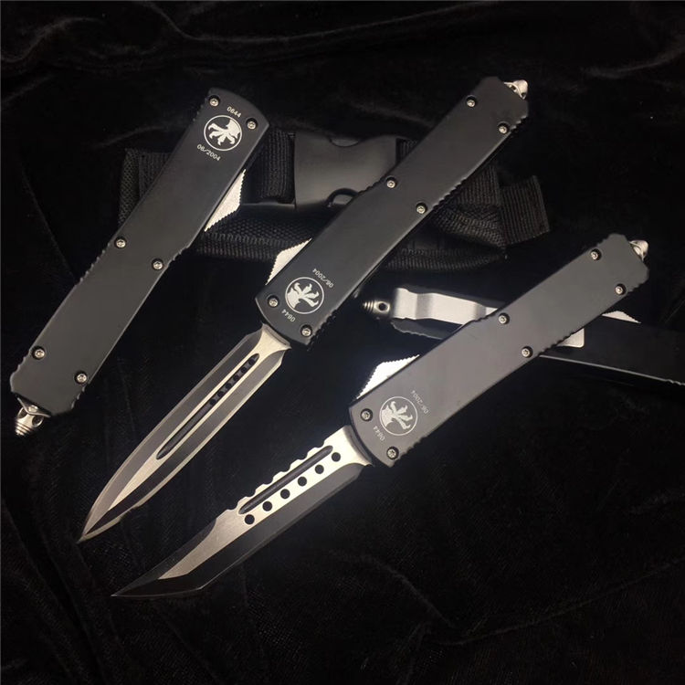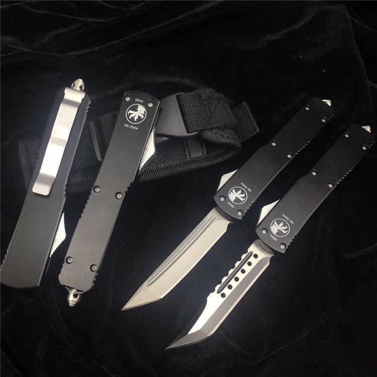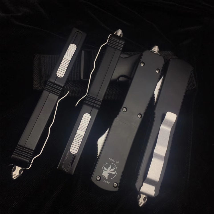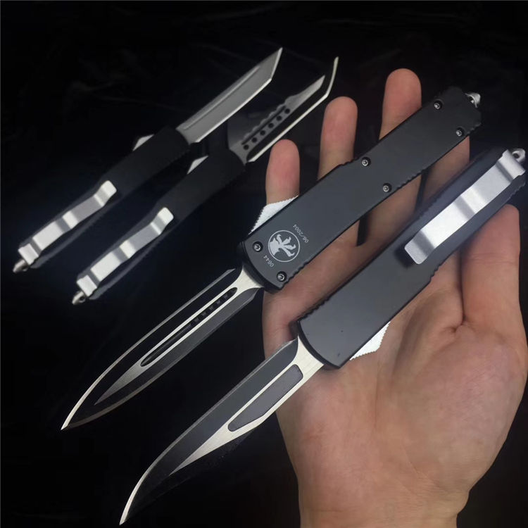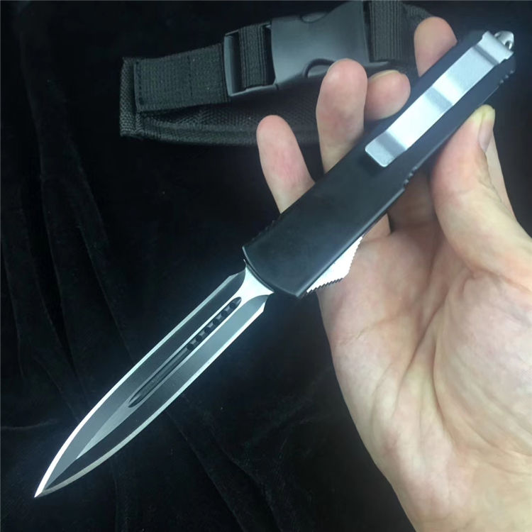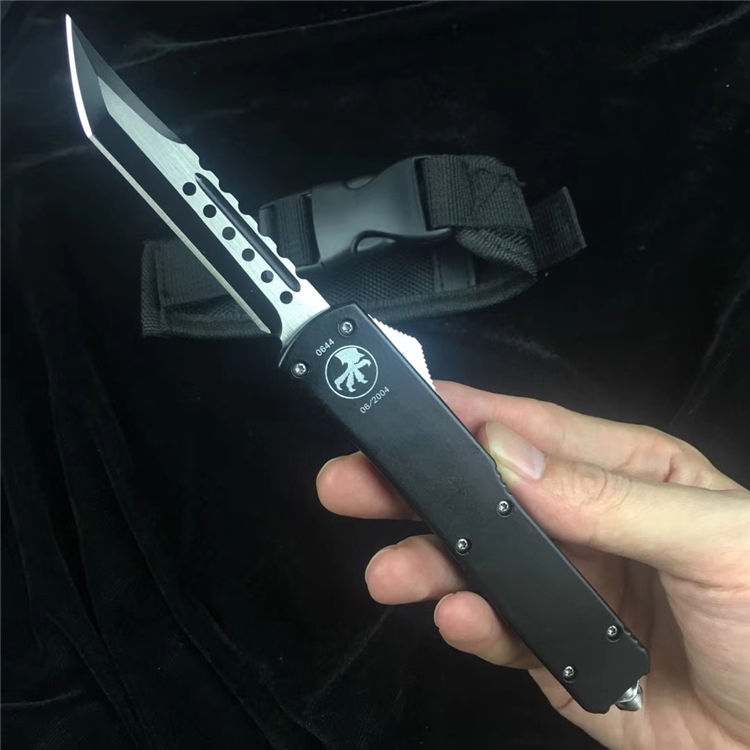 微技术UT85弹簧直出跳刀 全长:20CM 刃长:8CM 厚度:4MM 刃材:D2高速钢 手材:T6061航空铝 硬度:59HRC 净重:120克 含包装:180克 配件:彩盒+nylon套