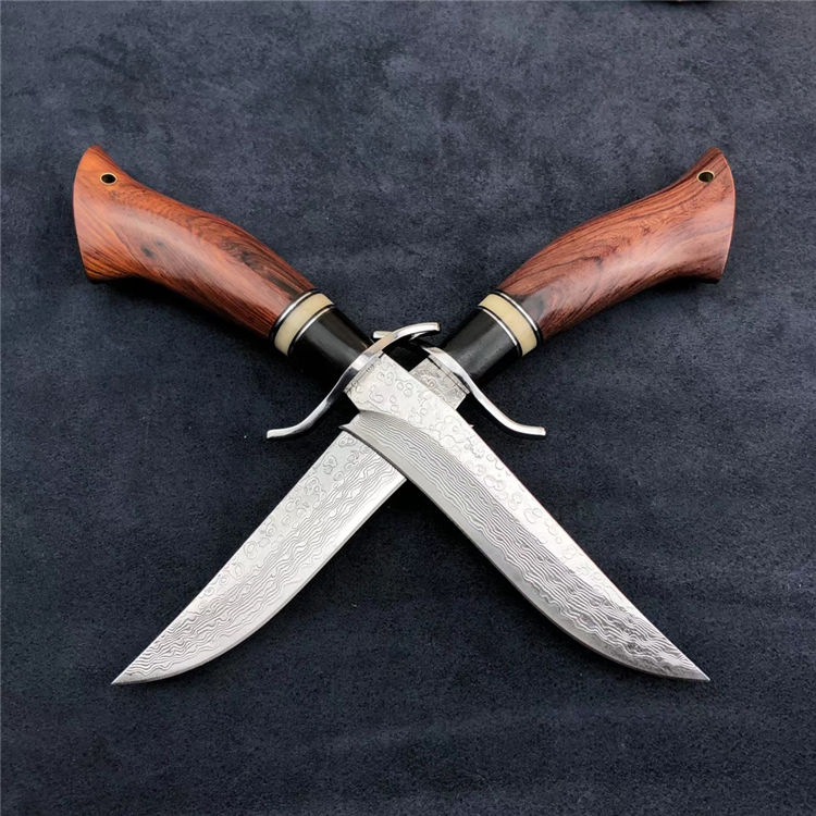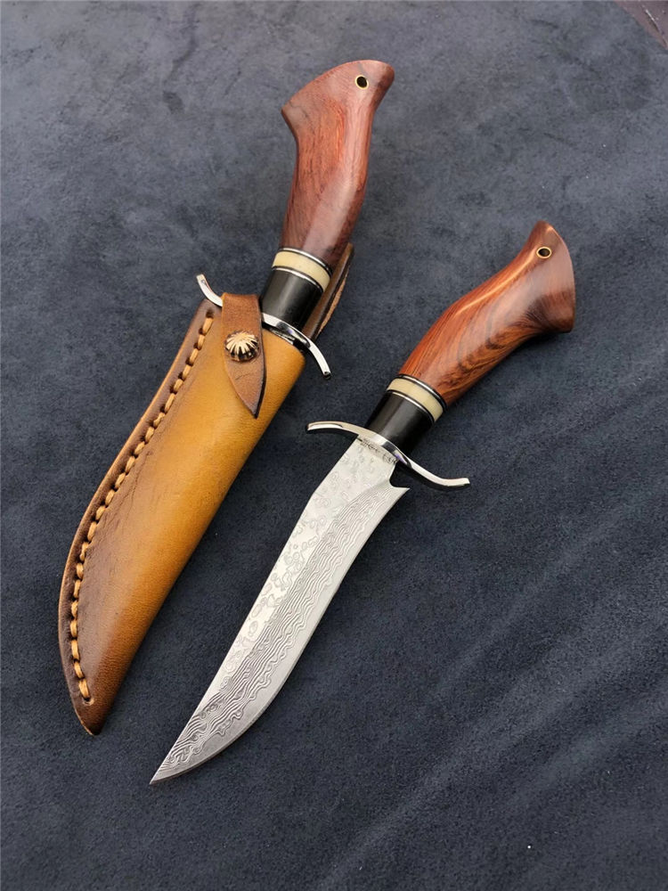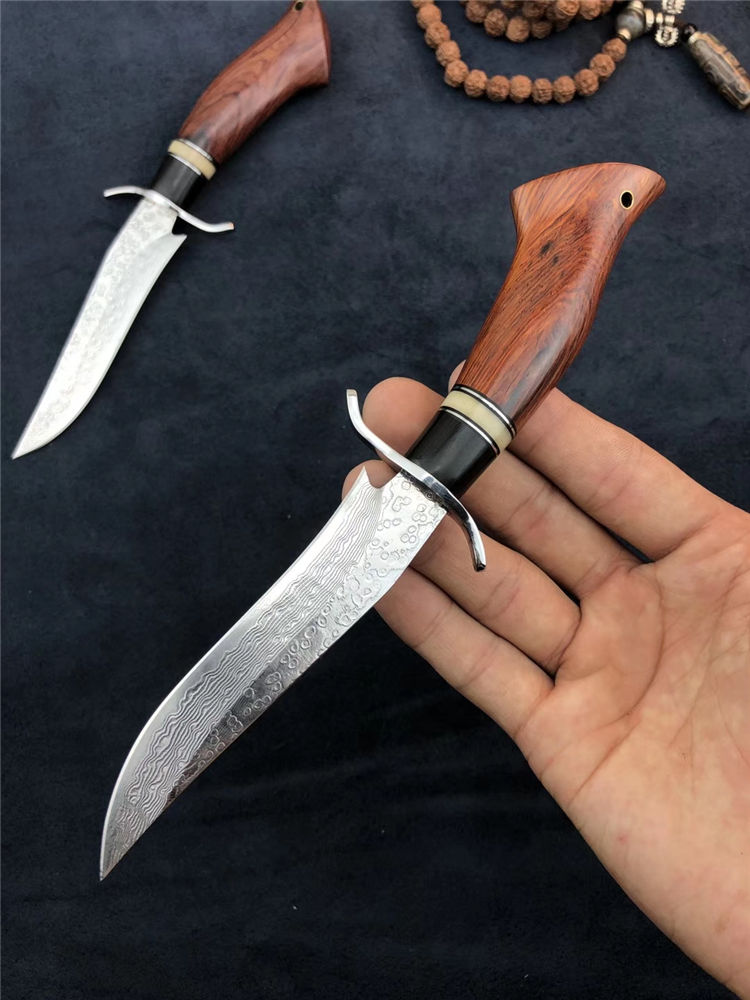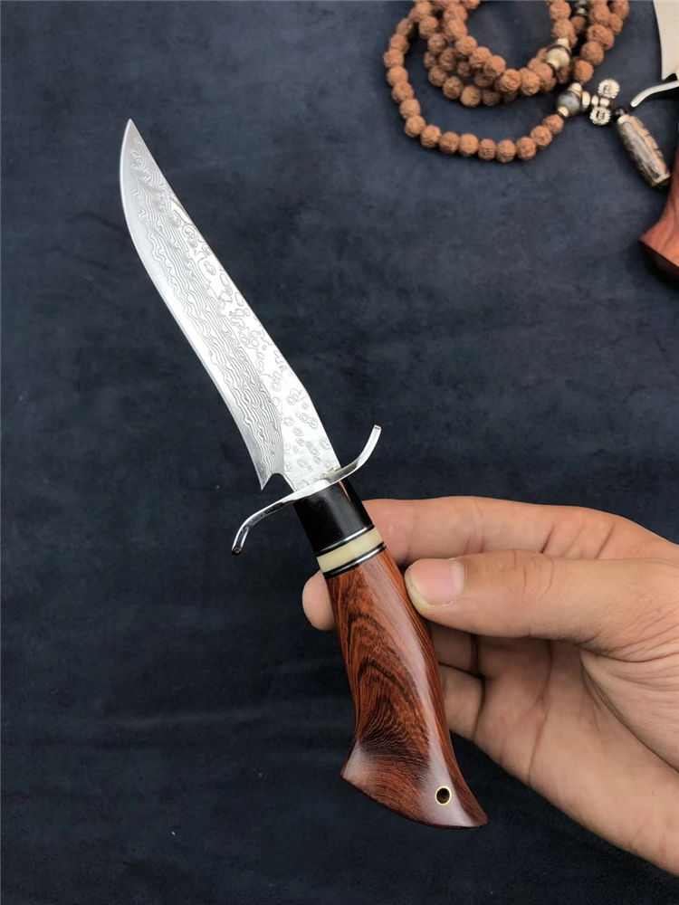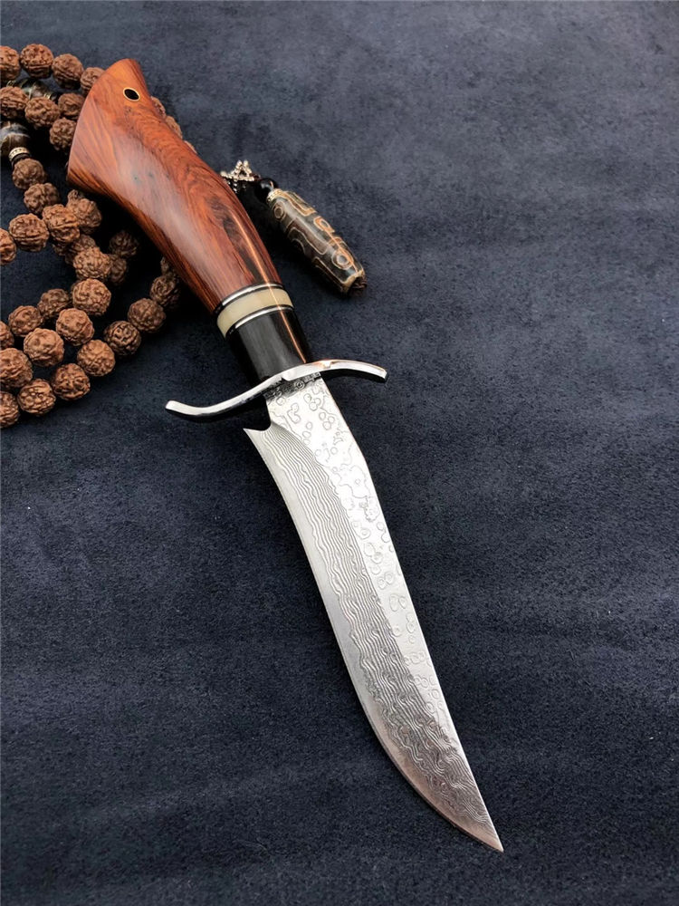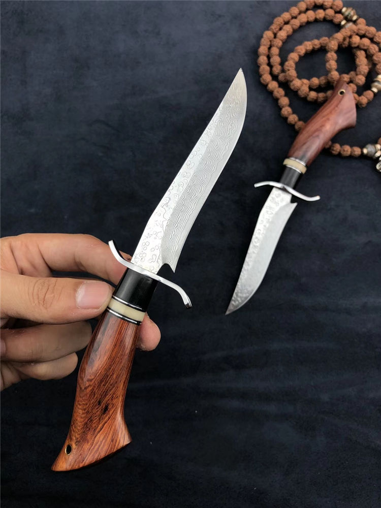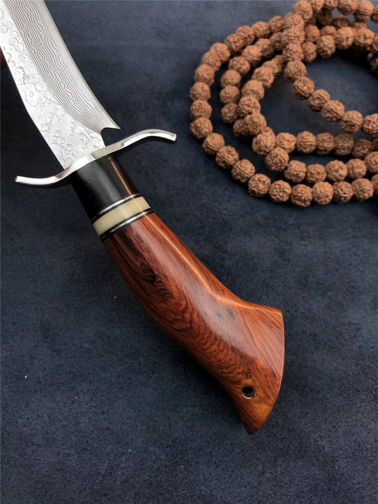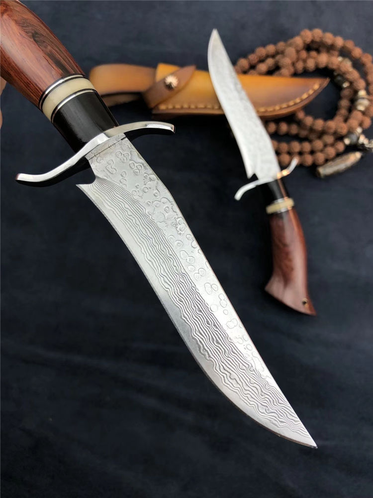 大马士革小博弈直刀 总长:200mm 刃长:105mm 刃厚:2.5mm 硬度:60-62HRC超高硬度 热处理:真空深冷热处理油淬 柄材:非洲进口红木+钢头+骆驼骨+黑檀 皮套:意大利手工缝线头层牛皮刀鞘 包装:精美盒子包装,非常上档次