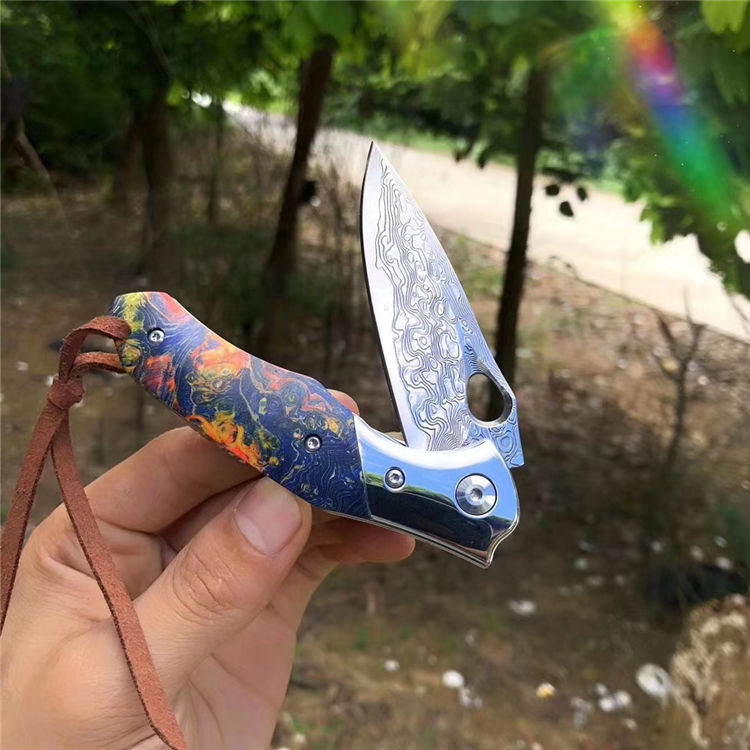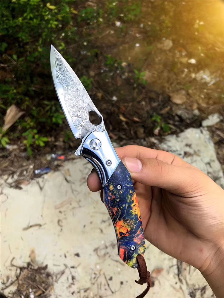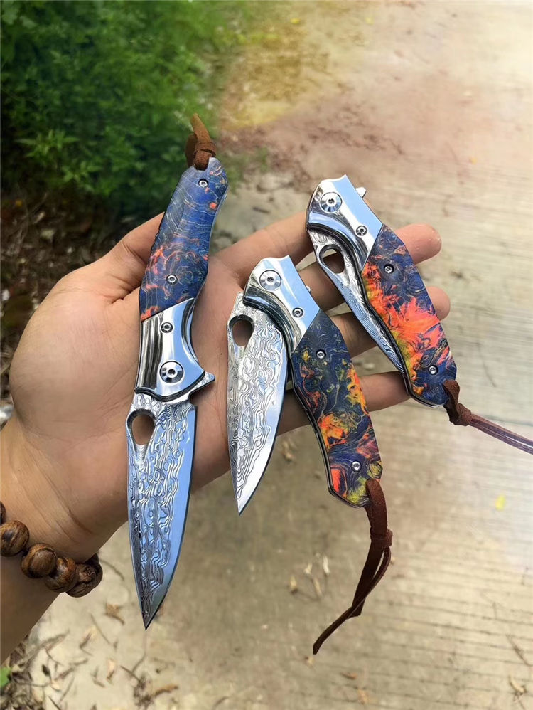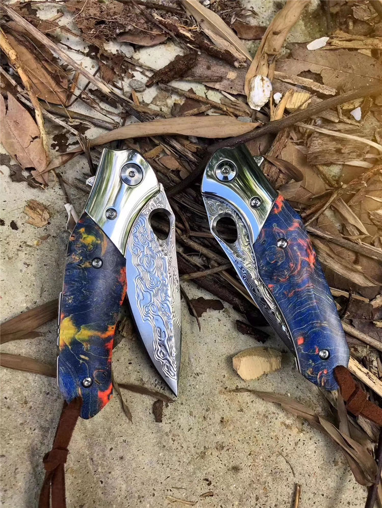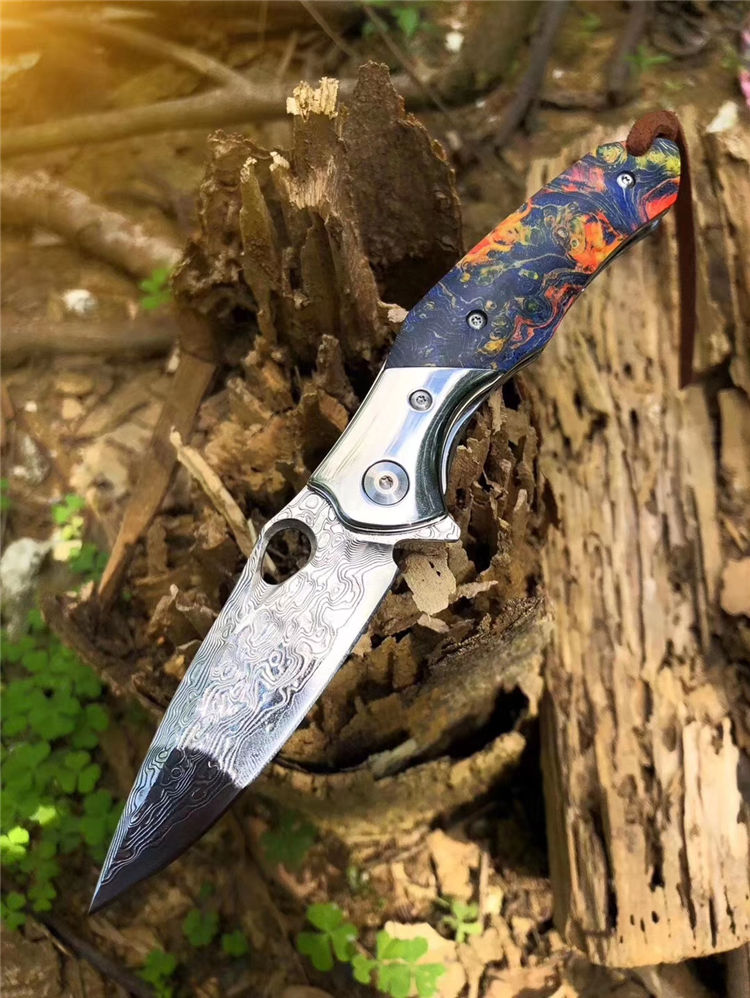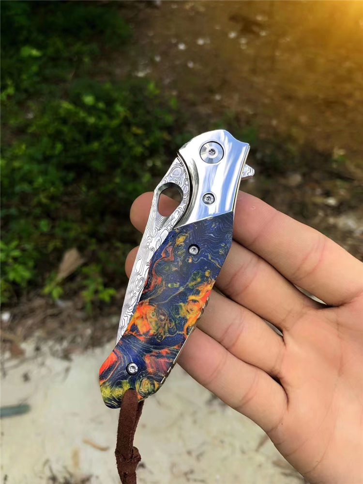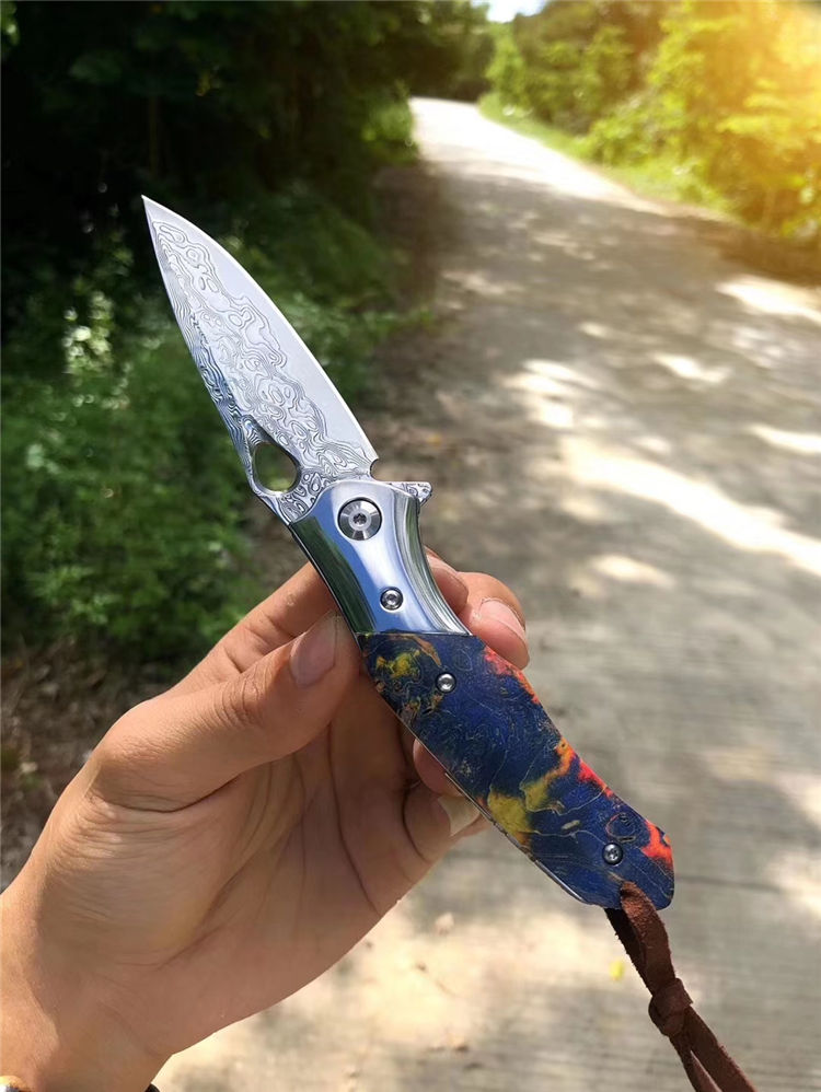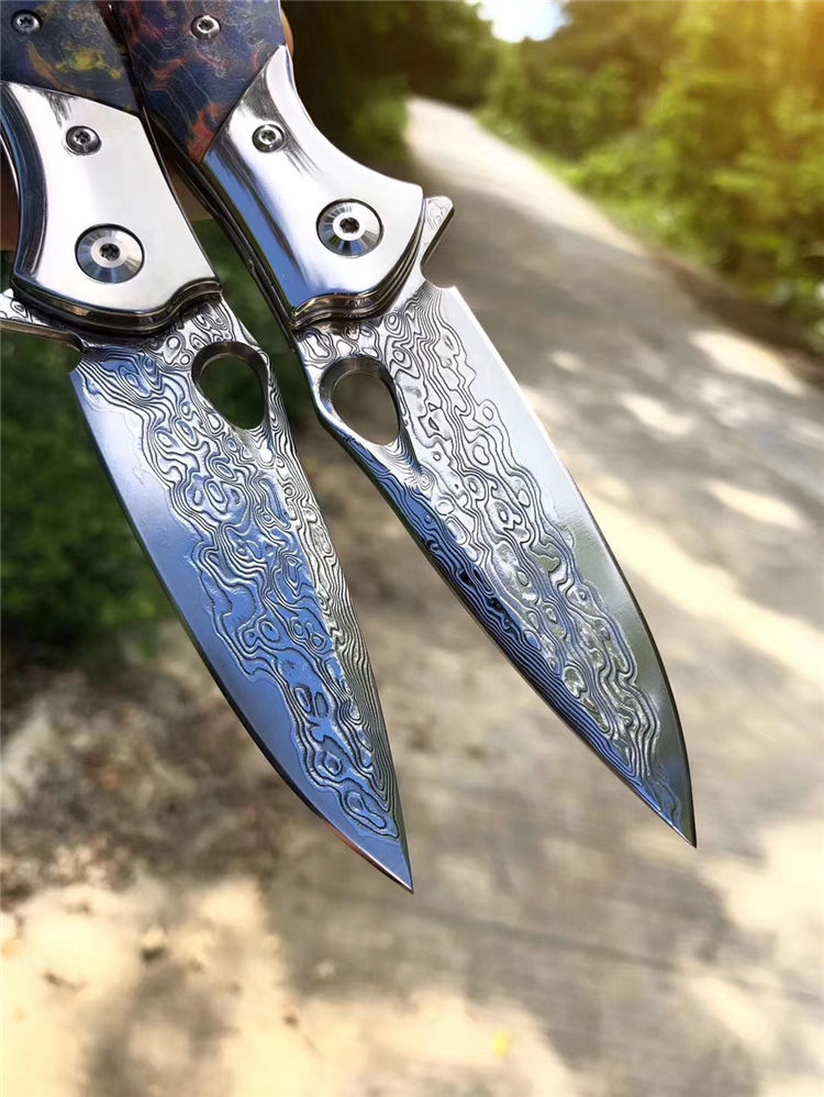 大马士革幻翅快开折刀 总长:18.5cm 刃长:8cm 闭合:10cm 刃宽:2.2cm 厚度:3mm 刃材:进口锻造大马士革VG10钢,专业高温真空处理 硬度:60HRC 开刃方式:经二次水冷手工开刃 手柄:轴承滚珠开合+304钢头+进口固化稳定木 包装:黑色手工小盒