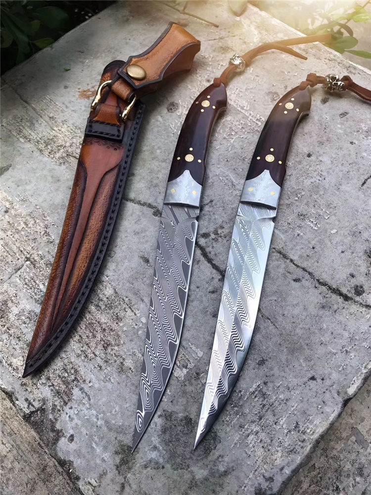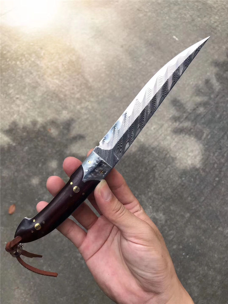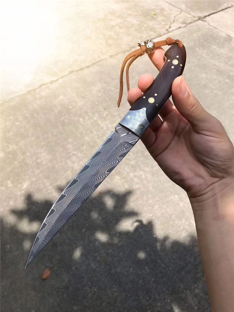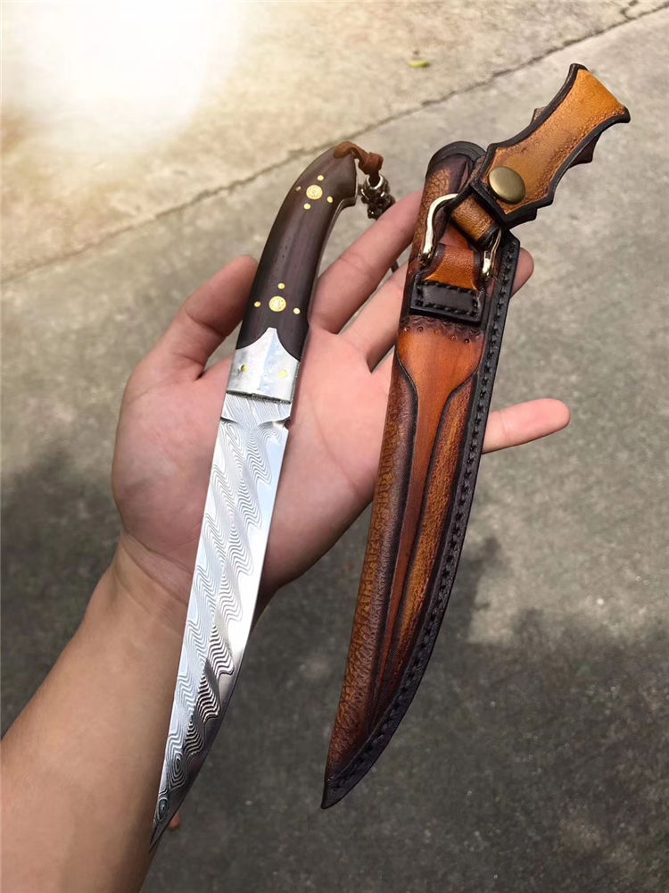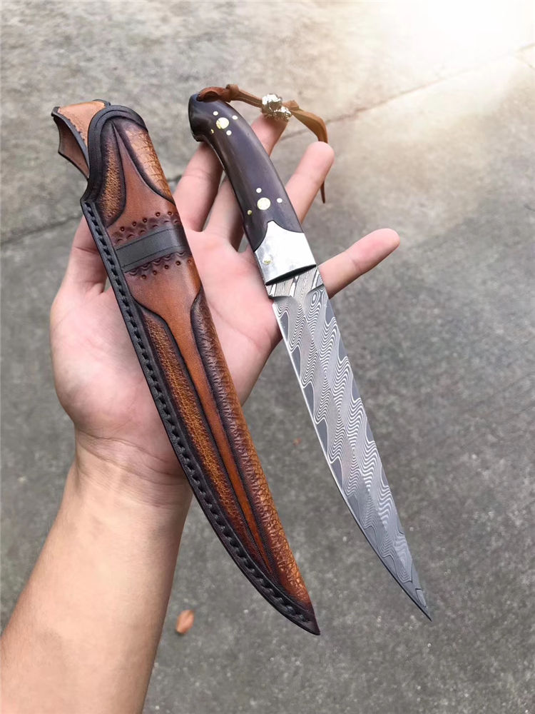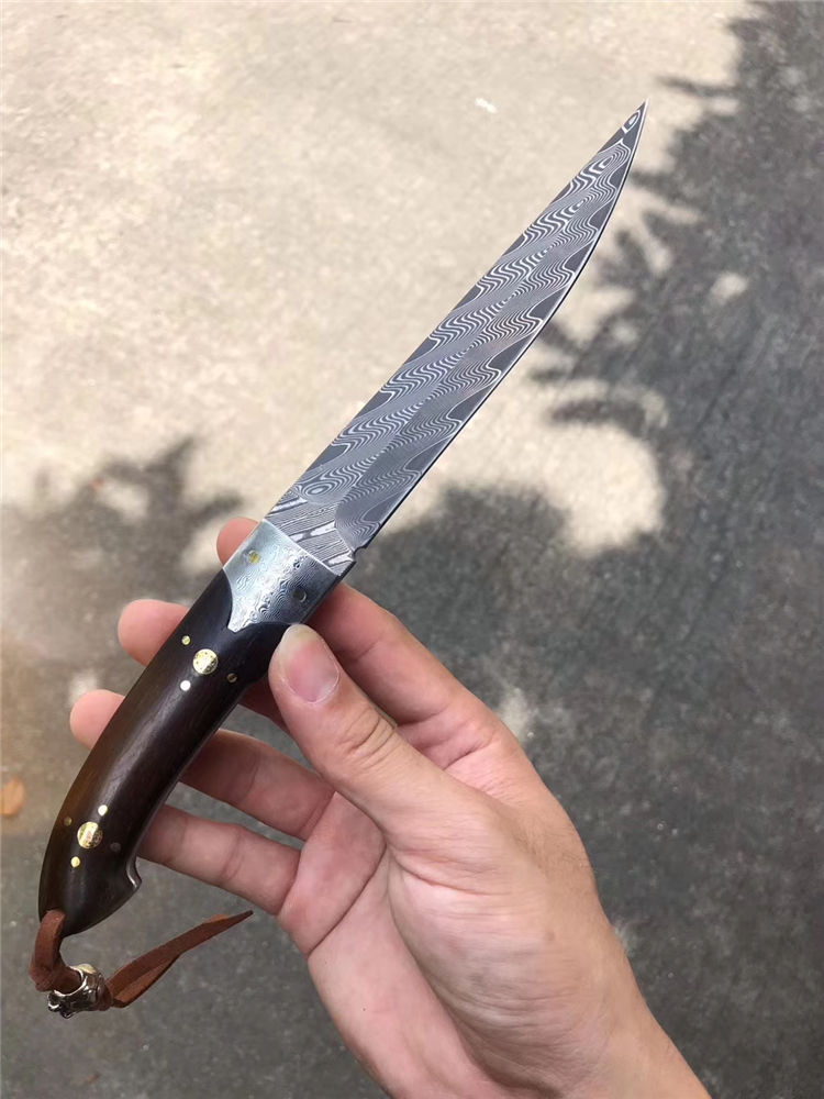 大马士革罗曼大师直刀 总长:26.5cm 刃长:14.2cm 刃厚:3.5mm 刃宽:2.6cm 重量:162g 钢材:美国锻造大马士革钢VG10钢材,韧性锋利度保持性非常好 硬度:60-62HRC 热处理:真空深冷油淬热处理 结构方式:一体龙骨结构锻造大马,钢头采用大马钢,镶嵌花钉固定 柄材:进口大叶紫檀木 皮套:意大利进口优质植鞣皮,国内专业手工大师制作,纯手工缝线着色 包装:手工盒子包装