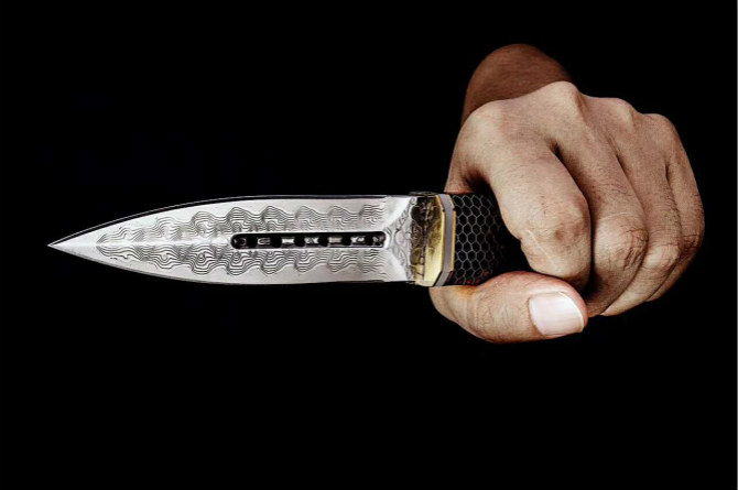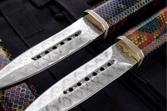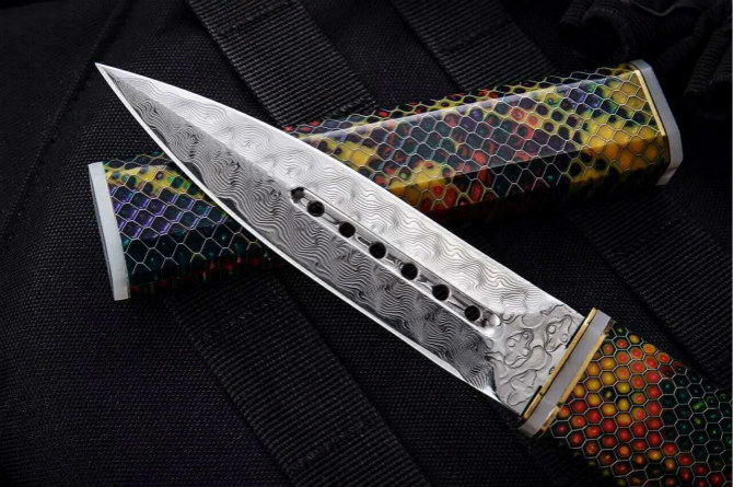 大马士革幻彩蜂窝魔剑 全长:23cm 刃长:12cm 柄长:11cm 刃宽:2.6cm 厚度:0.15cm 柄材:幻彩蜂窝铝+G10+铜头 刀鞘:幻彩蜂窝铝+G10+铜头 刃材:有芯层大马士革钢 硬度:58-60HRC 重量:约250g(含包装) 表面:大马士革锻打祥云花纹原色 此产品全新理念设计,彩用工程航空蜂窝铝,优点主要有:承受力强,构造精巧、适用户外用轻巧方便,能够防水,防潮,防火(三防绝对OK)(注意:每一把蜂窝铝彩色不规则的)