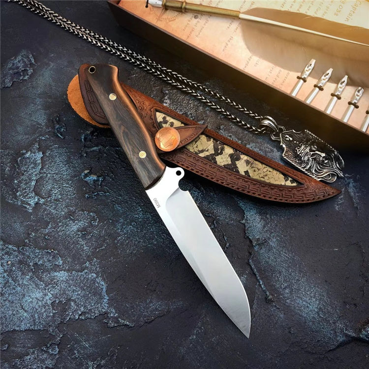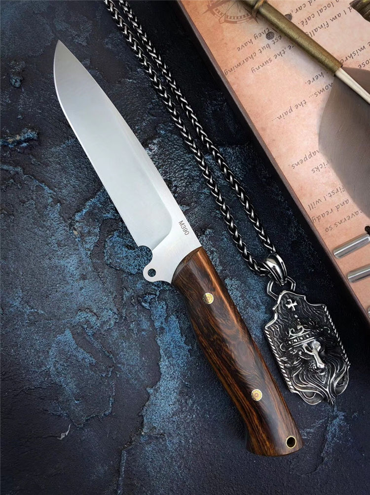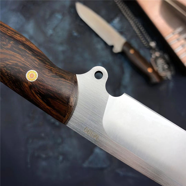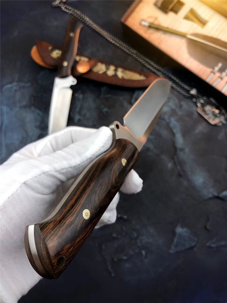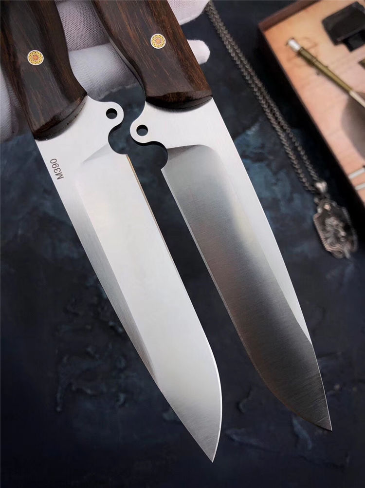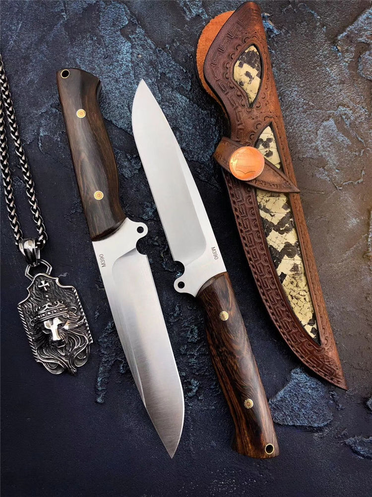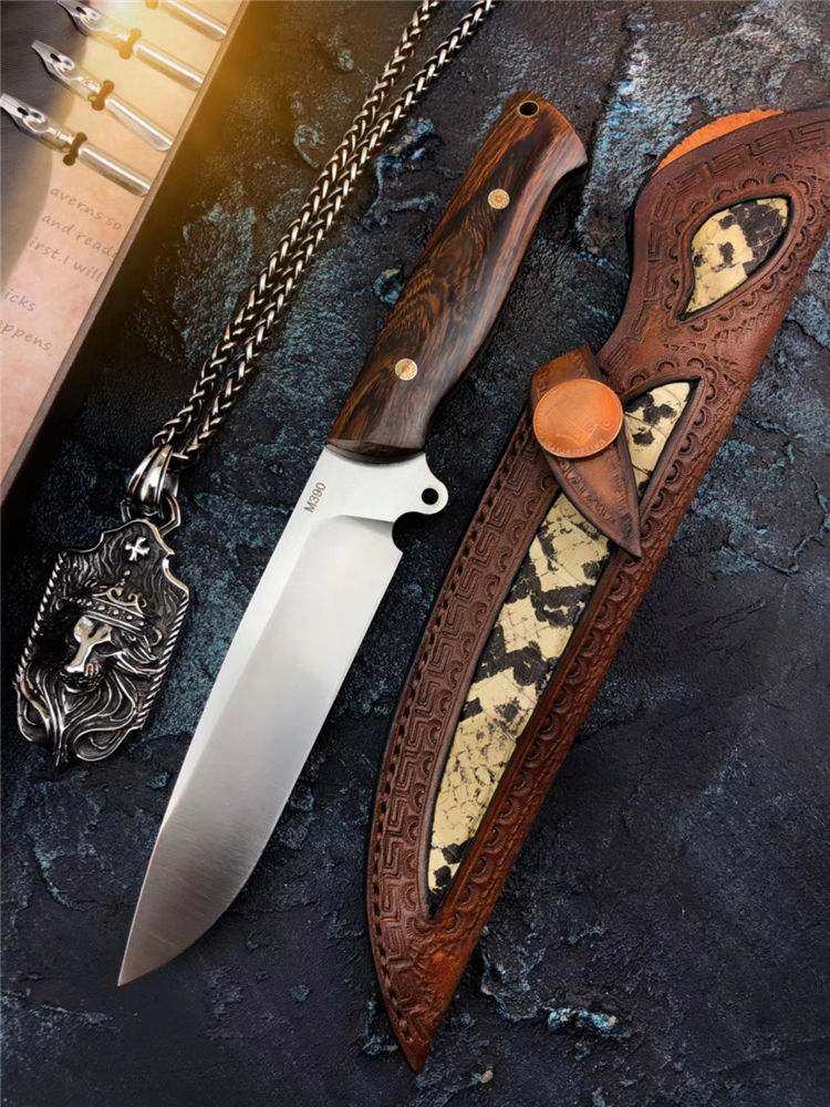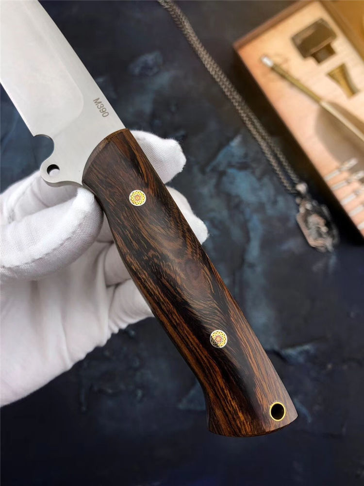 M390粉末钢诺德直刀 全长:23cm 刃长:12.5cm 柄长:10cm 刃最宽处:3.2cm 刃厚:4MM 钢材:进口M390粉末一体钢 硬度:61-62HRC,上海专业真空热处理 表面:手工拉丝效果 柄材:进口美国砂铁木 皮套:意大利植鞣皮纯手工雕花镶嵌蛇皮刀套