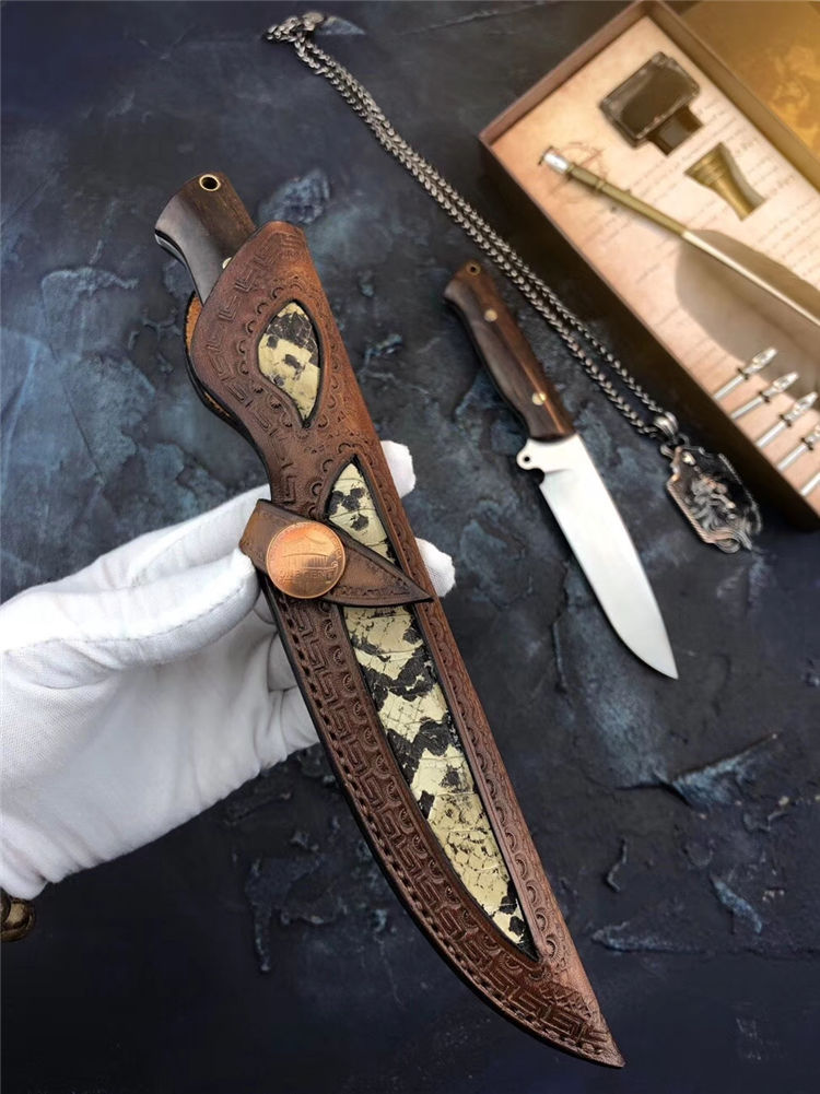 皮套:意大利植鞣皮纯手工雕花镶嵌蛇皮刀套