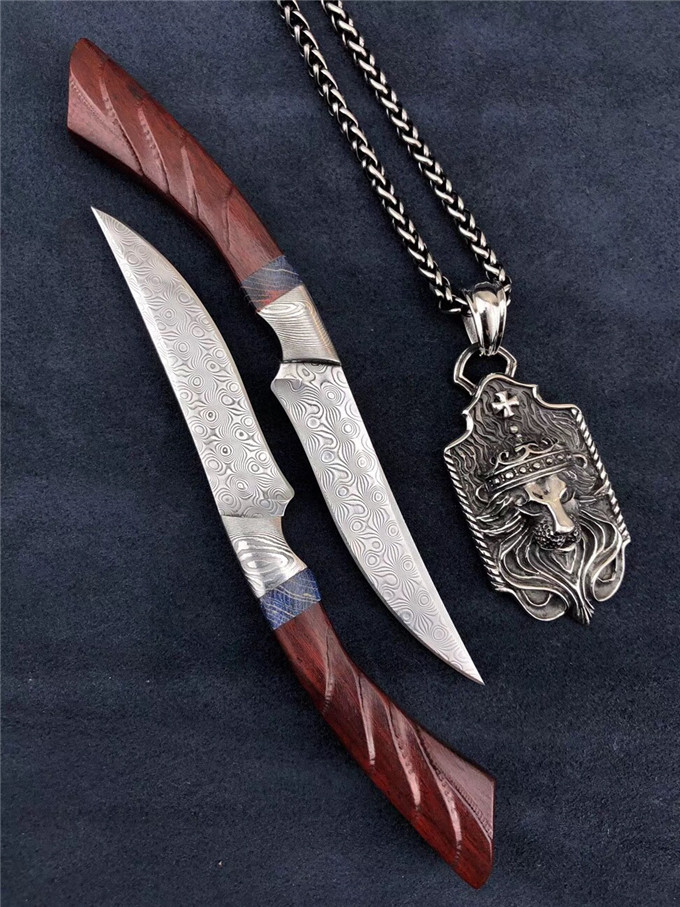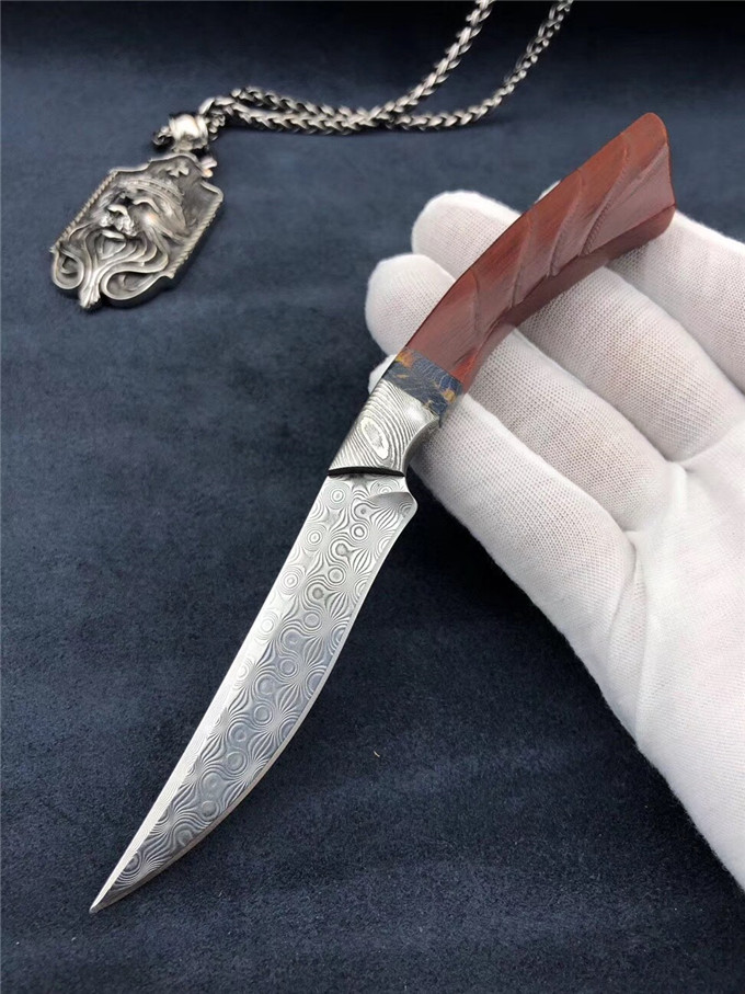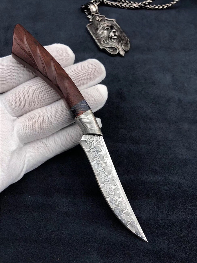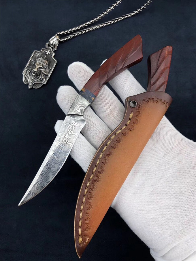 大马士革凤凰鸟直刀 全长:17cm 刃长:8cm 厚度:2.5mm 柄长:9cm 刃宽度:2cm 刃钢材:进口锻造大马士革无芯层钢 硬度:60HRC 手柄:大马扭曲纹钢头+稳定木隔片+科檀木 皮套:手工缝线复古刀套