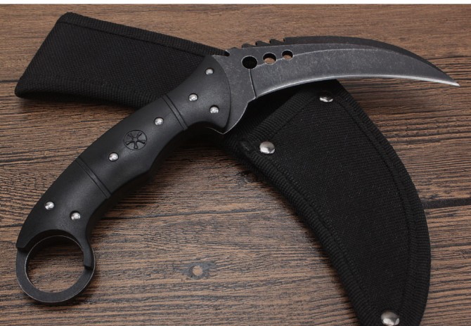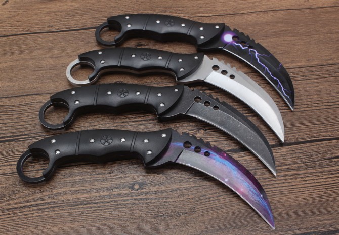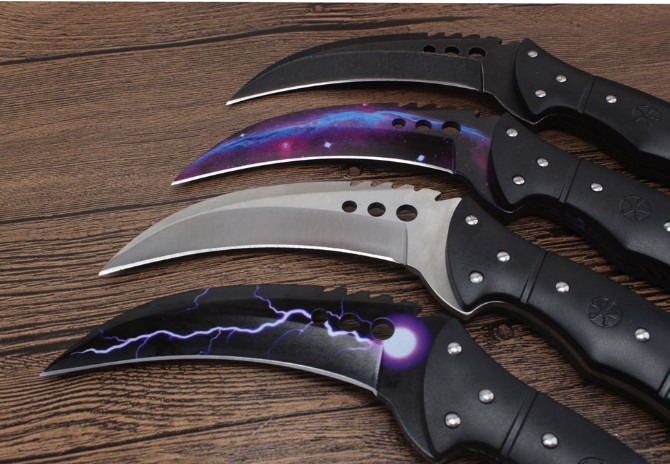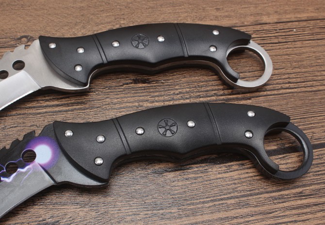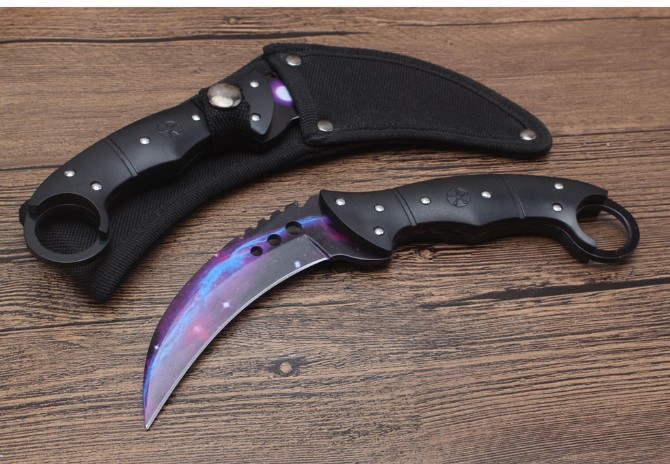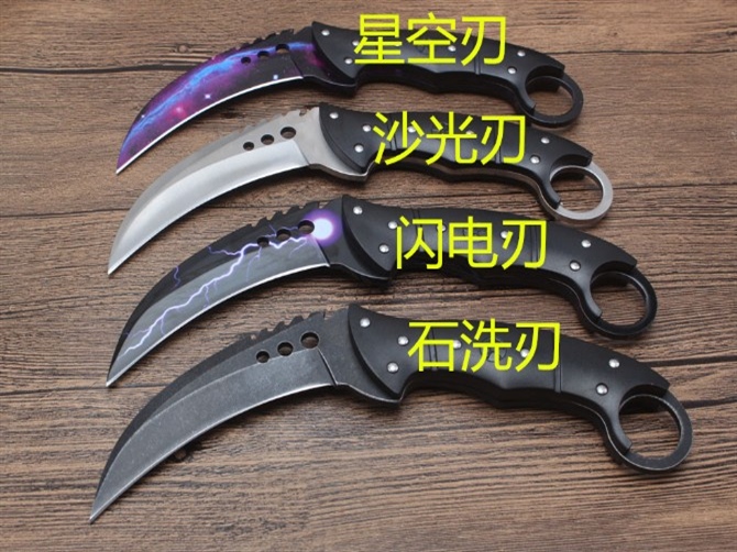经济版反恐精英CSGO据齿爪刀 钢材:7cr18mov 全长:21.8cm 刃长:10.6cm 刃厚:0.4cm 硬度:58HRC 柄材:一体钢+尼龙纤维 刃表面:沙光版/沧桑石洗版/星空版/闪电版 刀鞘:加厚尼龙鞘 总重:约245G(包装) 包装:黑色纸盒