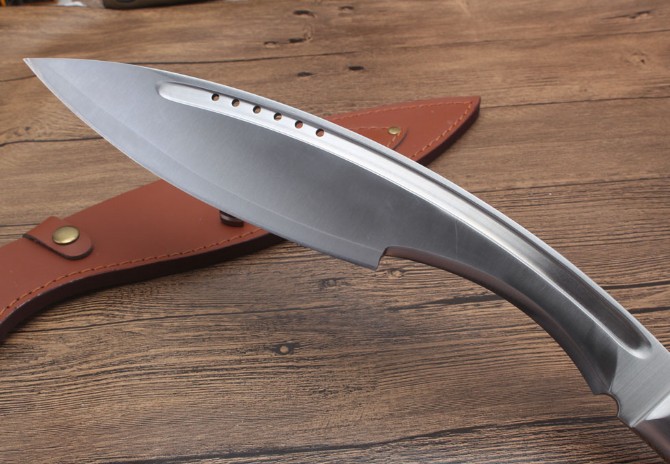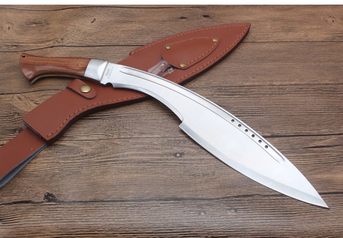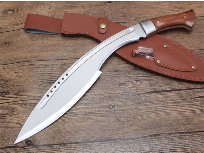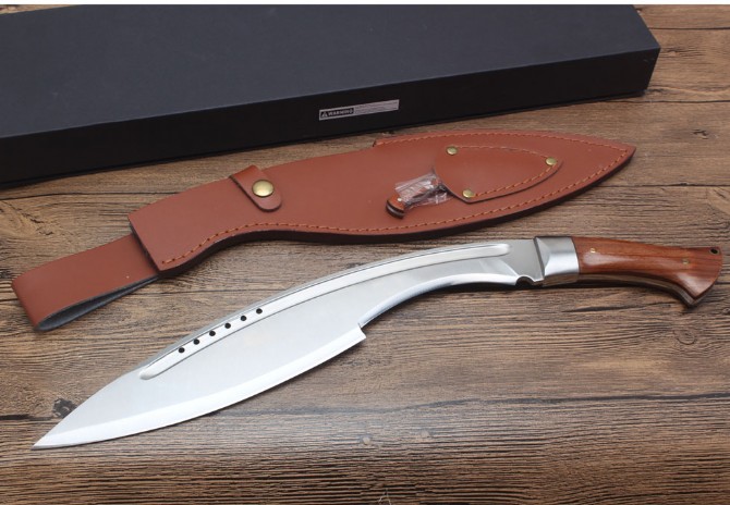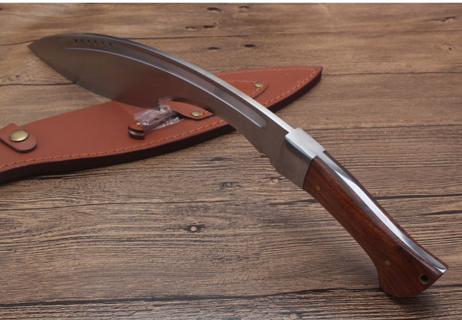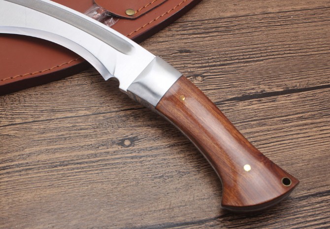 玄武狗腿弯刀 全长:480cm 刃长:450cm 宽度:60cm 厚度:0.60cm 硬度:58 钢材:7洛钢 柄材:一体钢酸枝木 表面:沙光 重量:1027g含包装 刀鞘:皮革刀套,配礼品盒小刀