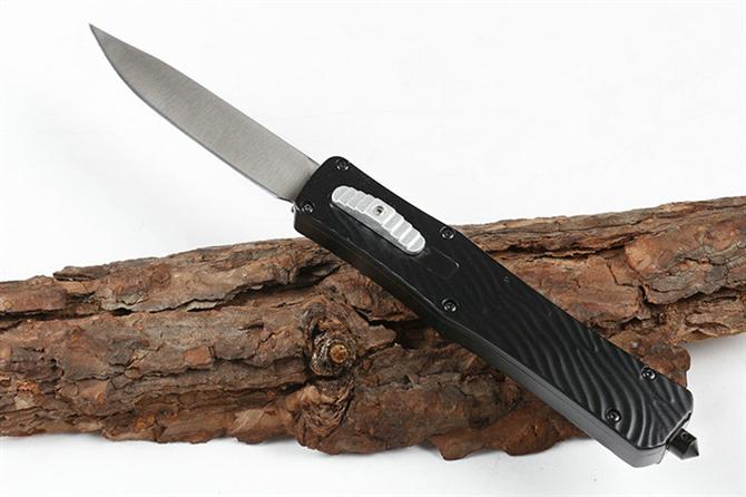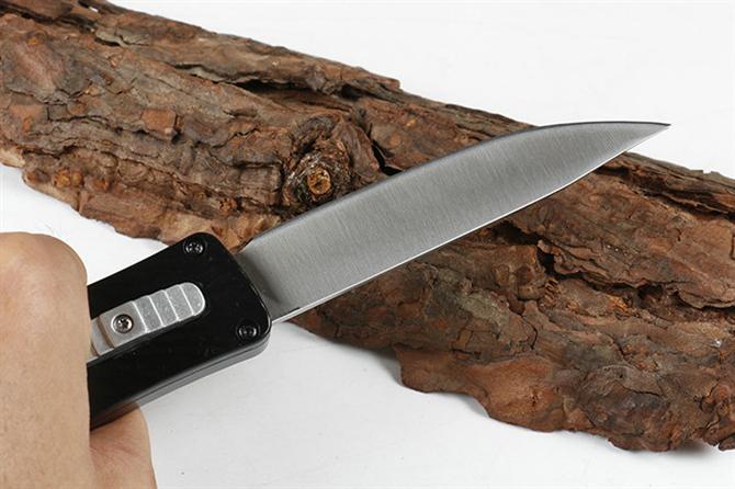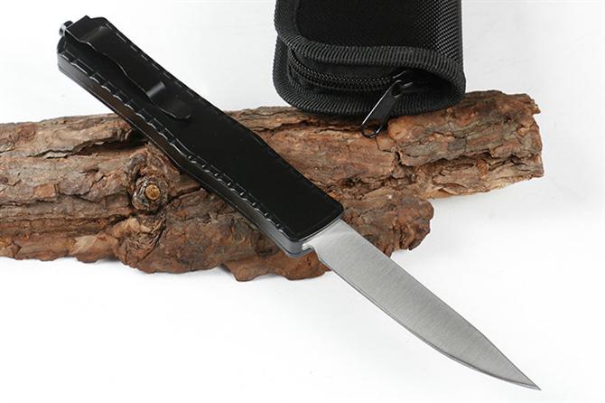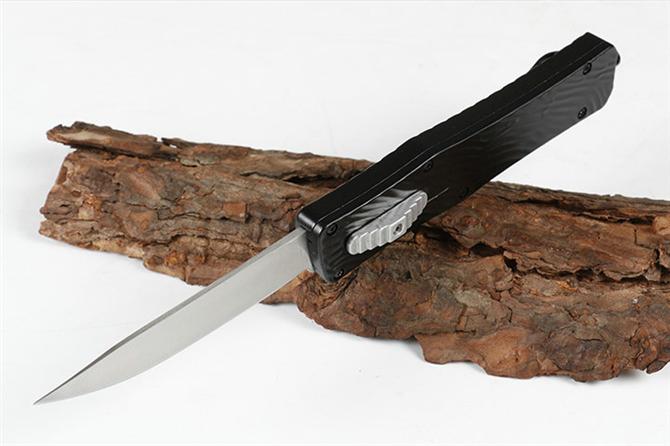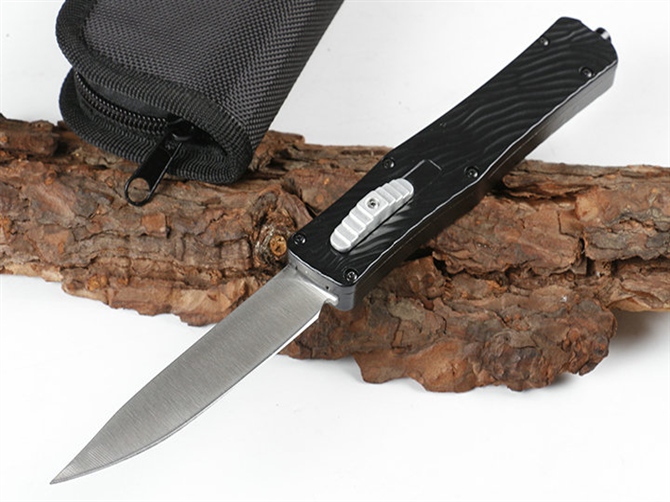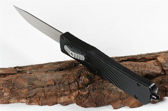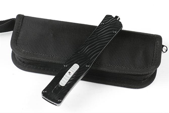 黑复仇者2直出跳刀 类型:直出弹簧刀 品牌:微技术MICROTECH 全长:24.5cm(含尾锥长度) 刃长:10.0cm 刃厚:2.9mm 刃材:440 硬度:57HRC 总重量:295.0克(含包装物) 表面:沙光(刀刃) 柄材:锌铝合金 刀鞘:尼龙 锁闭:弹簧直出 备注:带背夹