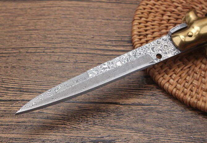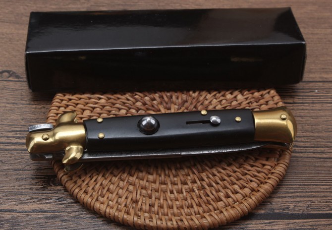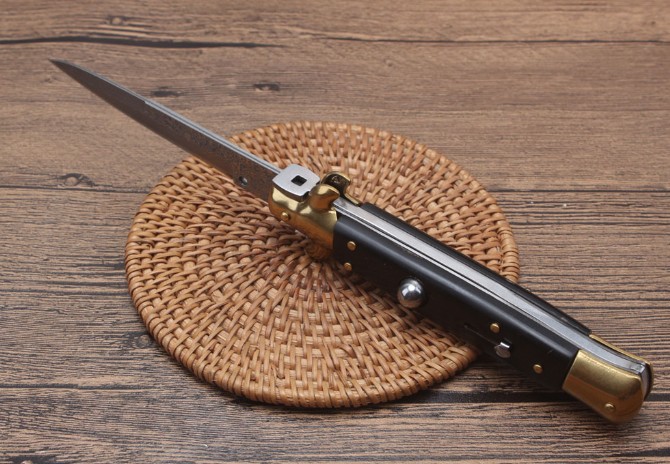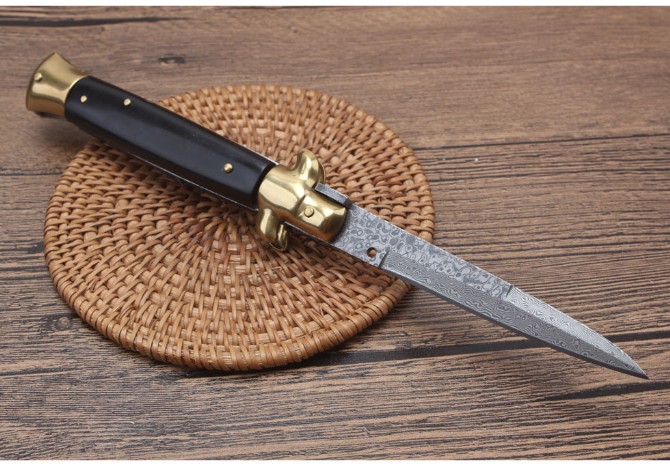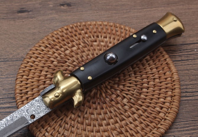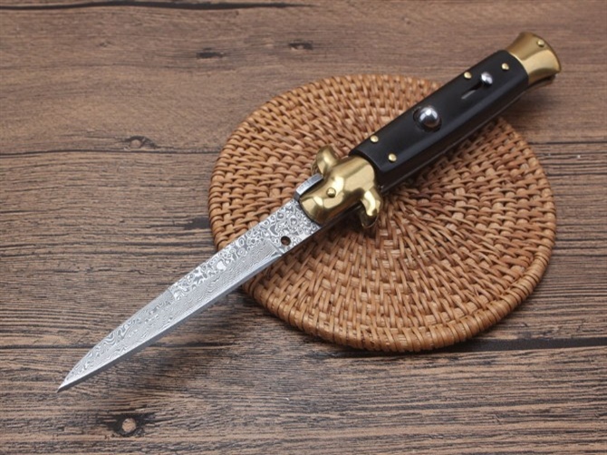 大马士革9寸AKC意大利黑牛角跳刀 全长:22.9mm 刃长:10.2mm 柄长:13cm 刃宽:1.2cm(最宽处) 刃厚:3.0mm 刃材:大马士革刃 刀柄:黑牛角 开刀方式:弹簧 重量:135克 包装:纸盒