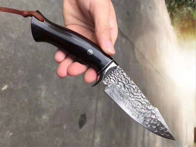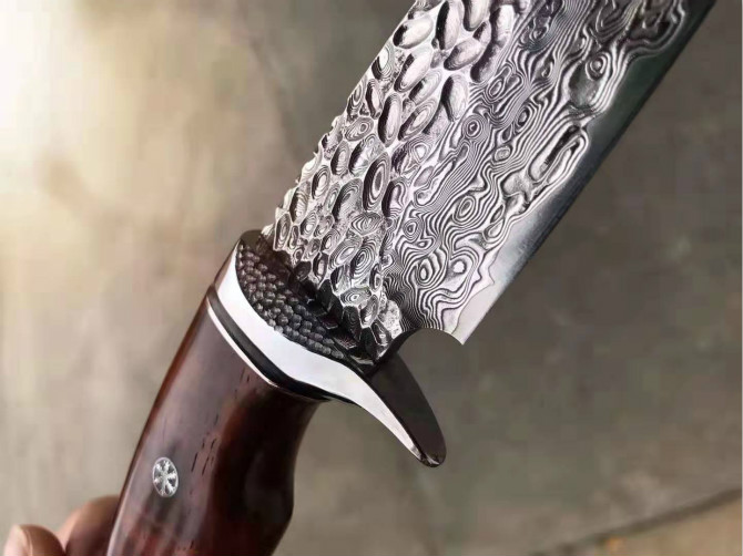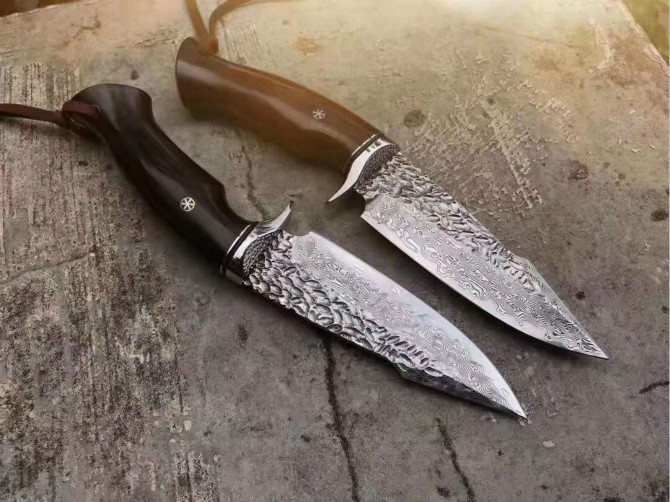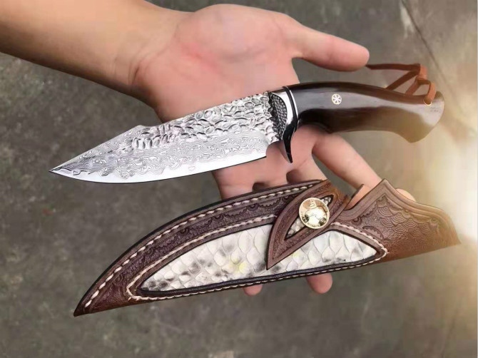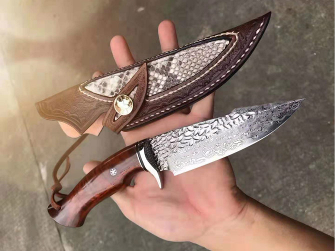 大马士革旬者直刀 总长:23.5cm 刃长:11cm 刃厚:4.5mm 刃宽:3.5cm 钢材:日本公司进口VG10锻造大马士革钢,78层 热处理:专业真空热处理,韧性很好 硬度:60-61HRC 柄材:进口微粒黄檀木/进口黑檀木,一体龙骨结构入柄内,花钉锁定 表面处理:手工搓花凹凸点装饰设计,抛光效果 皮套:意大利优质进口植鞣皮,国内大师设计纯手工制作雕花镶嵌蛇皮,复古怀旧棕色 包装:复古手工盒子