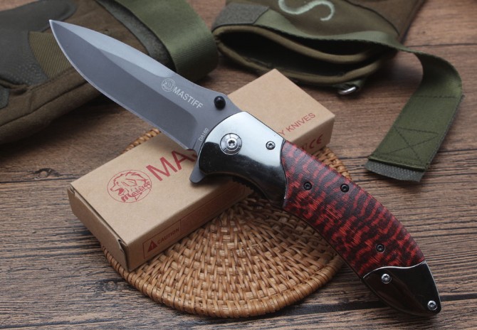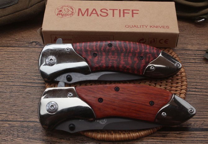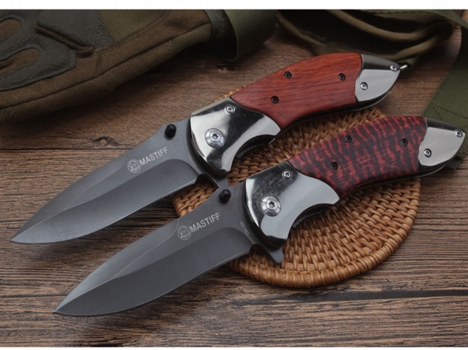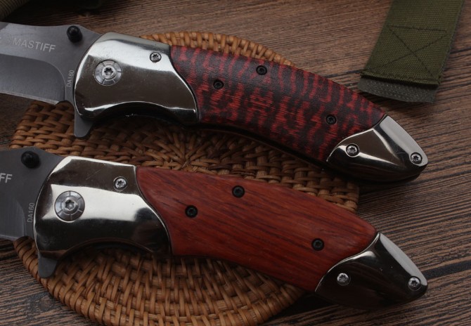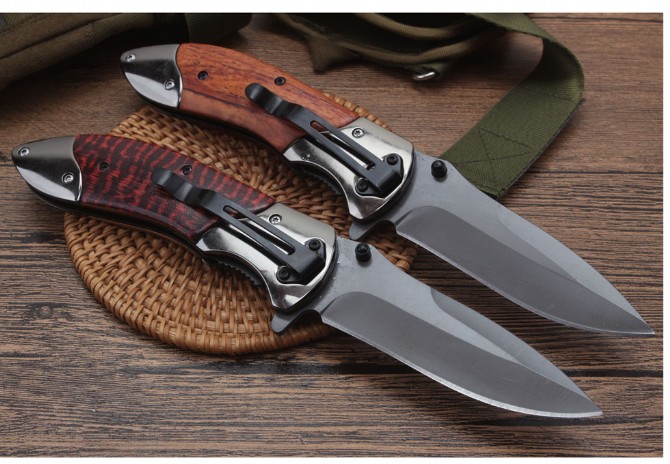 DA160快开折刀 全长:22.1cm 刃长:9.6cm 柄长:12.4cm 刃宽:2.6cm 刃厚:3.0mm 刃材:440 重量:174(含包装) 硬度:57HRC 表面:灰钛 柄材:双钢头+酸枝木 锁型:线锁 其他:配厂盒