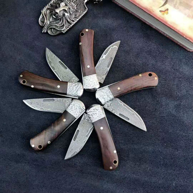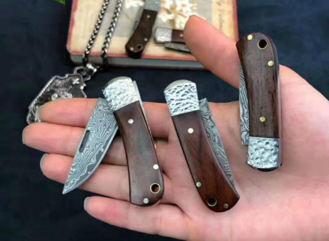 大马士革小松豆折刀 总长:10.3cm 刃长:4.3cm 折合长:5.8cm 厚度:2.2mm 刃材:大马士革钢 硬度:59-60HRC,真空热处理 柄材:微粒黄檀木 包装:迷你小礼品盒包装