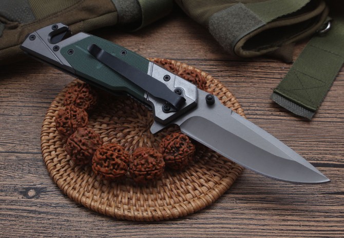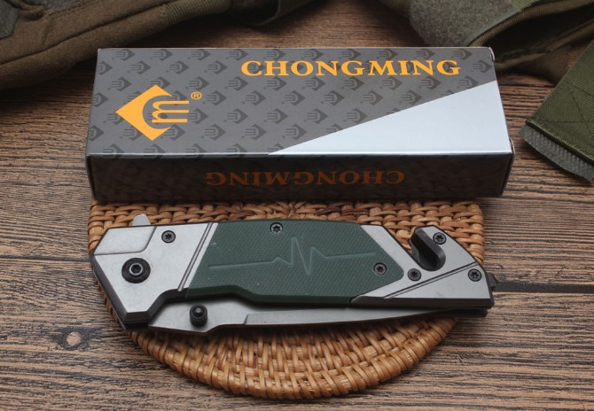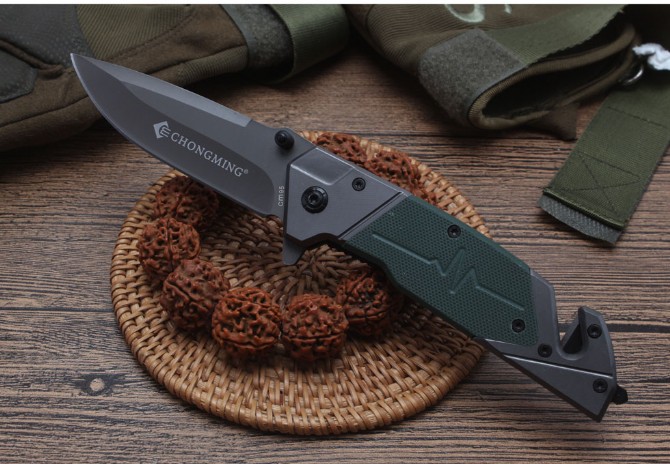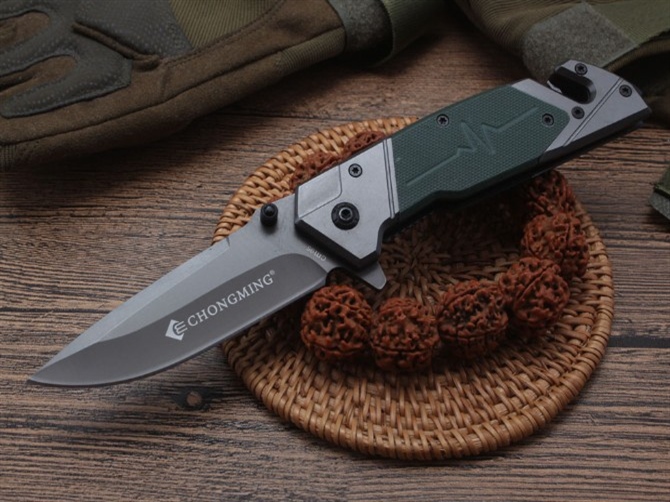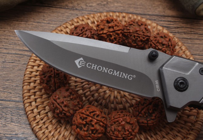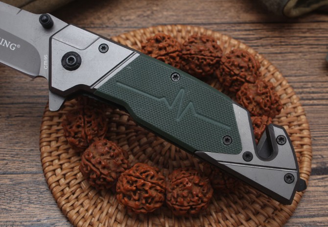 CM95快开折刀 全长:20.2cm 刃长:8.5cm 柄长:11.8cm 刃宽:2.6cm 刃厚:2.9mm 刃材:440 重量:184(含包装) 硬度:57HRC 表面:灰钛 柄材:钢片+G10 锁型:线锁 其他:配厂彩盒