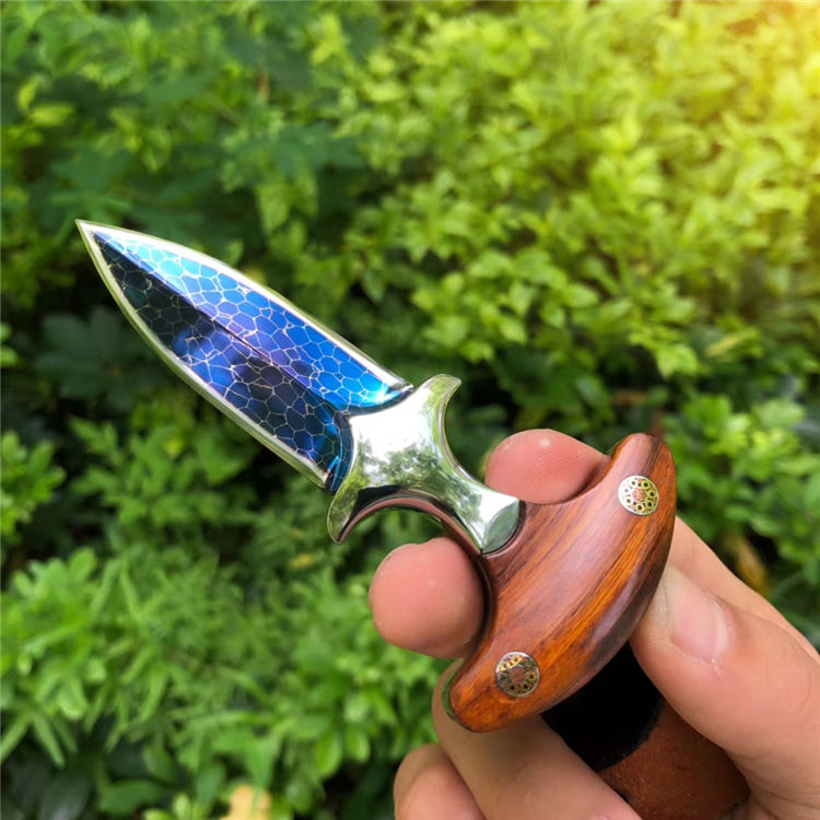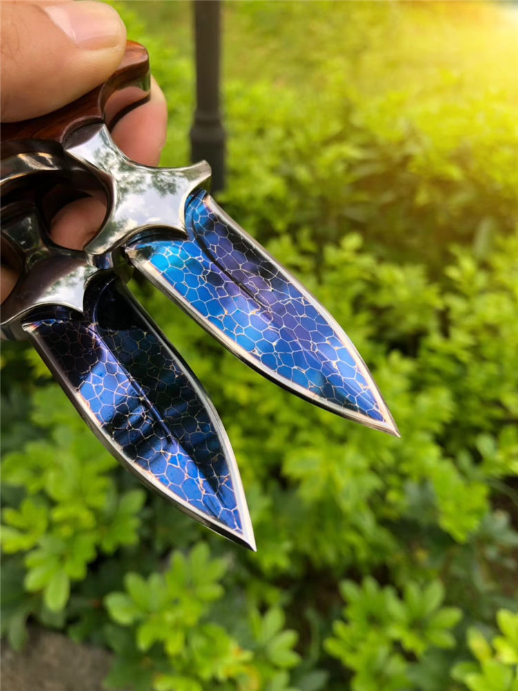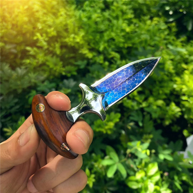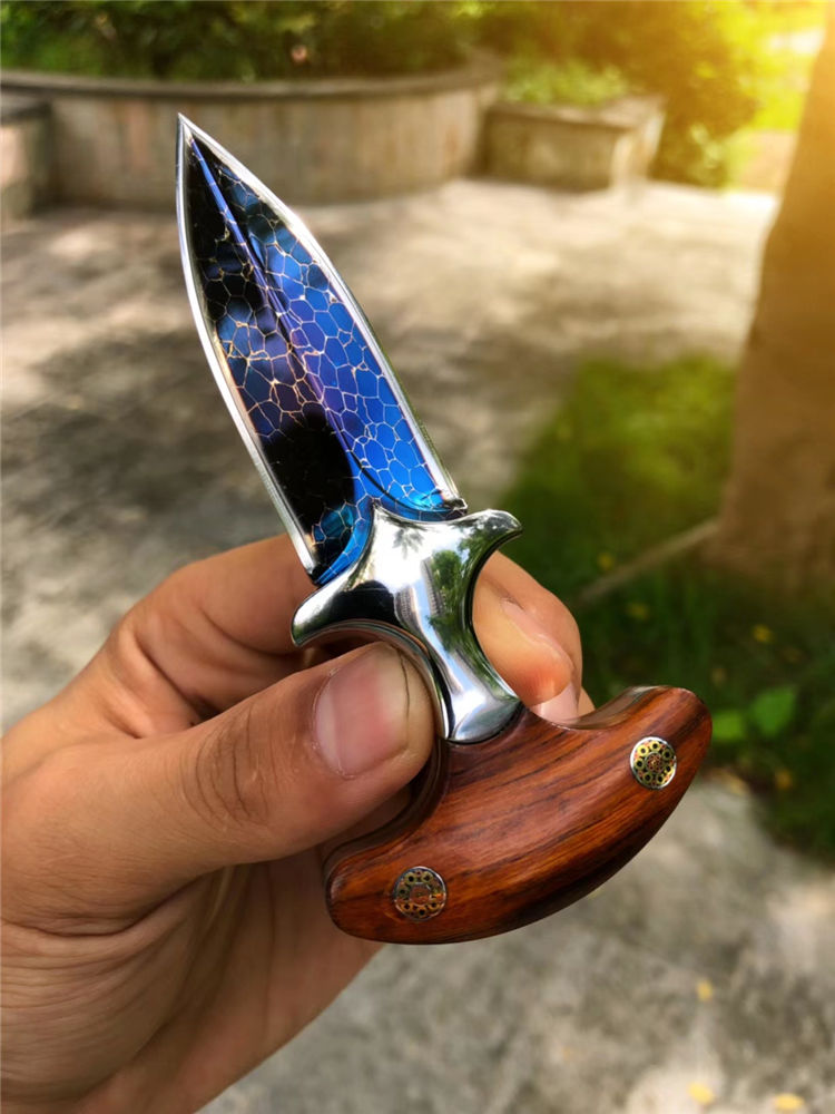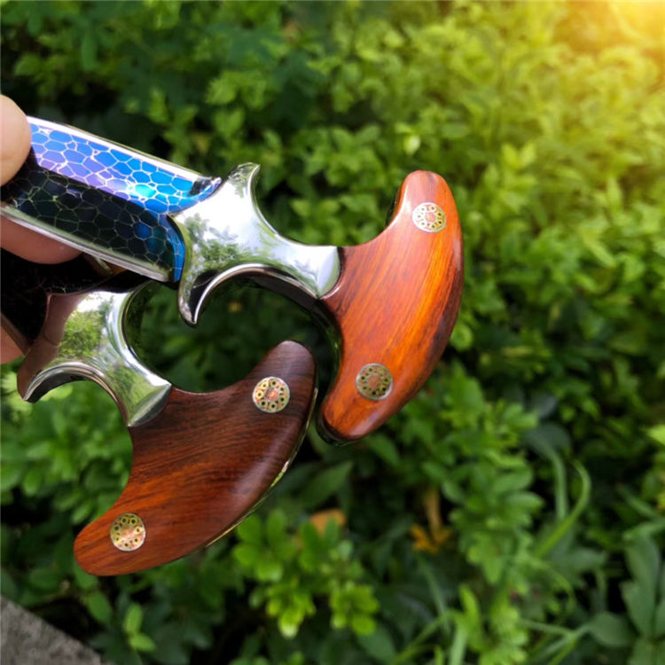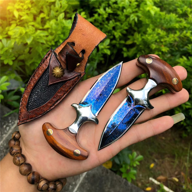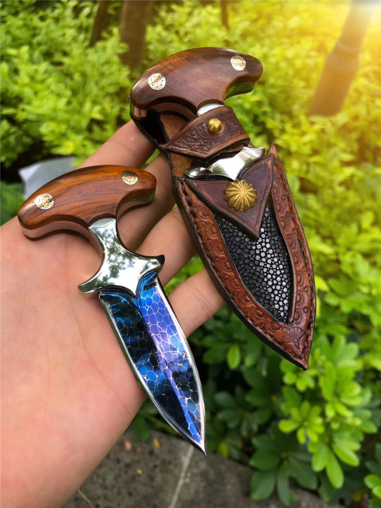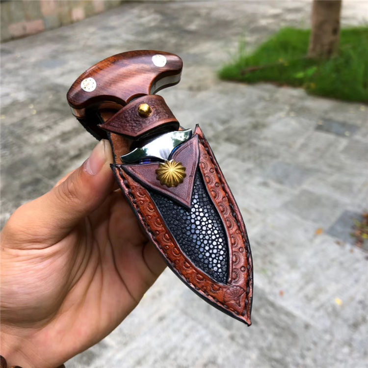 大马士革星云手刺 总长:11cm 刃长:6cm 柄长:4.5cm 刃宽:2.2cm 厚度:4mm 刃材:进口星云大马士革钢 硬度:60-61HRC,高温真空热处理 柄材:一体成型钢头+黄铜垫片+进口砂铁木 皮套:意大利进口植鞣皮手工制作镶嵌珍珠魔鬼鱼皮