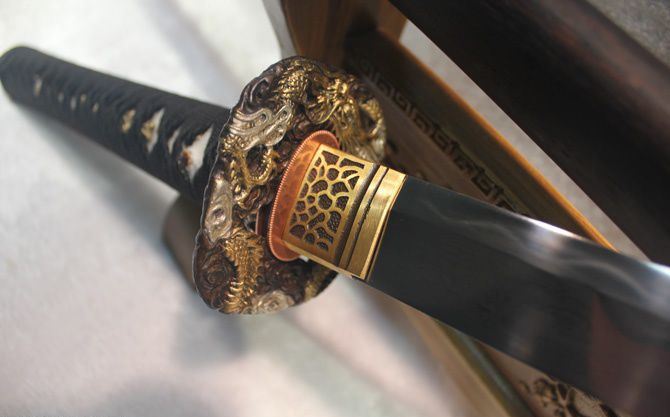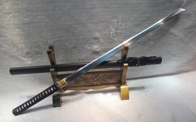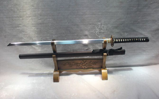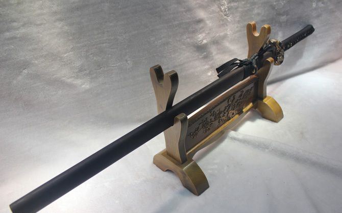 藤野日本忍士长刀(花纹钢覆土烧刃) 全长:100cm 刃长:72cm 柄长:27cm 刃宽:3.2cm 刃厚:0.75cm 全重:1400g 鞘重:280g 刃材:花纹钢古法覆土烧刃 装材:全铜,鎏金鎏银 鞘材:花梨木 柄材:硬木,精细扎绳 硬度区间:58—62HRC 性能:全开锋,削纸断竹砍铁 备注:手工产品存在误差,规格仅供参考,请以实物为准!