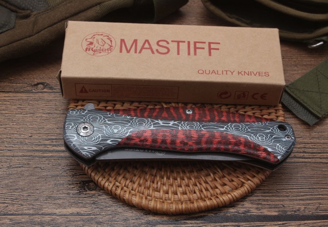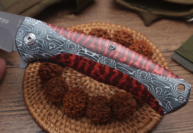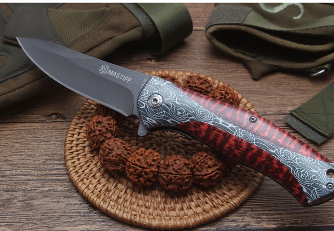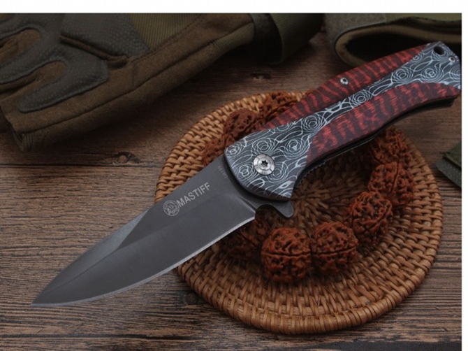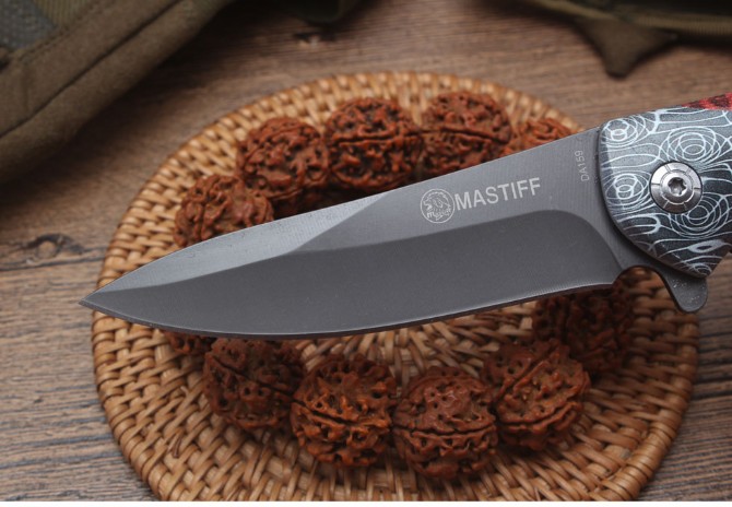 DA159快开折刀 全长:21.8cm 刃长:9.2cm 柄长:12.5cm 刃宽:2.6cm 刃厚:2.5mm 刃材:440 重量:234(含包装) 硬度:57HRC 表面:灰钛 柄材:全钢+3D打图 锁型:线锁 其他:配厂盒