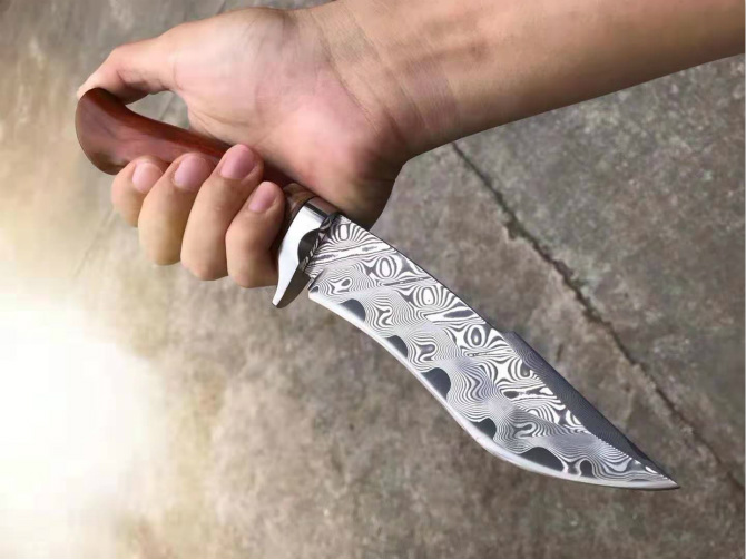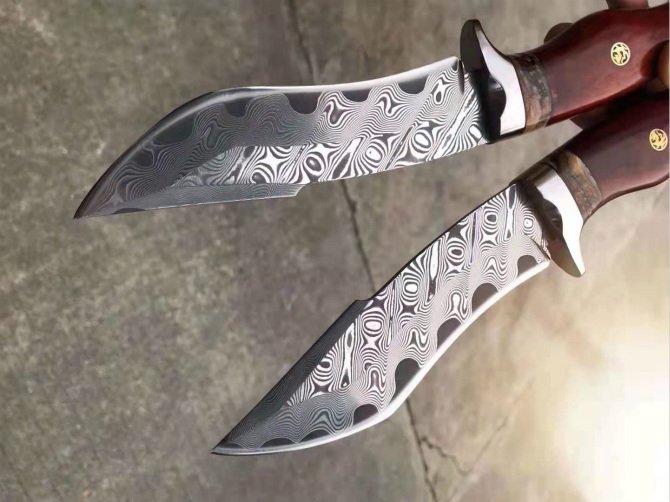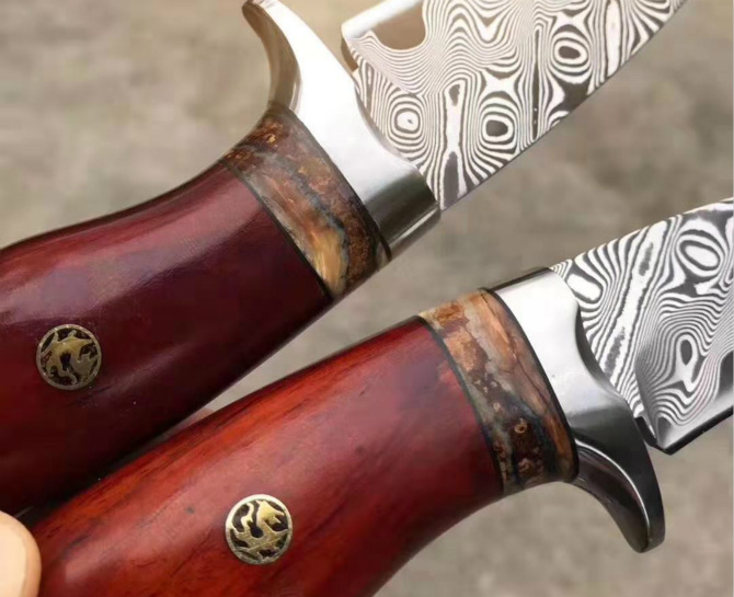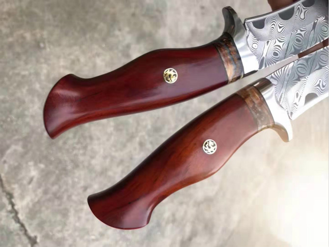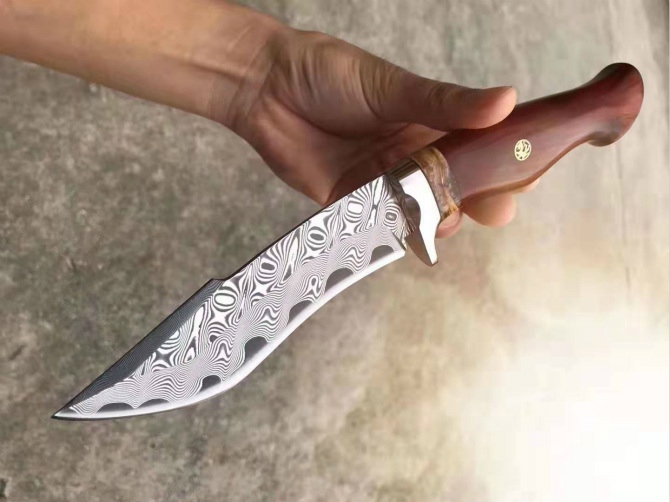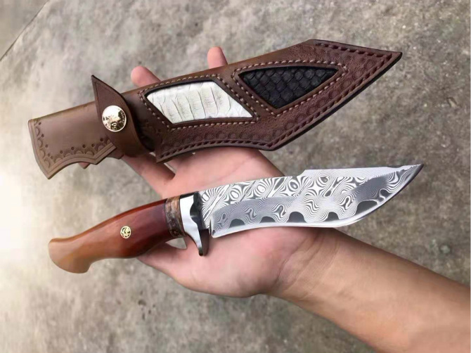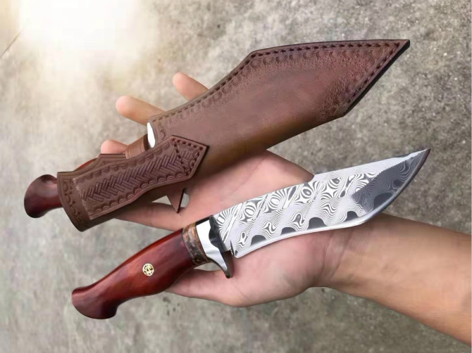 大马士革狼牙直刀 总长:26.5cm 刃长:13.5cm 刃厚:4mm 刃宽:3.7cm 钢材:贸易公司提供进口锻造大马士革钢96层 硬度:60-62HRC,真空热处理,韧性锋利度非常好 柄材:进口微粒黄檀木+猛犸化石 皮套:意大利进口高端手工雕花缝线植鞣皮手工着色怀旧效果 包装:手工盒子包装