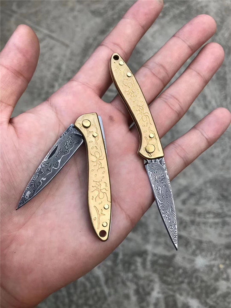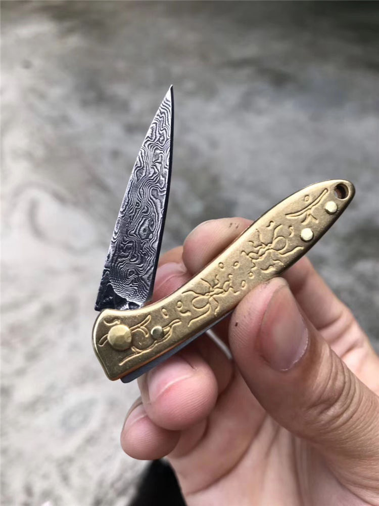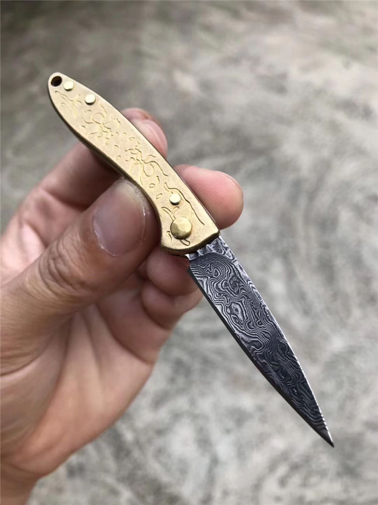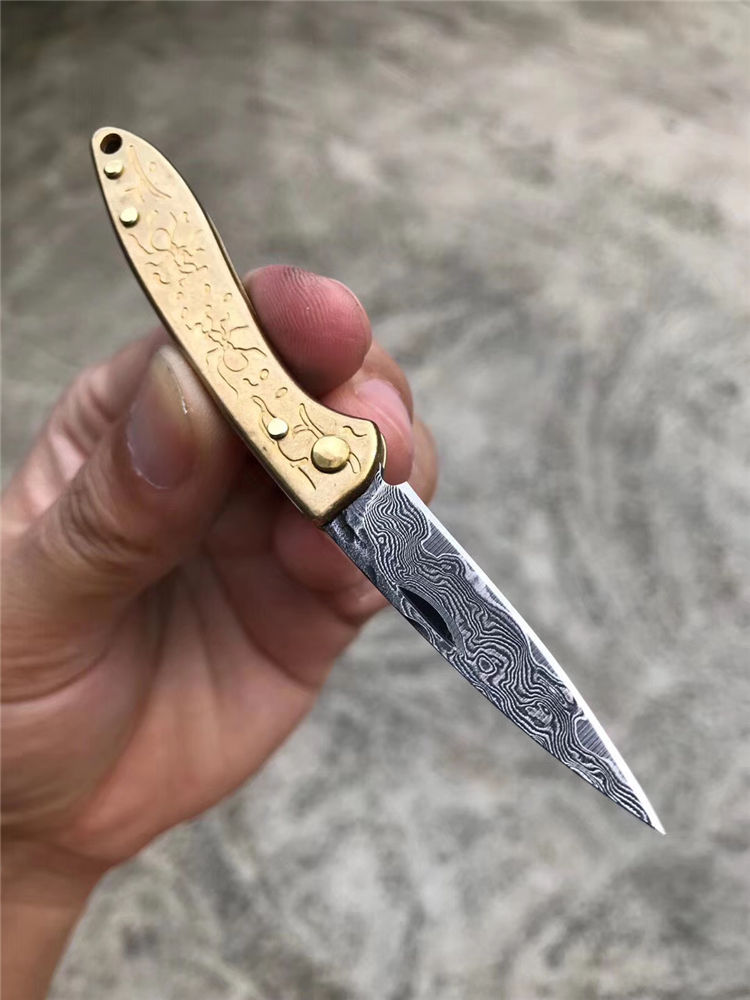 大马士革角斗蚁无锁折刀 总长:11cm 刃长4.5cm 刃厚:2.0 刃宽:1cm 重量:23g 钢材:夹层锻造大马士革钢 柄材:黄铜 表面效果:黑柄纹理层数 包装:盒子包装