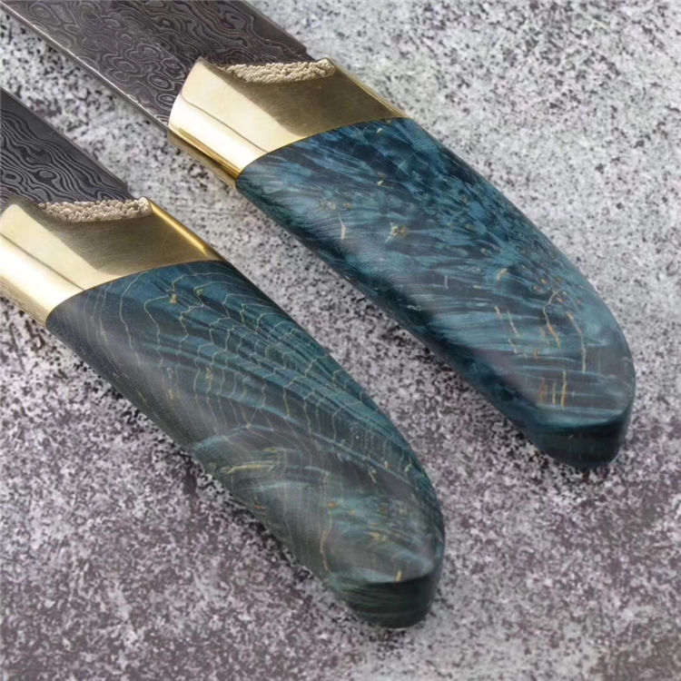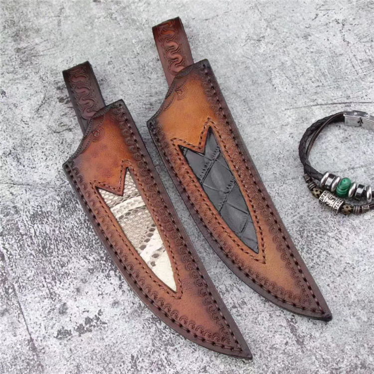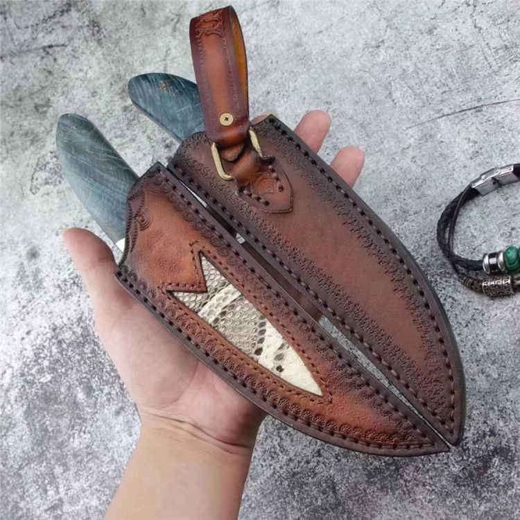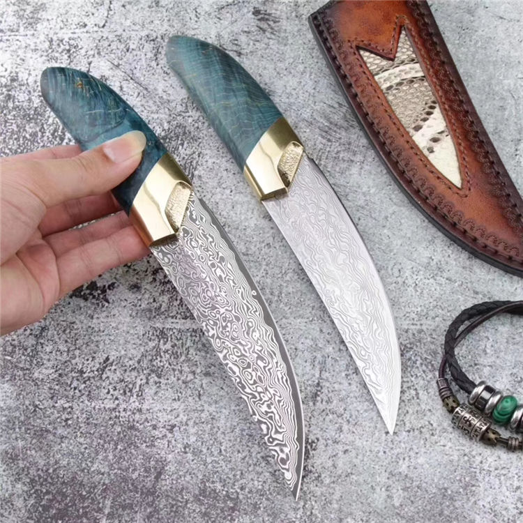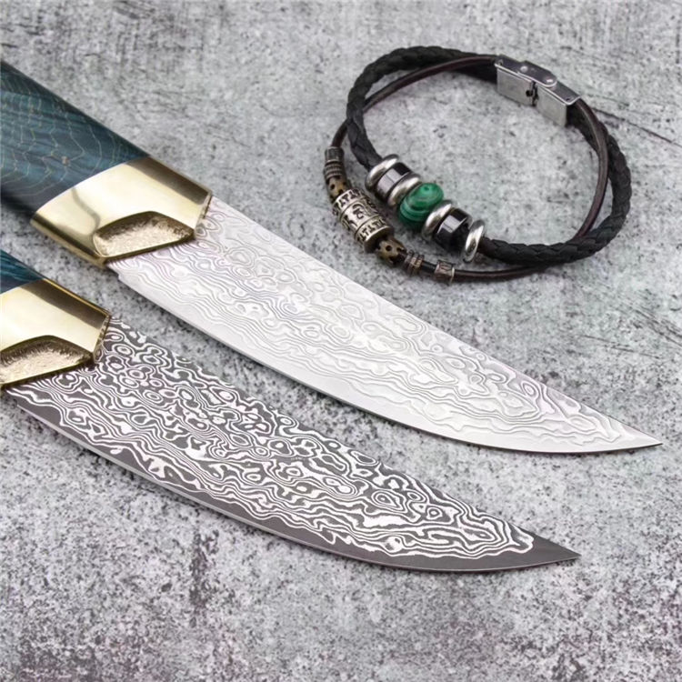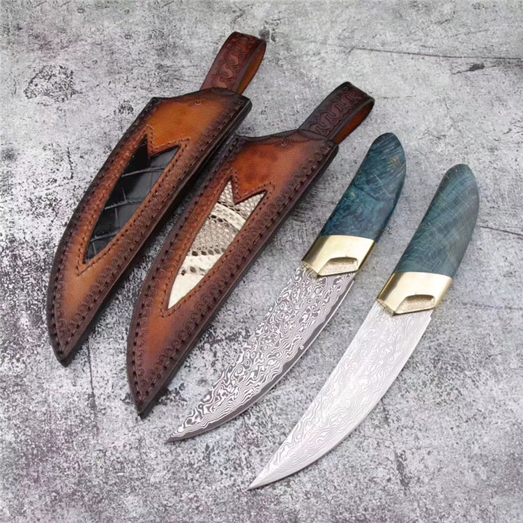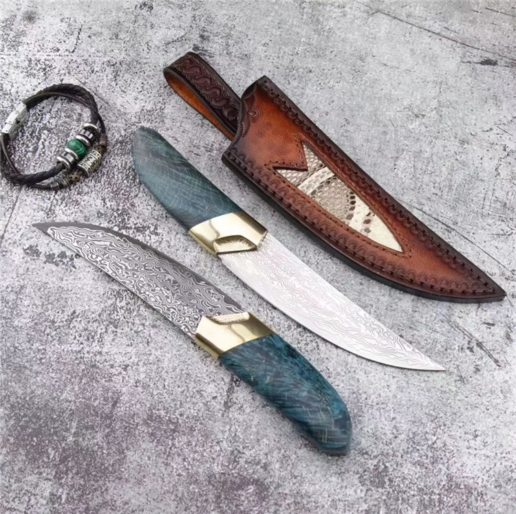 大马士革犬刃直刀 总长:24cm 刃长:13cm 刃厚:4mm 刃宽:3.4cm 钢材:进口锻造大马士革钢96层 硬度:60-62HRC,真空热处理,韧性锋利度非常好 柄材:黄铜头+进口固化稳定木材 皮套:意大利进口高端手工雕花缝线植鞣皮手工着色怀旧效果 包装:手工盒子包装