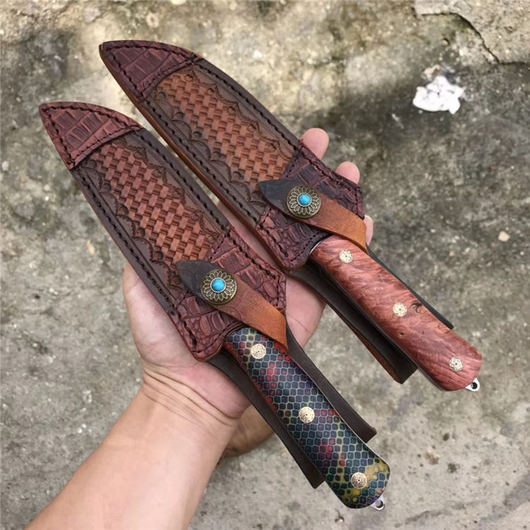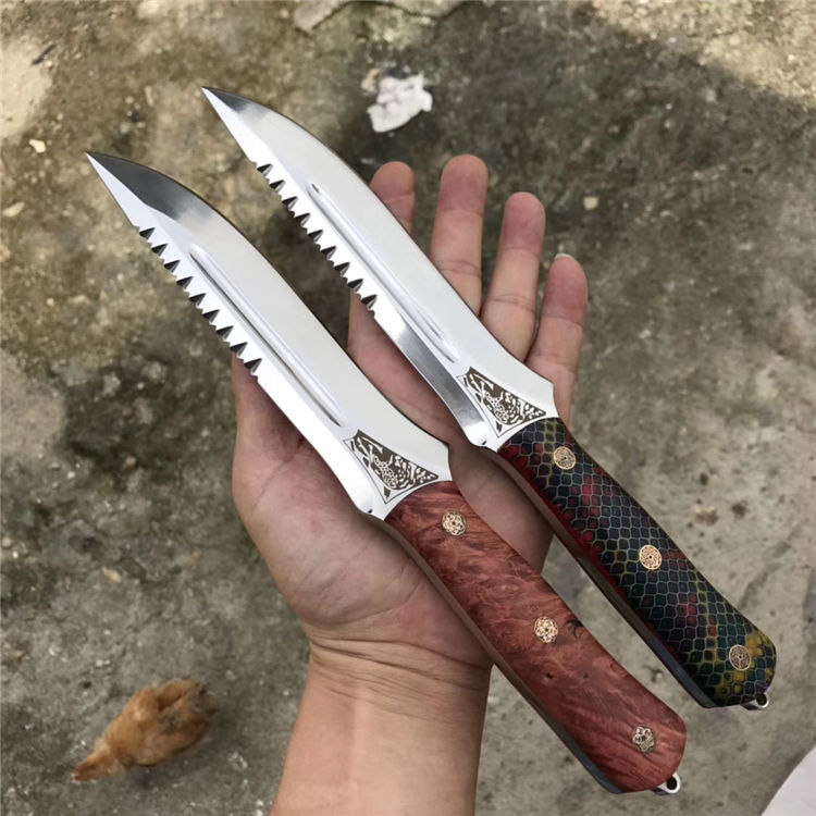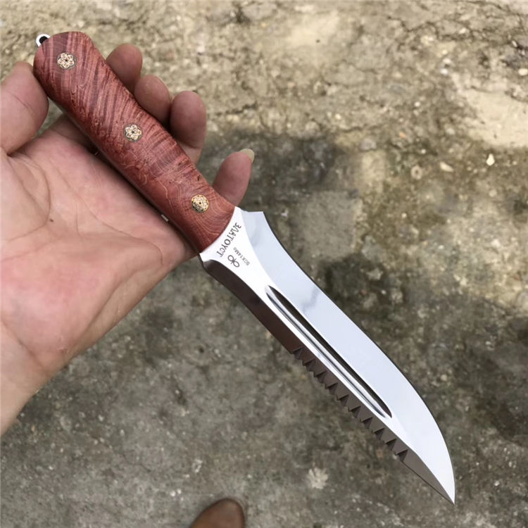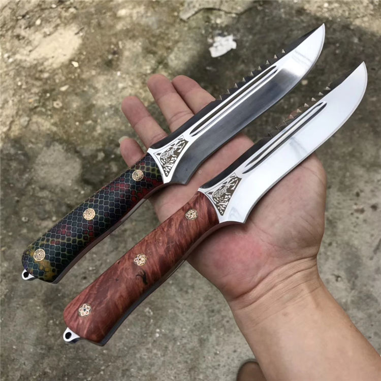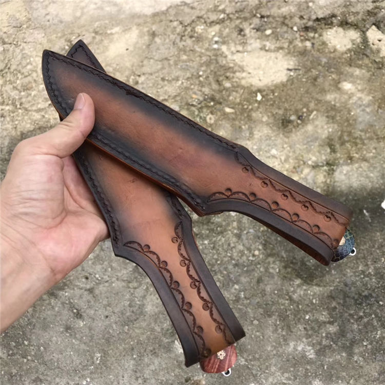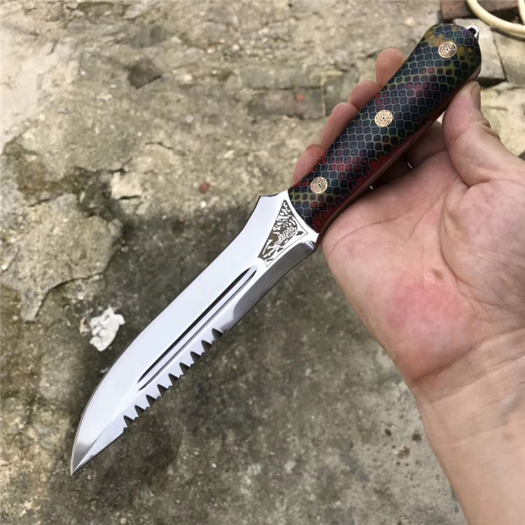 俄罗斯 A&R雪豹终极生存刀背齿,俄罗斯A&R自成立以来,坚持走高端艺术路线,生产高端国礼用刀、高档工艺品、军警及特种部队用刀。A&R的产品以精致、细腻见长,获奖众多,每一款刀的的背后都是由一名甚至几名艺术家来设计、打造。A&R公司的刀鞘摸上去比较硬,似乎对皮革进行过上蜡或者上漆处理,刀鞘边缘打磨比较光滑,外观有光泽,整体比较重