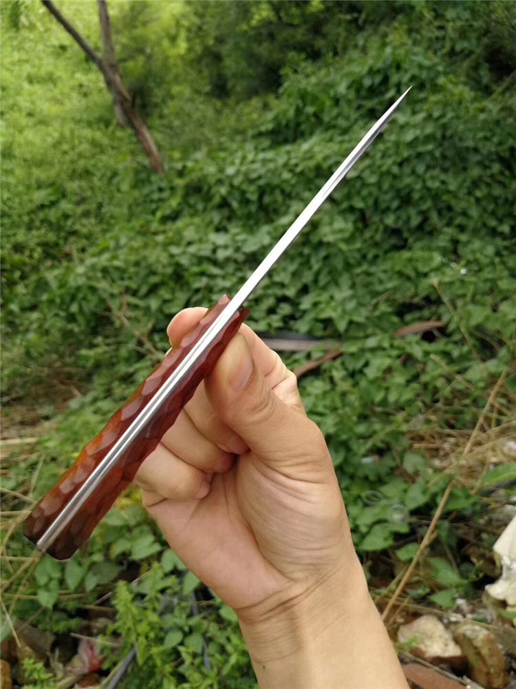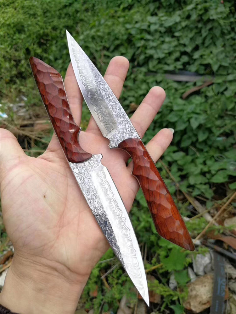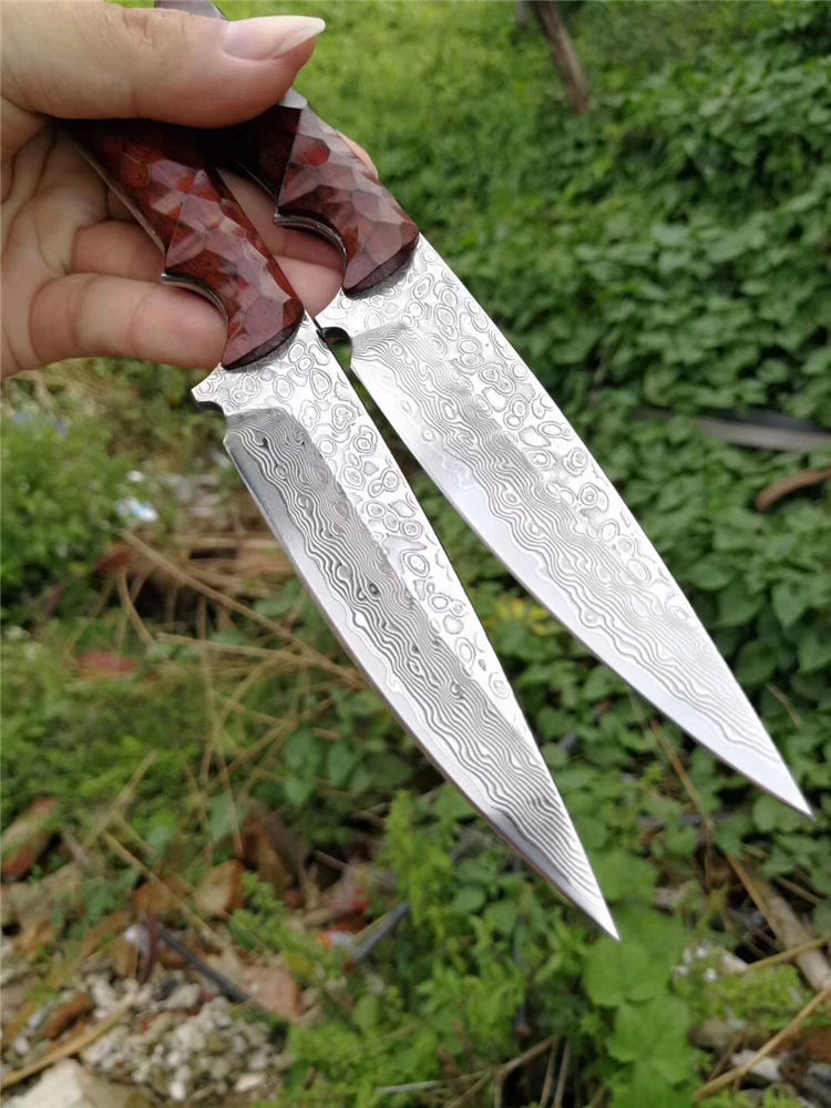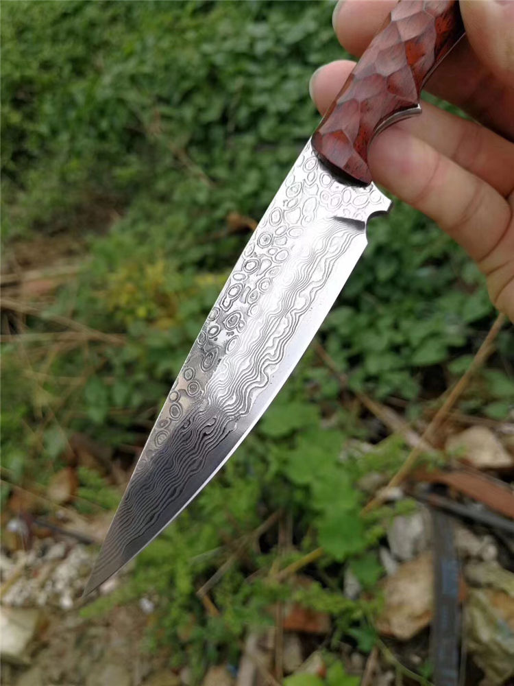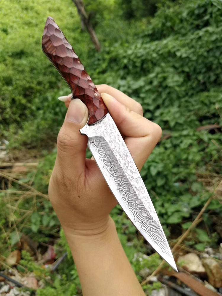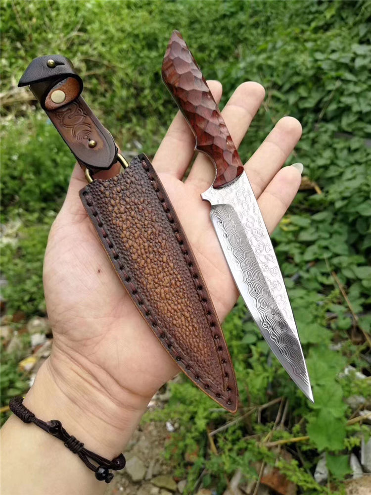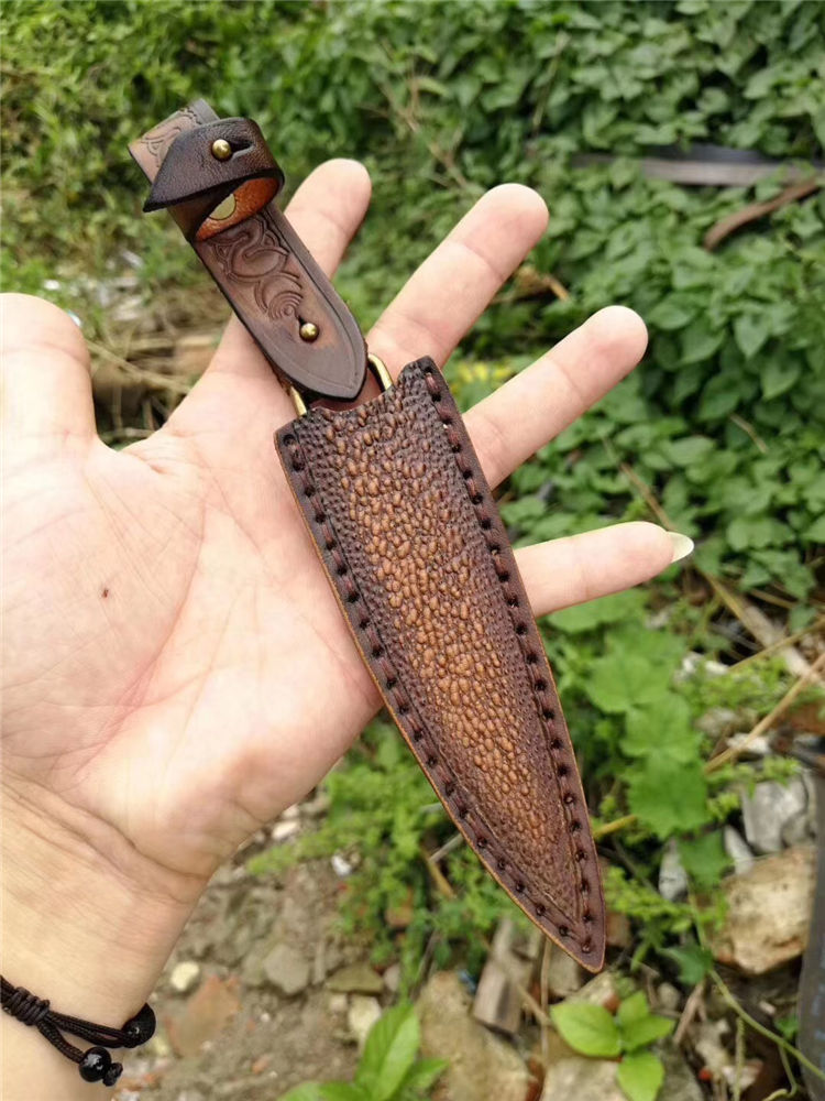 大马士革红刺鱼直刀 总长:21.5cm 刃长:11cm 手柄:10cm 厚度:3.5mm 刃宽:2.6cm 刃材:进口VG10锻造大马士革钢 柄材:微粒进口黄檀木,手工雕刻不规则纹 皮套:意大利进口植鞣牛皮雕花缝线,复古风、牛皮纸盒装