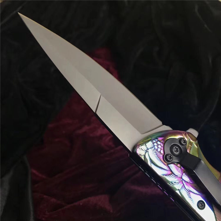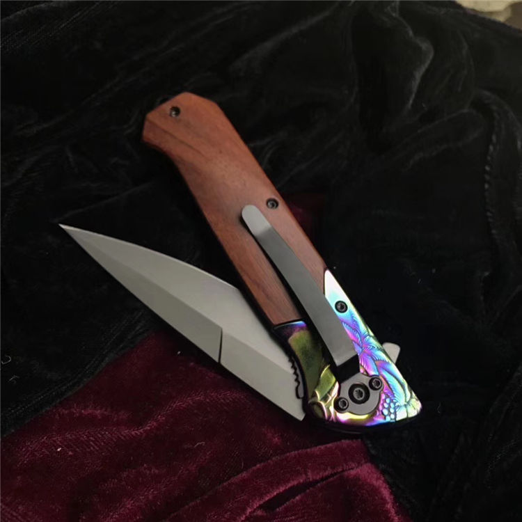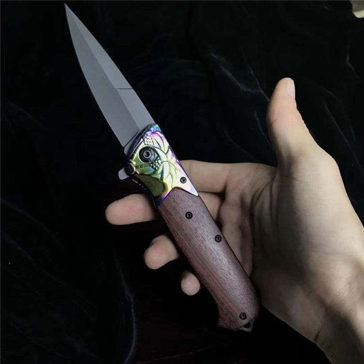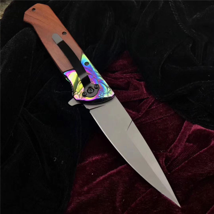 勃郎宁F125快开折刀 全长:22.5cm 刃长:9cm 柄长:13cm 刃宽:2cm 刃厚:2.5mm 刃材:3Cr13Mov 重量:200g(含包装) 硬度:56HRC 表面:拉丝 柄材:全钢镭射刻花+彩木 锁型:内衬锁 包装:纸盒